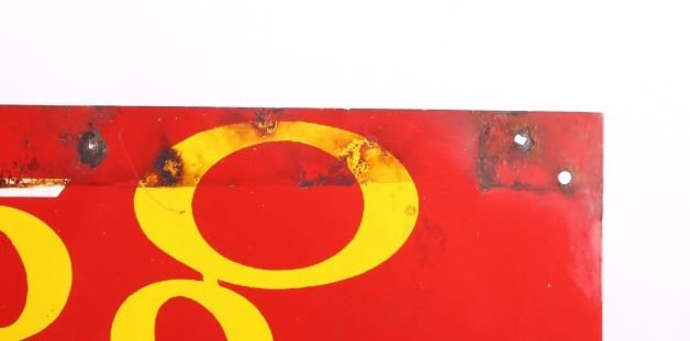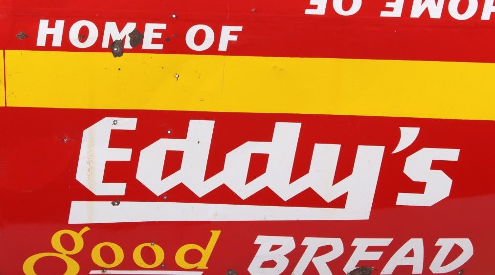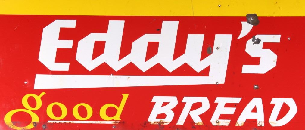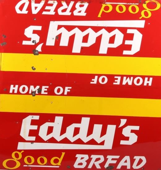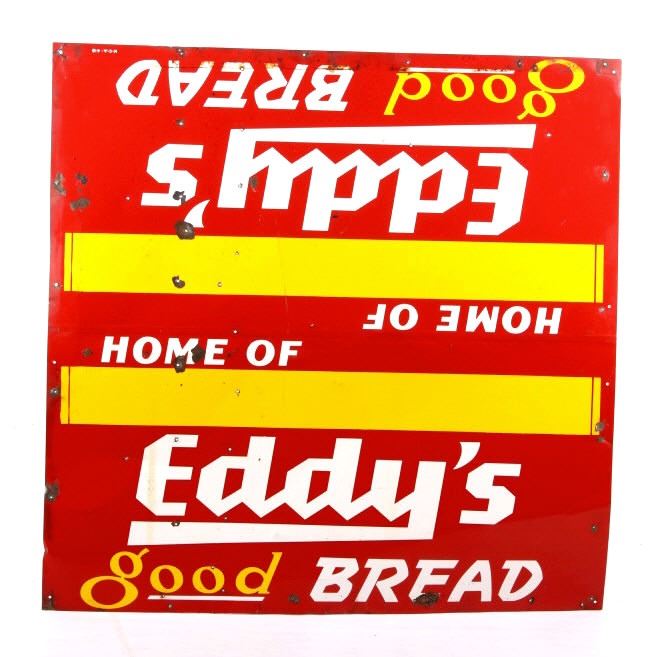 This lot features a vintage metal sign for " Home of Eddy's Good Bread". J.E. "Eddy" O'Connell has a long history of entrepreneurship with the city of Helena MT, as well as the Northwest region as a whole, with bakeries across the entire Northwest. The sign is metal and shows some rust but is in good overall condition. Measures: 27" x 27".