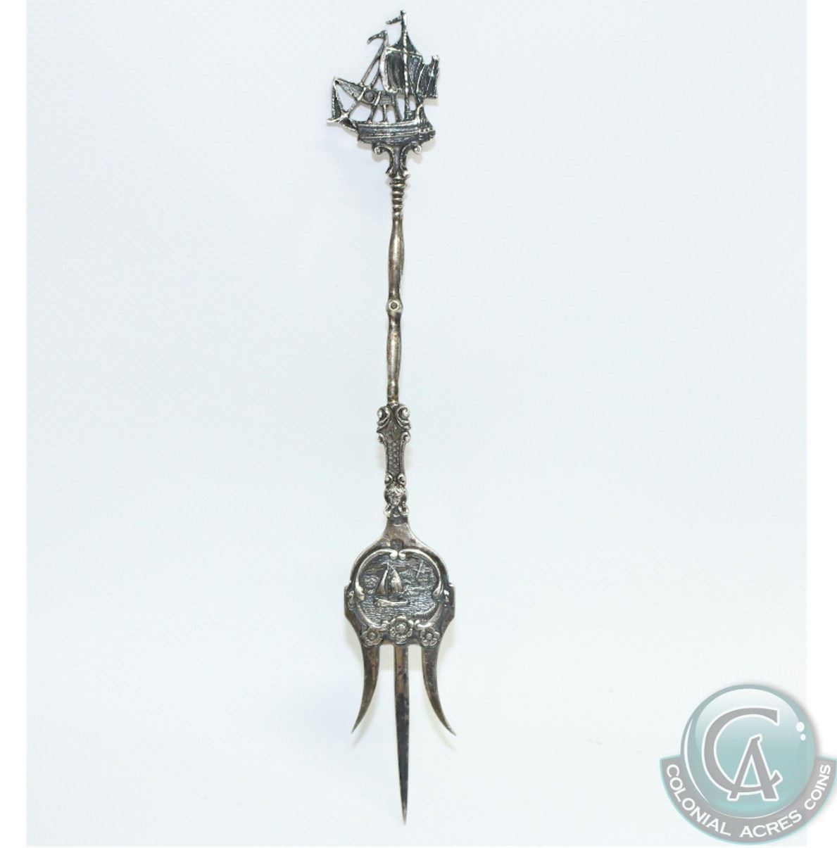 Vintage Hooijkaas Zilverfabriek Silver Mango Fork with Elaborate Ship Design. Measures 7 3/4" in length.