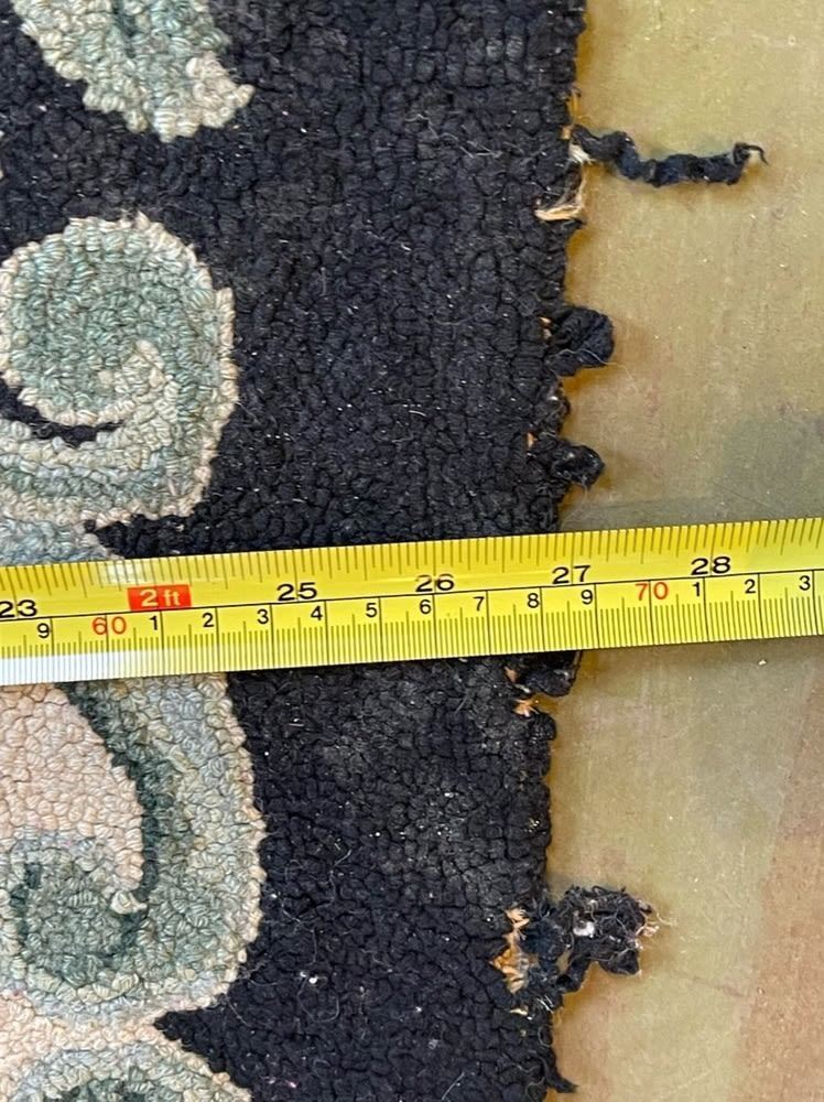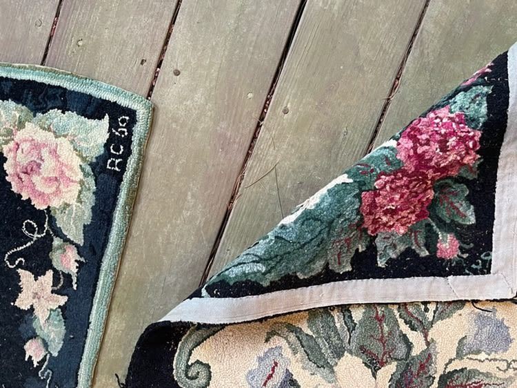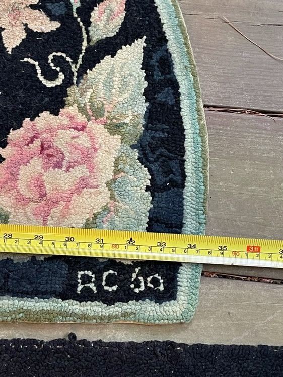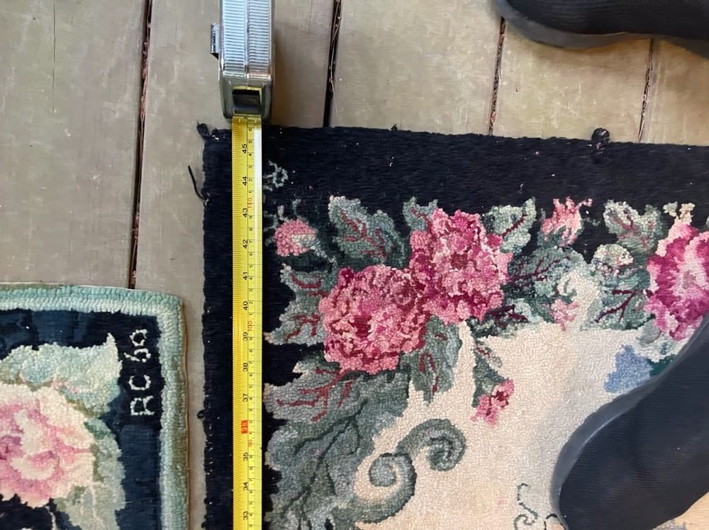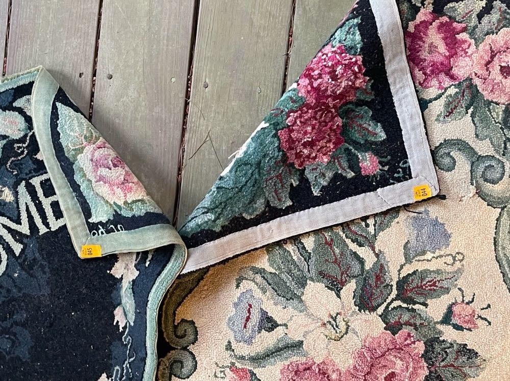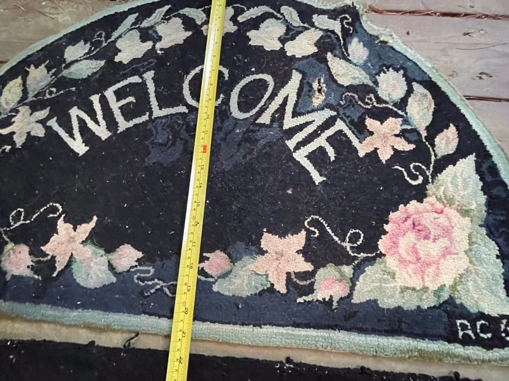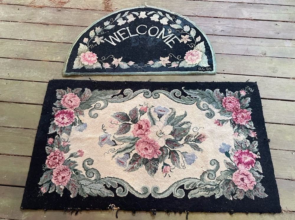 Vintage handmade hooked rugs, Welcome and floral with black backgrounds