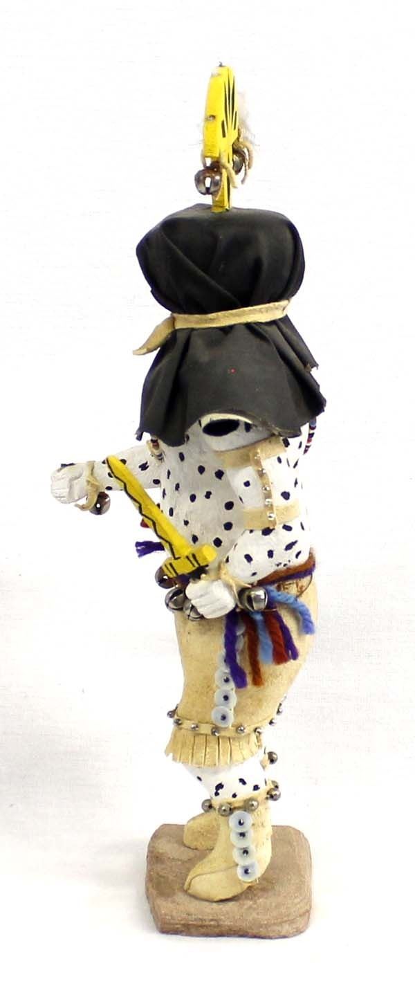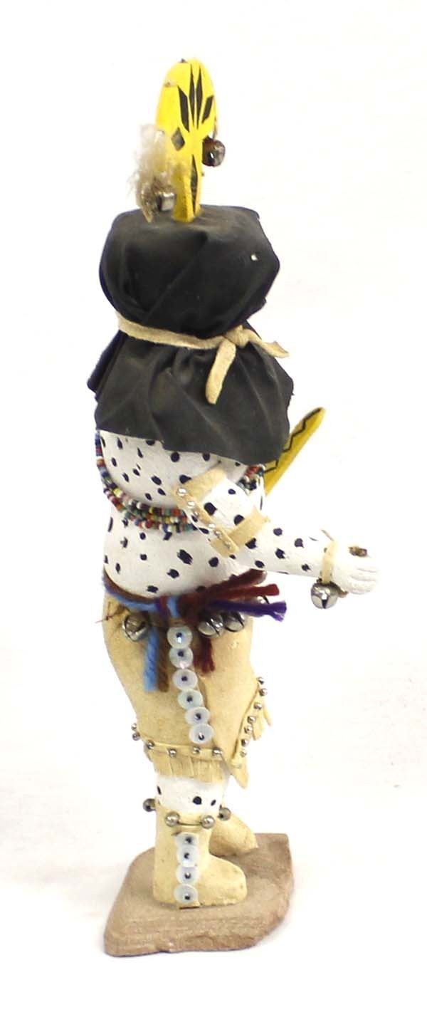 Vintage Native American Hopi ''Apache Crown Dancer'' Kachina, measures 12''H, embellished with beads, bells, leather, and feather, missing item in right hand, missing a few bells on belt, feather need to be replaced on crown