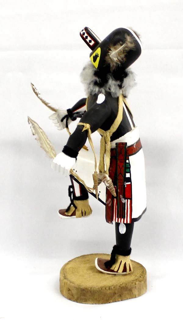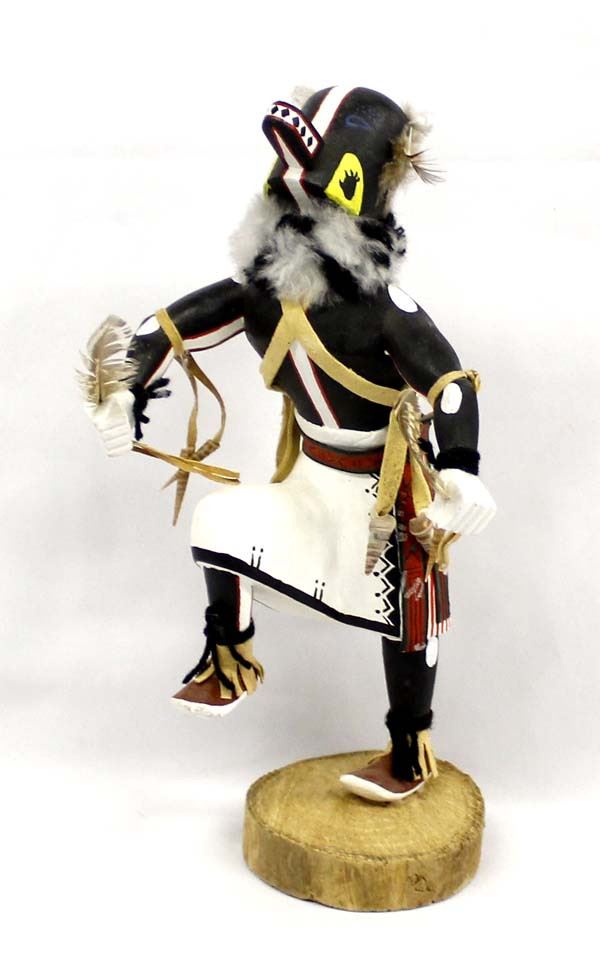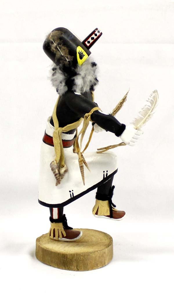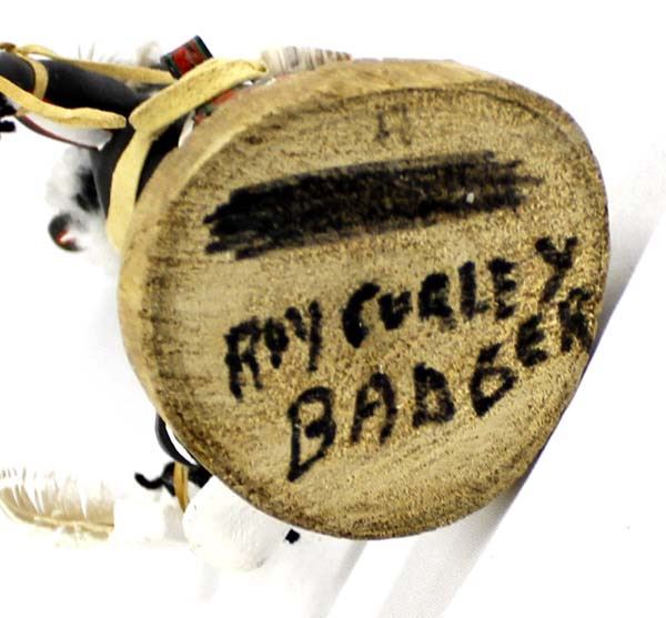 Vintage Native American Hopi Badger Kachina by Ray Curley, measures 13''H x 6''W x 6''Deep, left foot has been glued, signed by the artist, embellished with shells, leather, faux fur, yarn, and feathers