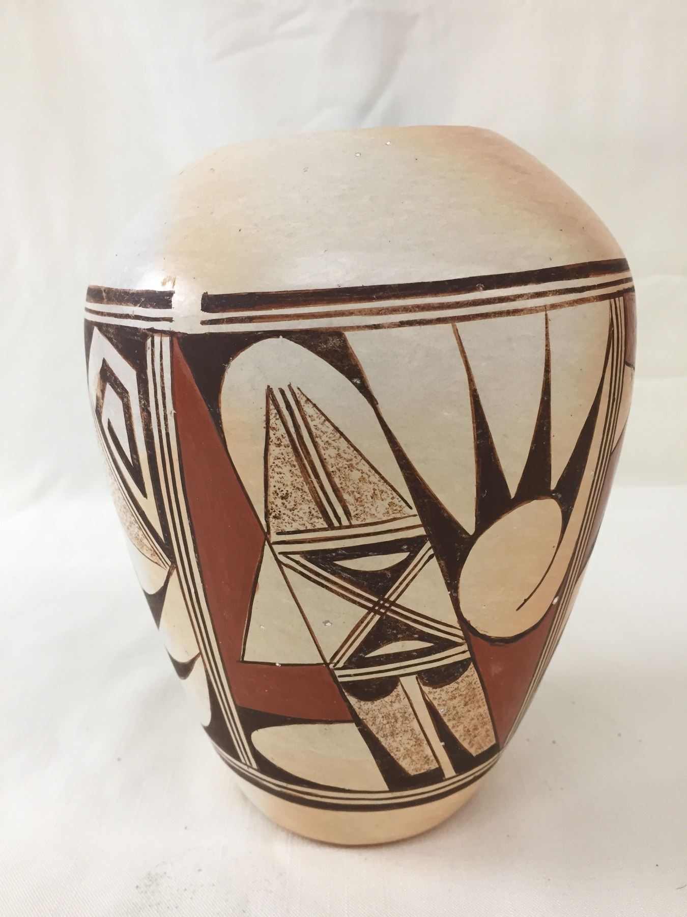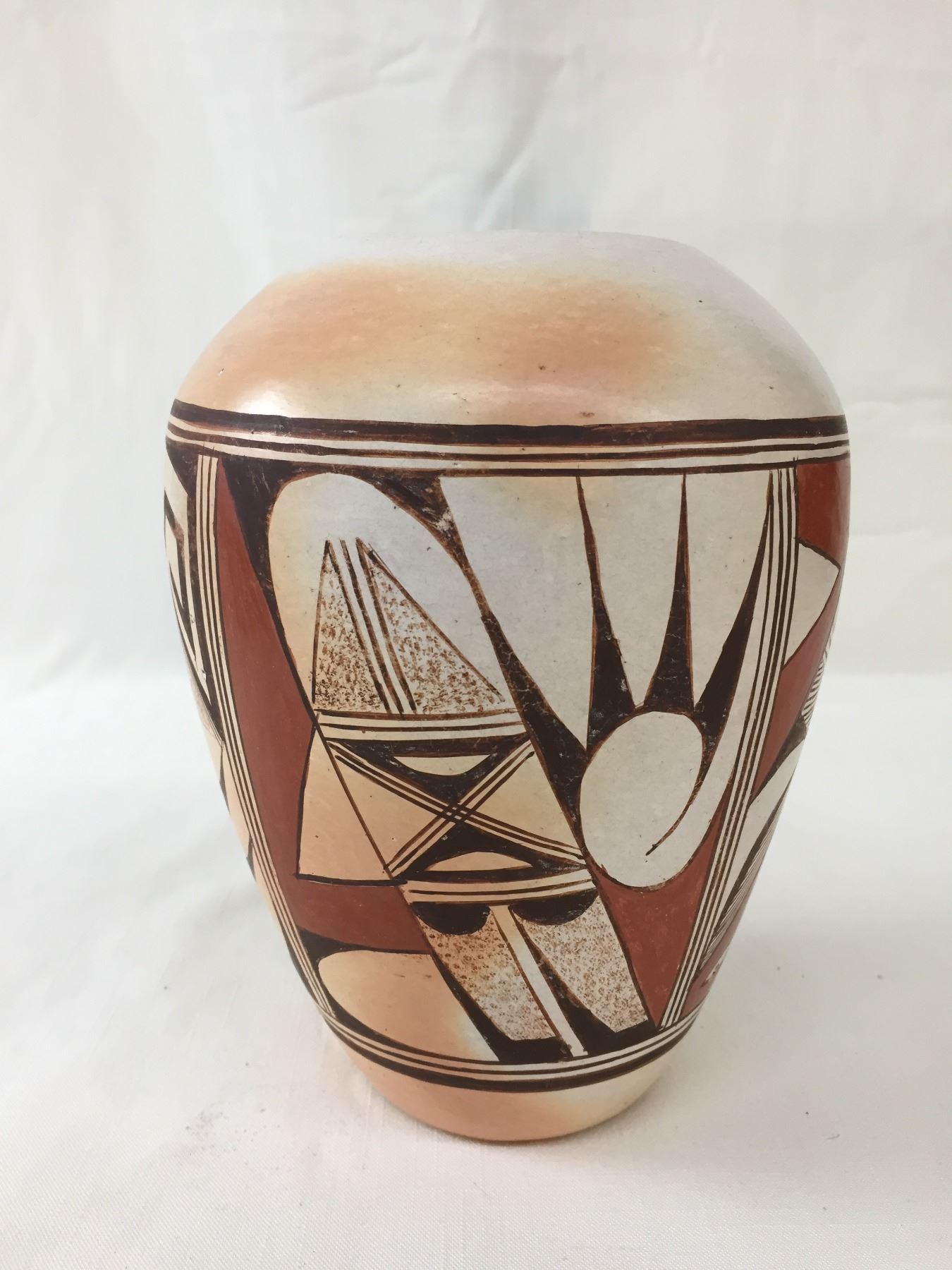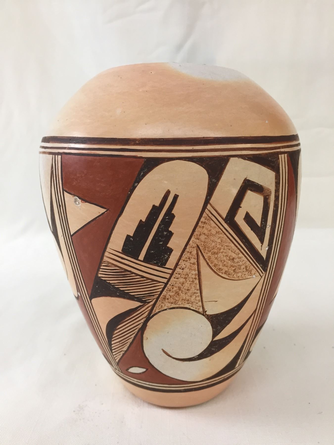 Description: Featured for sale in this lot is a vintage Hopi cylinder pot,. It is handmade, featuring hand painted abstract designs. Maker: Unknown Hopi potter. Approx. Age: Circa 1960s. Size: 5-1/2”w x 7-1/2” tall. Condition: Good for its age, normal wear expected and there is some minor pitting on the pot. Please look closely at the pictures - they are an important part of our description. Shipping: There will be a $10 handling / packaging fee for shipping this lot. The actual cost of postage will be added on top of that.