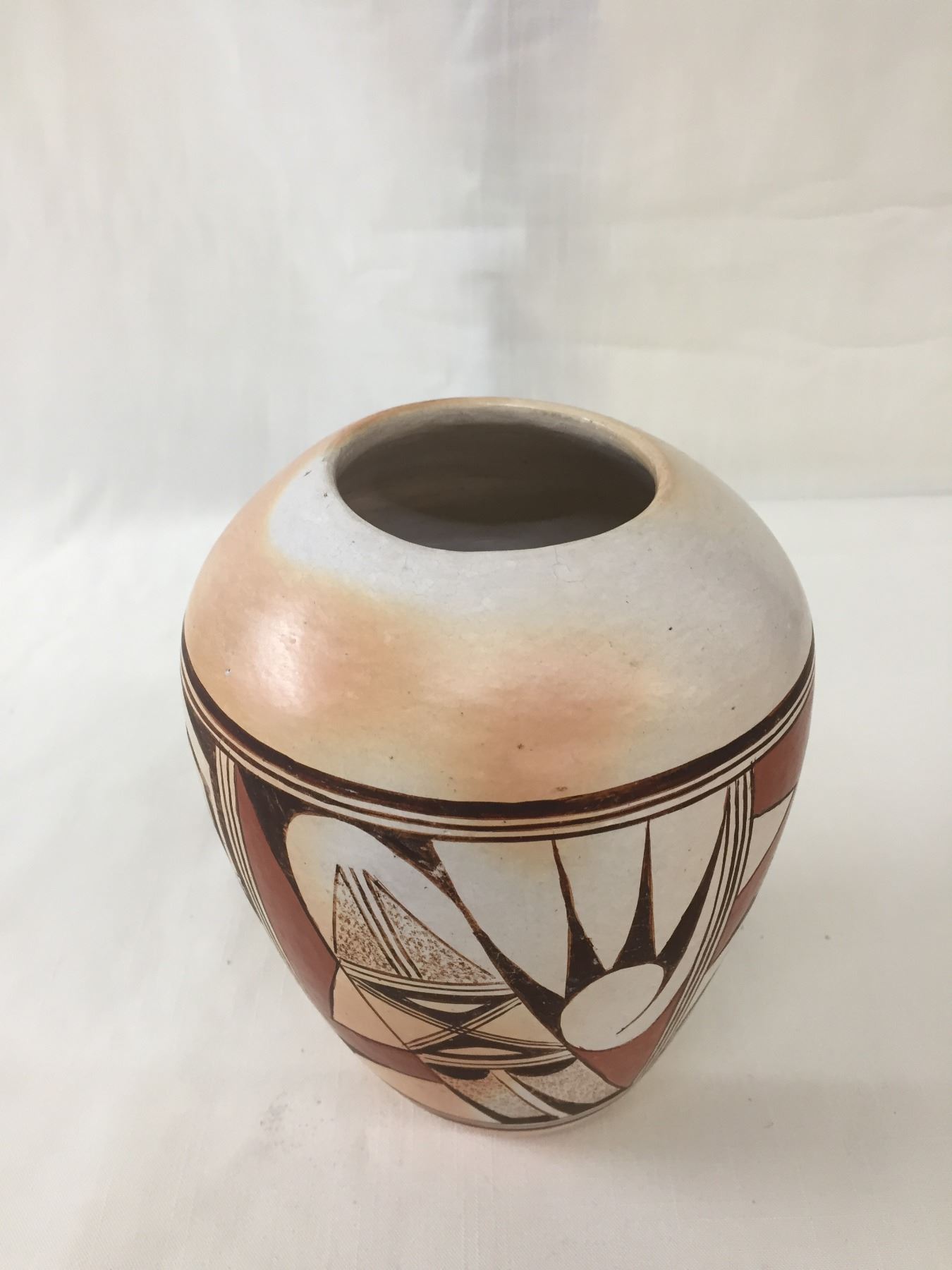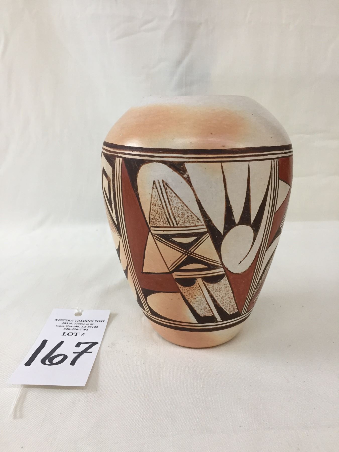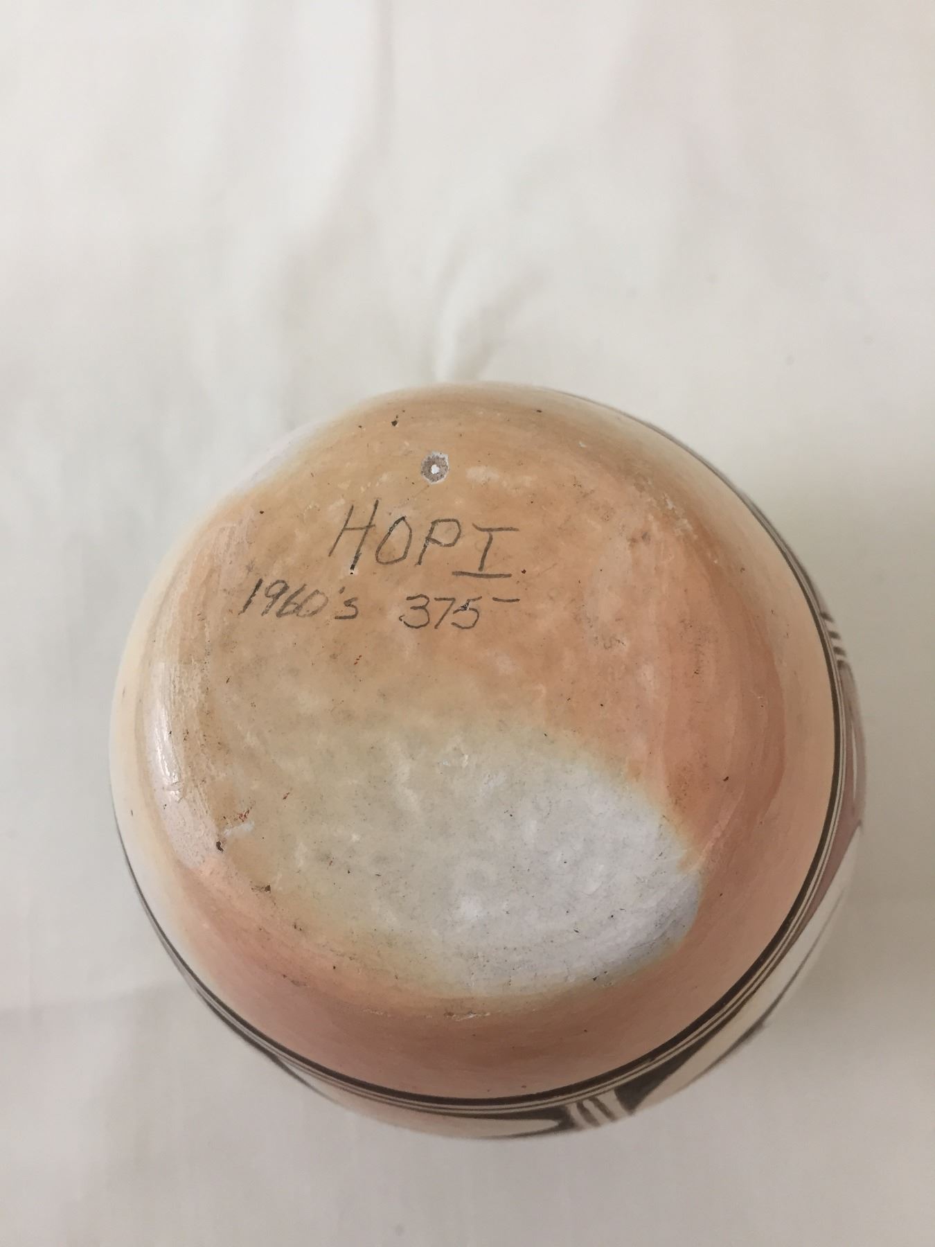 Description: Featured for sale in this lot is a vintage Hopi cylinder pot,. It is handmade, featuring hand painted abstract designs. Maker: Unknown Hopi potter. Approx. Age: Circa 1960s. Size: 5-1/2”w x 7-1/2” tall. Condition: Good for its age, normal wear expected and there is some minor pitting on the pot. Please look closely at the pictures - they are an important part of our description. Shipping: There will be a $10 handling / packaging fee for shipping this lot. The actual cost of postage will be added on top of that.