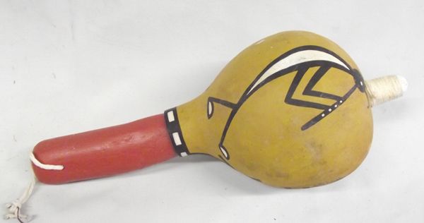 Vintage Native American Hopi Gourd Dance Rattle, brightly painted with 2 Kokopelli Flute Players and accented with black geometric lines, measures approx. 5''D x 12.5'', Kokopelli is the name popularly given to the stick-figured flute player and for Hopis, Kookopölö is a kachina god whose powers have to do with human and vegetal fertility, they associate their fertility god Kookopölö with the robber fly, a humped-back insect and a persistent copulator, and the petroglyphic flute player with the cicada (maahu), whose proboscis resembles a flute