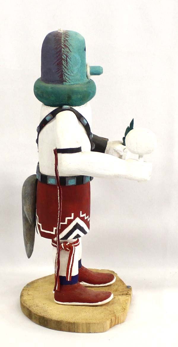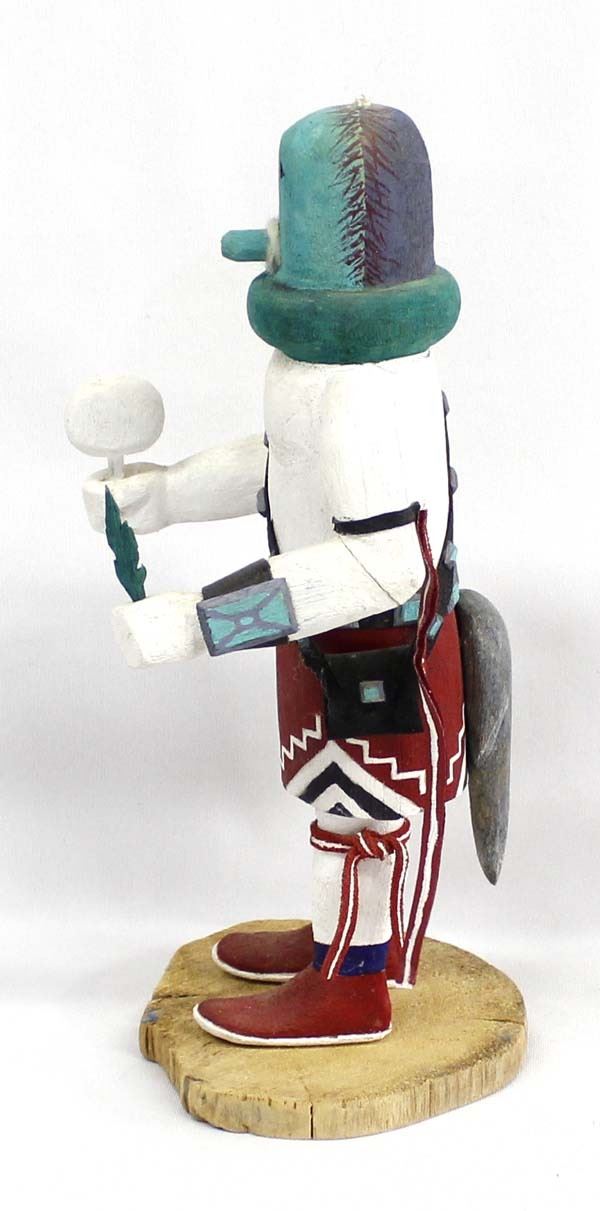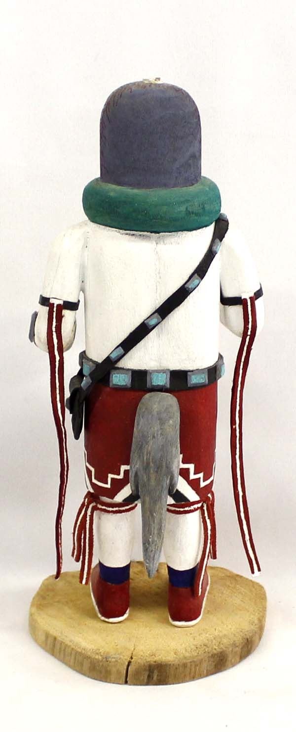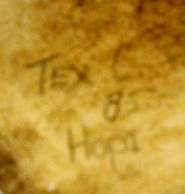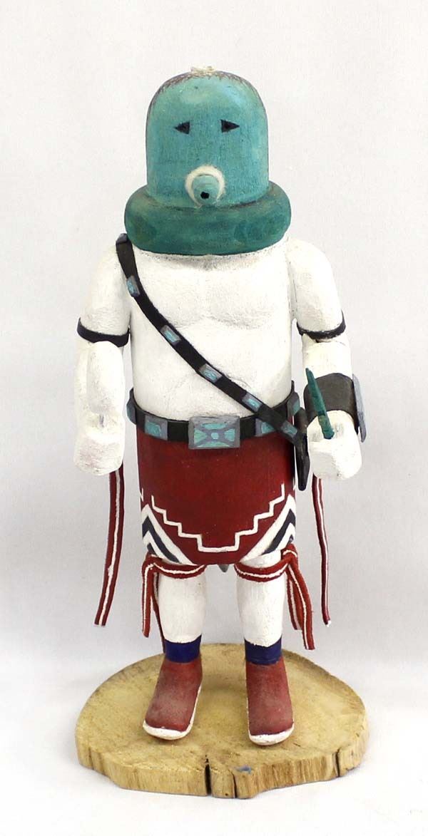 Vintage Native American Hopi Kachina by Tex C., measures 4'' x 4'' x 11'' and is signed on the bottom, missing piece on top of head, embellished with leather