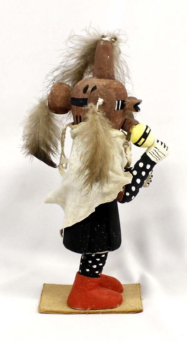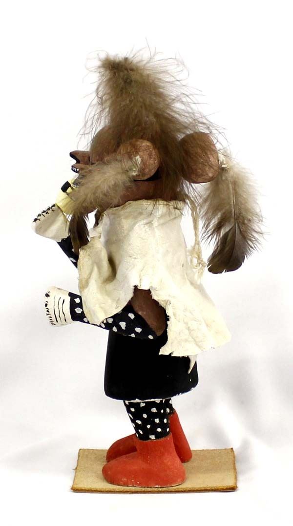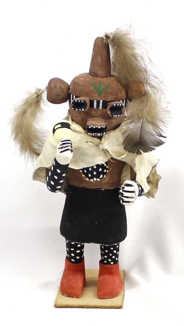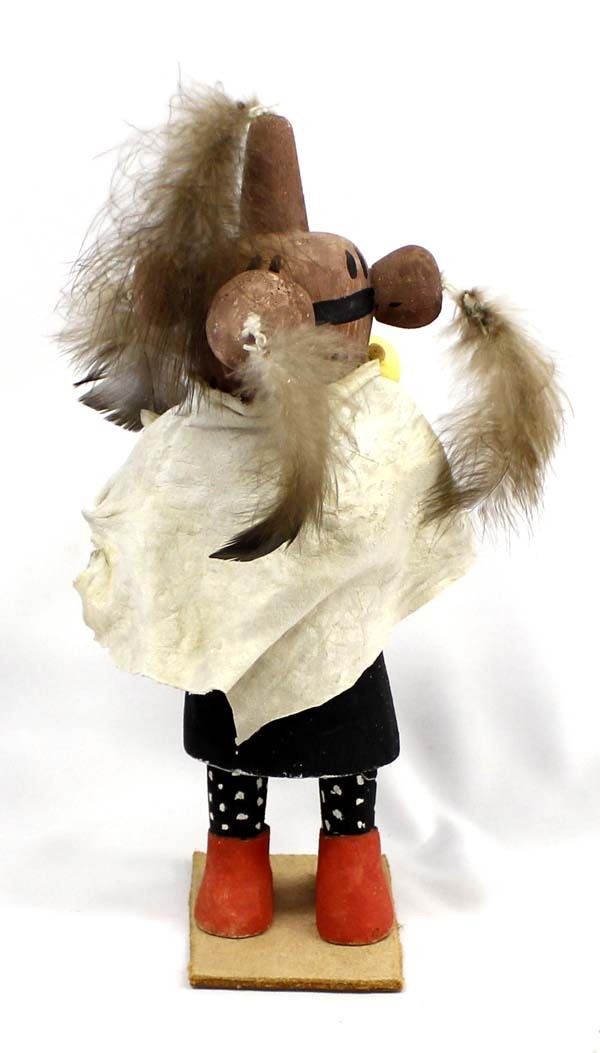 Vintage Native American Hopi Mudhead Kachina, measures 5'' x 12'' x 4'', mounted on leather base, embellished with feathers and doeskin cape
