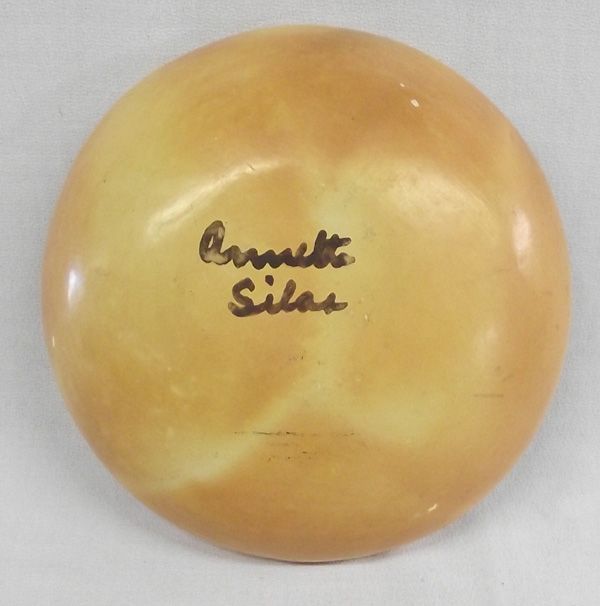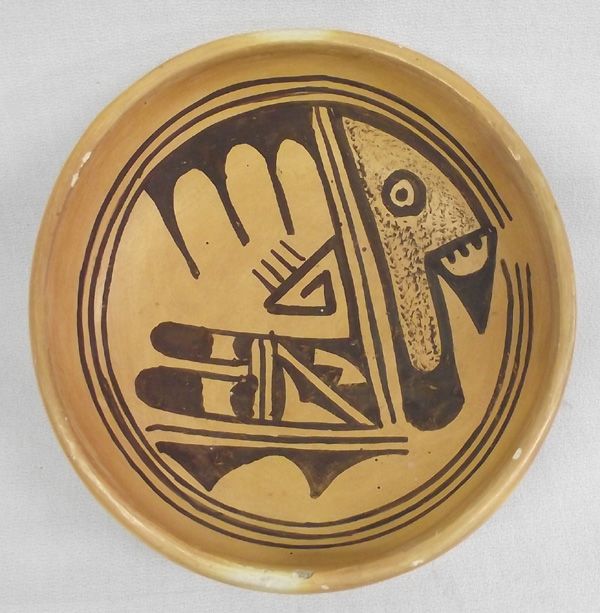 Vintage Hopi Parrot Bowl by Annette Silas measures approx. 6.75''W x 1.75''H. Crisp color. Couple of small nips on rim, nothing major.