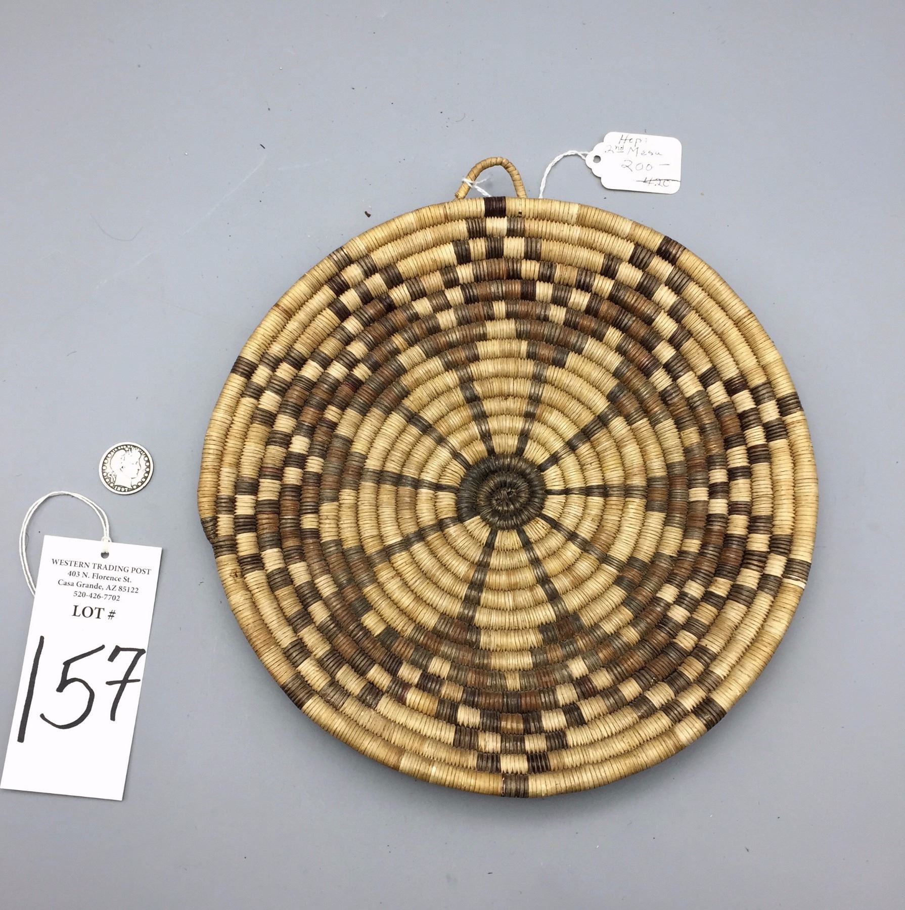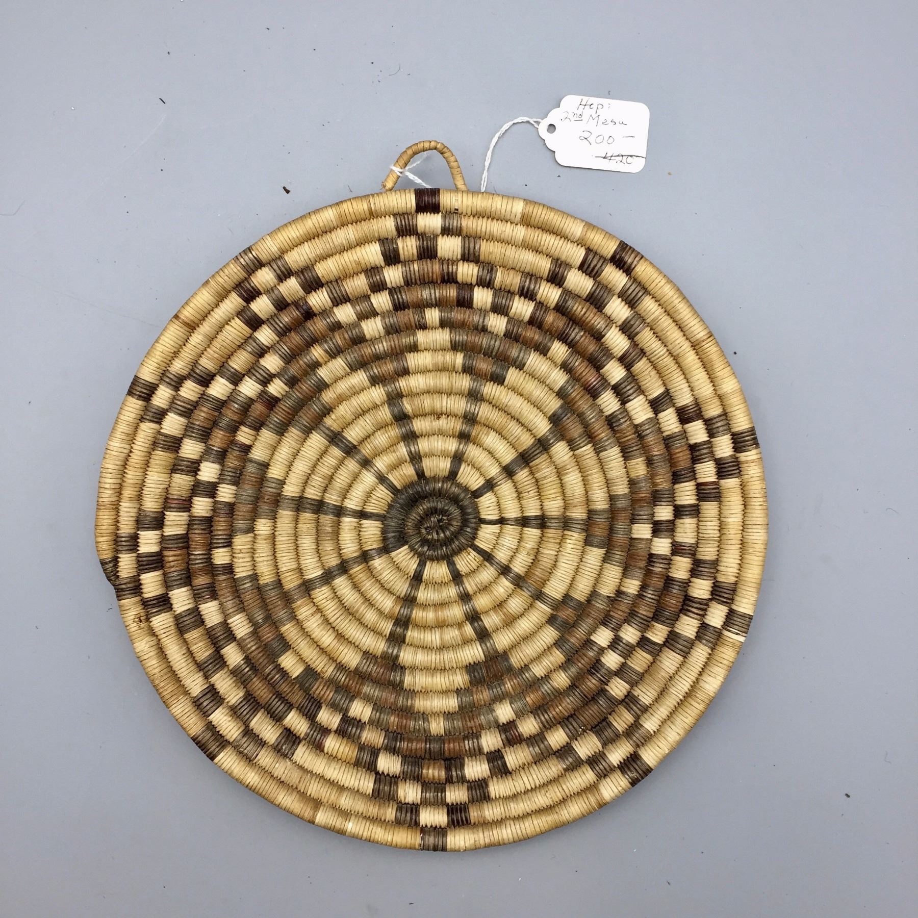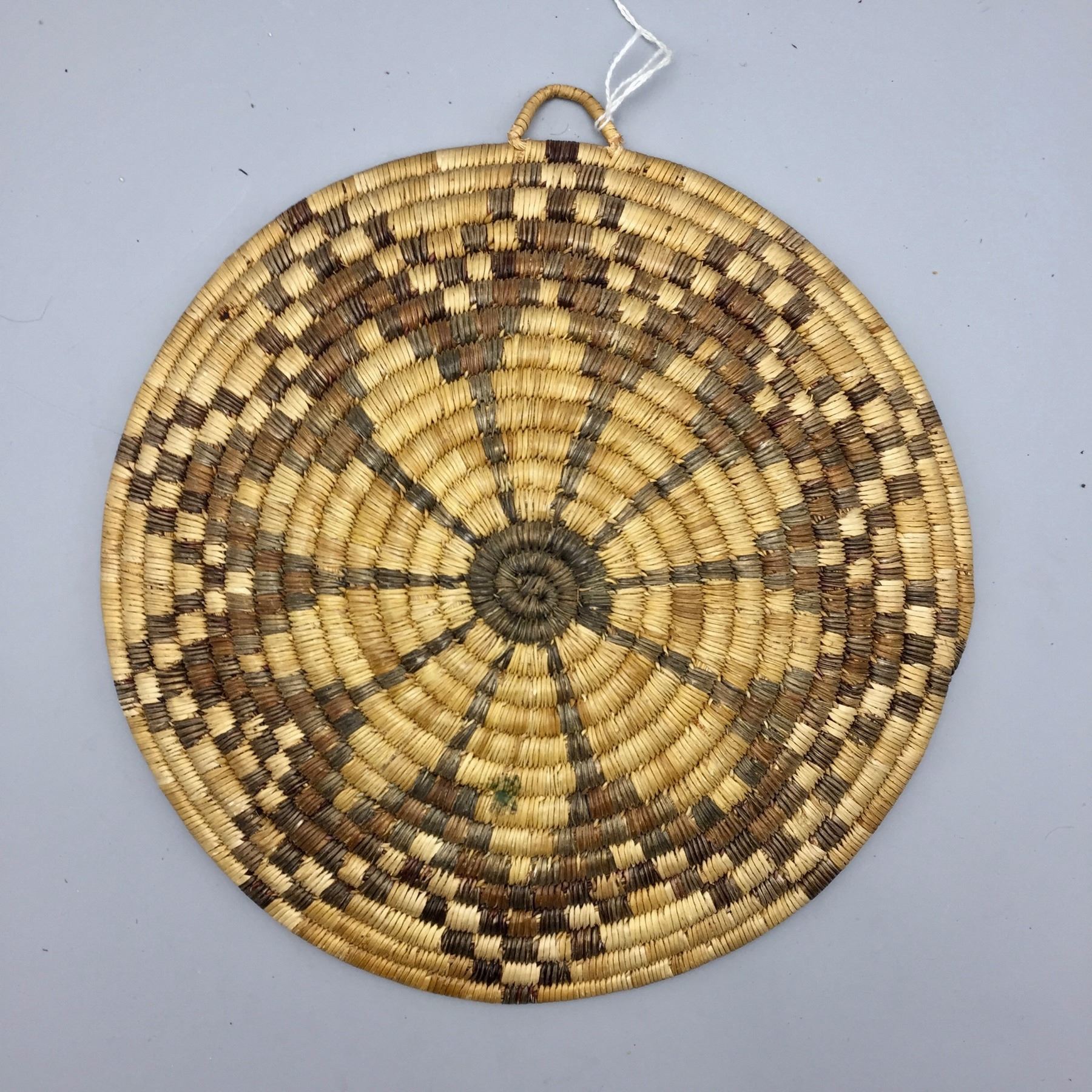 Maker: Unknown Hopi weaver. Approx. Age: Vintage. Size: Measures 10 1/4” w x 1 1/4” h. Additional Info: Vintage Hopi coiled basket/plaque with a star/flower design. Condition: Good for it’s age., normal wear and fading expected. Please look closely at the pictures - they are an important part of our description. Shipping: There will be a $5 handling / packaging fee for shipping this lot. The actual cost of postage will be added on top of that.