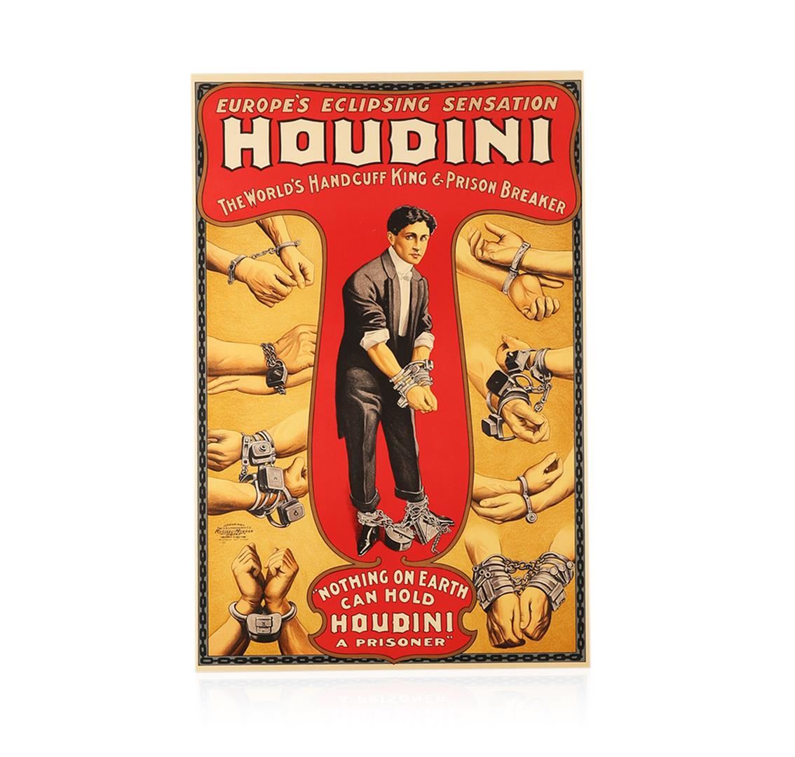 Houdini Handcuff Lithograph Vintage Advertising Poster Hand Pulled. This item is a mint condition re-created lithograph of the original poster.