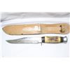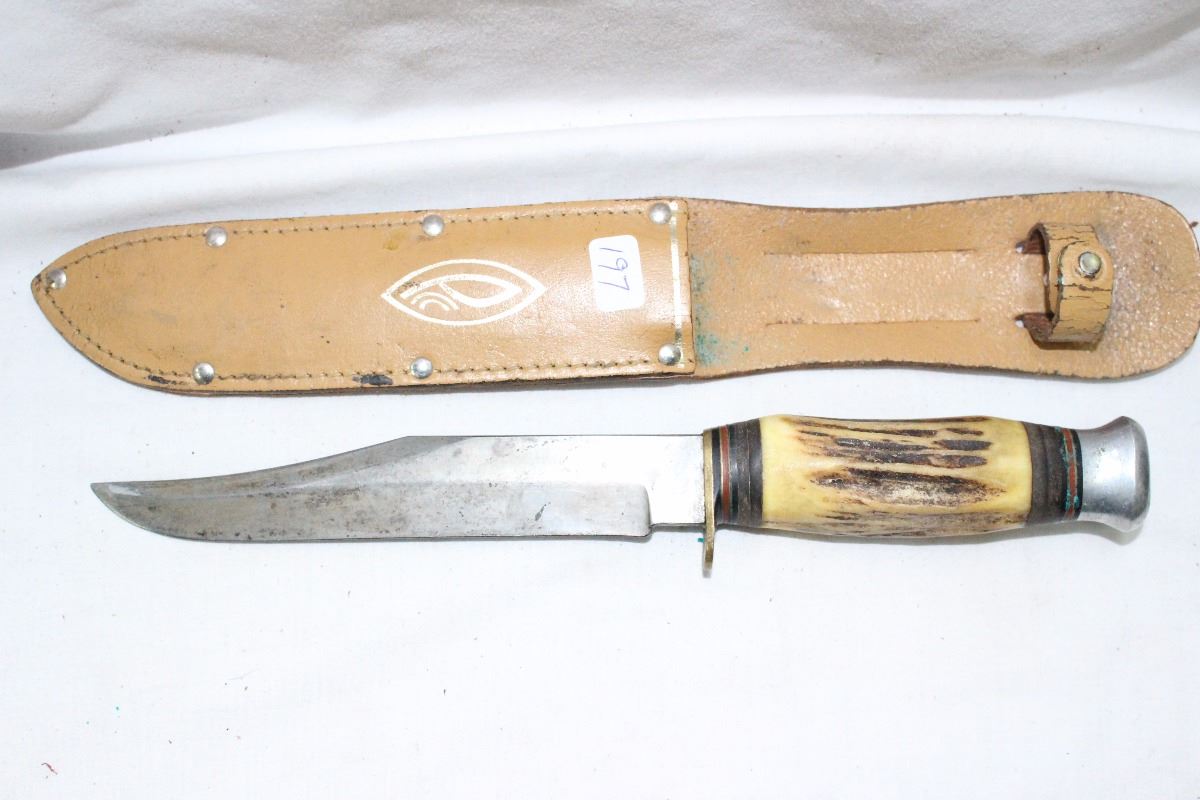 Vintage Hunting Knife with Antler Handle and Leather Sheath