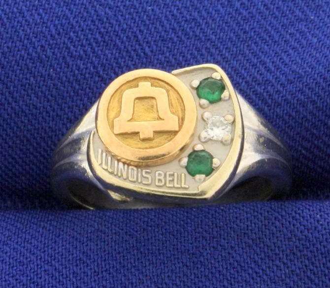 In 10k white and yellow gold, containing one .03ct diamond and two 2mm emeralds. Size 5 3/4. 4.4g.