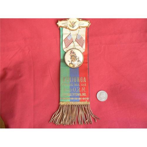 This is a wonderful piece of "lodge/order" collectable. It is wonderfully ornate and in very good condition. The front reads "Kekionga Tribe NO. 441 Imp'D O.R.M. Elizabethtown, Ind."