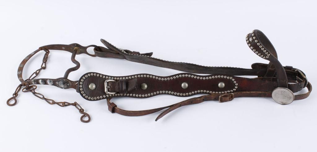 with a spotted leather bridle .Raised silver conchos purchased directly off the reservation. Shows age.