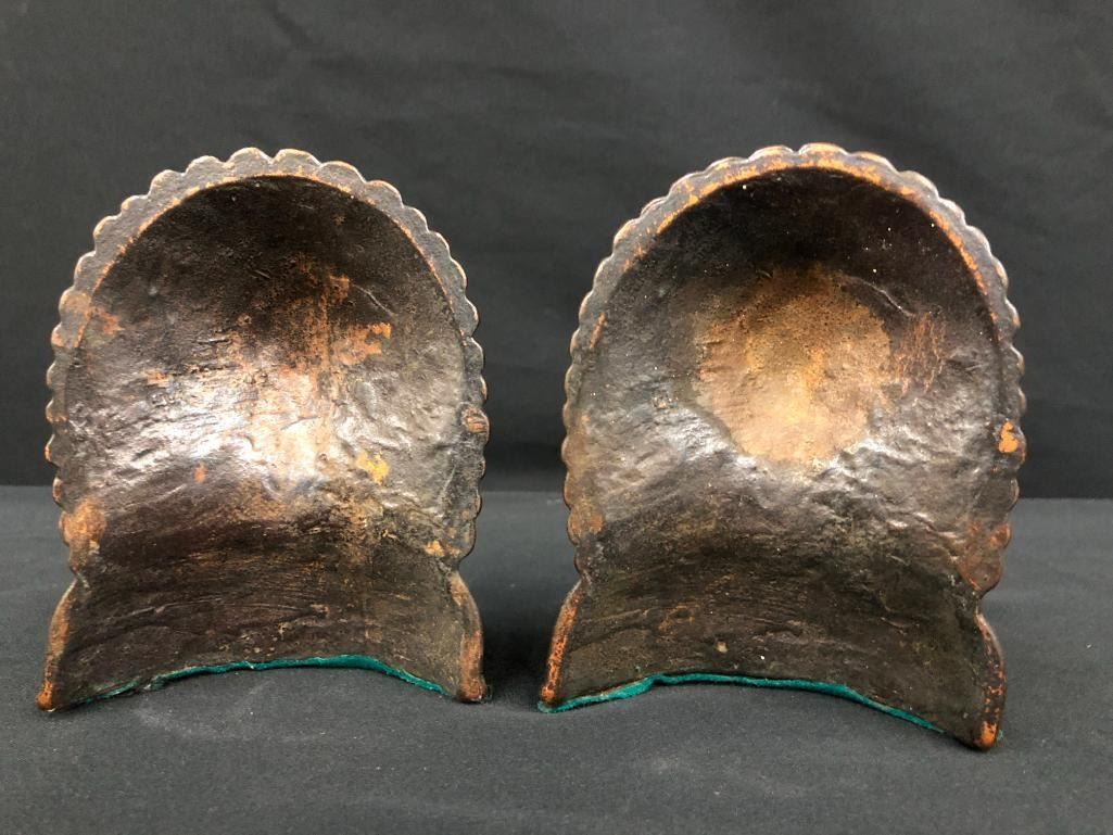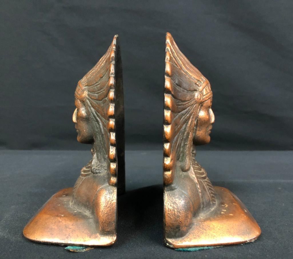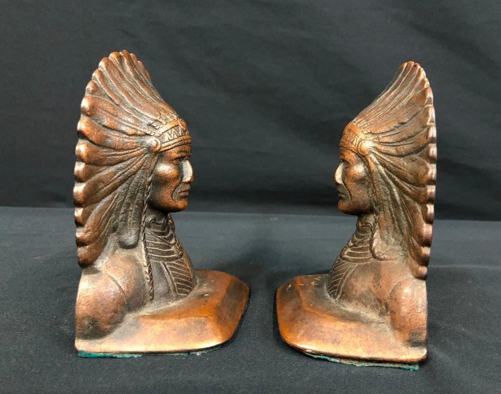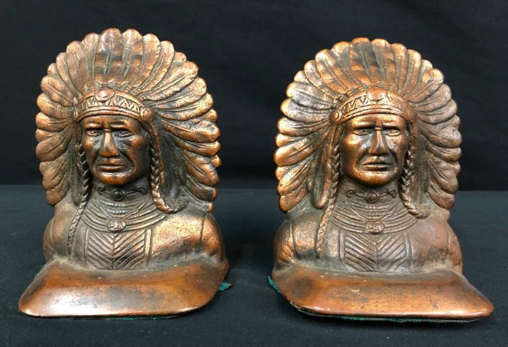 For your bidding pleasure is a pair of vintage Indian Head bronze book ends. These book ends are in great condition, showing minimal signs of wear and aging. They portray a very detailed bust of an Indian Chief in a war bonnet with necklaces, a breastplate and braided hair. There is a nice patina to the bronze. A nice addition for your collection! MAKER: Unmarked. APPROX AGE: Vintage. SIZE: 4-3/4 inches wide x 6 inches tall. CONDITION: Good for their age, normal wear expected. Please look closely at the pictures as they are an important part of our description and are hereby incorporated into the description, specifically with regards to condition. SHIPPING: There will be a $8 handling / packaging fee for shipping this lot. The actual cost of postage will be added on top of that. BUY IT NOW: If you would like to buy this item now, without waiting for the auction day to bid on it, we do offer this option (which is available up to 48 hours before the actual auction starts). The “Buy it Now†price is the high estimate of this lot (plus applicable fees and the Buyer's premium is discounted to 10% when using the Buy it Now option). If you would like to exercise this option, you must contact us by email (or phone as long as you talk to someone live). Reference this lot number and your intention to "Buy it Now."