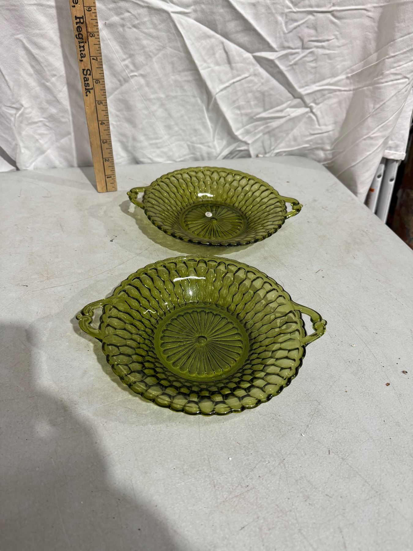 Vintage Indianglass honeycomb style avacado two handled dishes