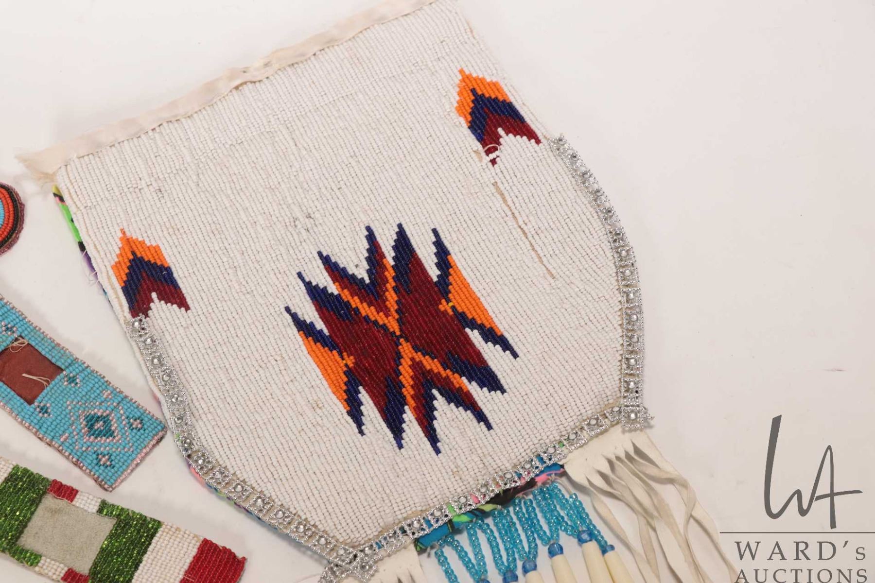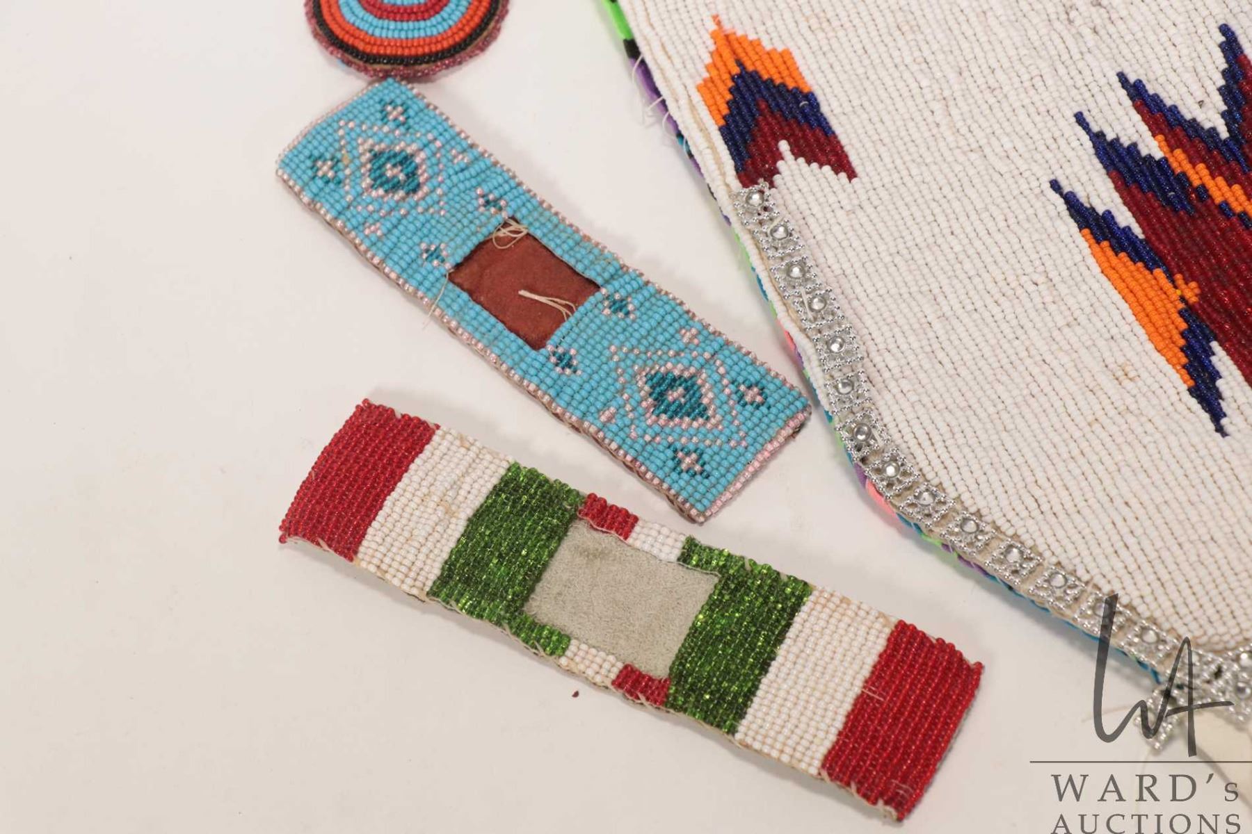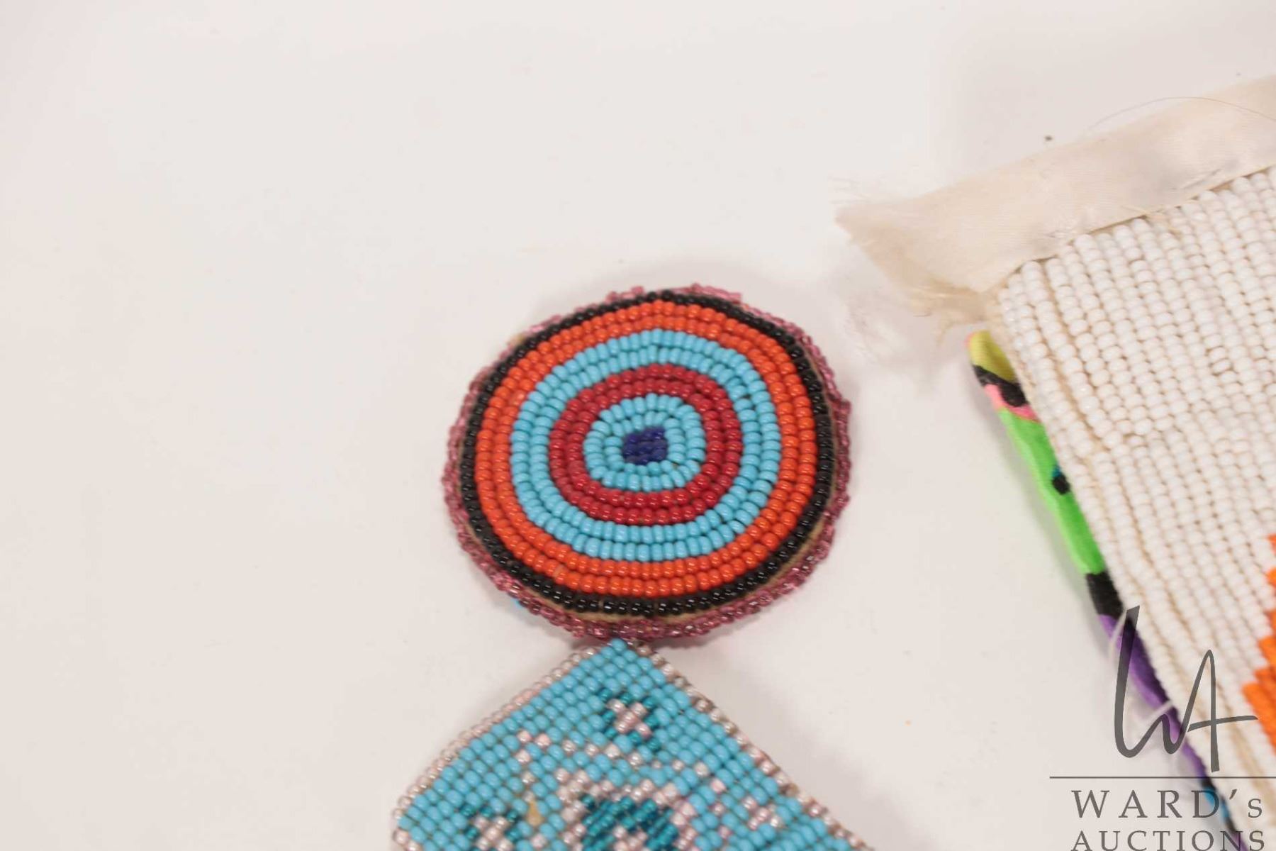 Vintage Indigenous beadwork panel/ pouch, two small straps and a 2" round beadwork patch