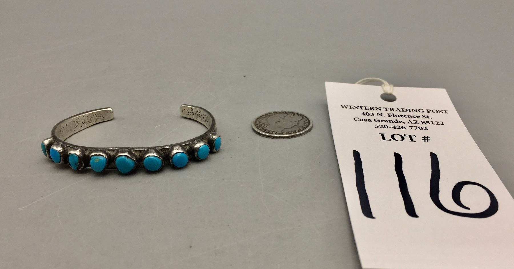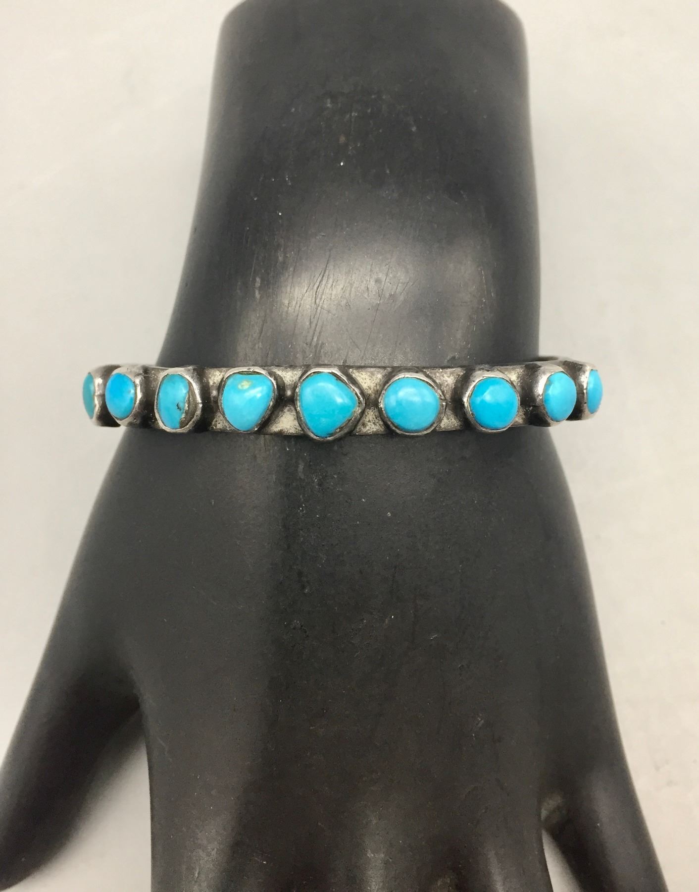 Description: For sale in this lot is a vintage, ingot bracelet featuring nine turquoise cabochons and hand stamped silver. Maker: Hallmarked, but exact maker unknown. Approx. Age: Circa mid-century. Size: Measures 4-7/8” with a 1” opening (fits a 5-7/8” wrist). Measures 1/4” at widest point. Weighs 232.8 grams. Condition: Good for its age, normal wear expected. Please look closely at the pictures - they are an important part of our description. Shipping: There will be a $5 handling / packaging fee for shipping this lot. The actual cost of postage will be added on top of that.