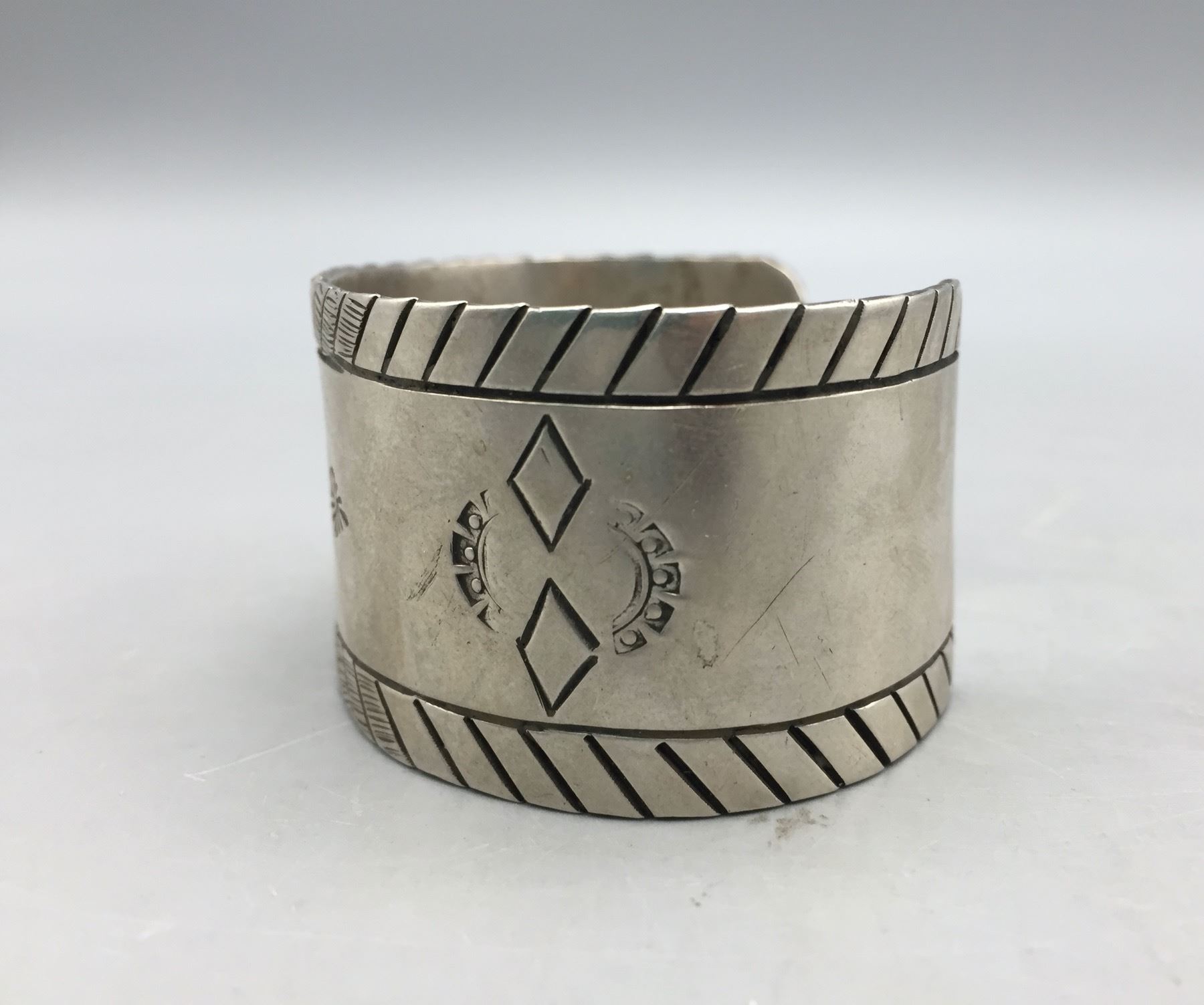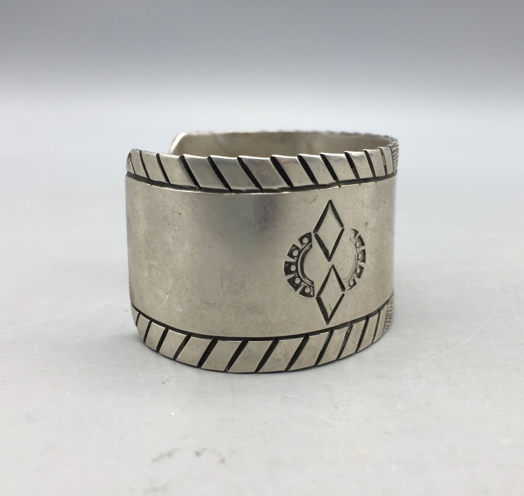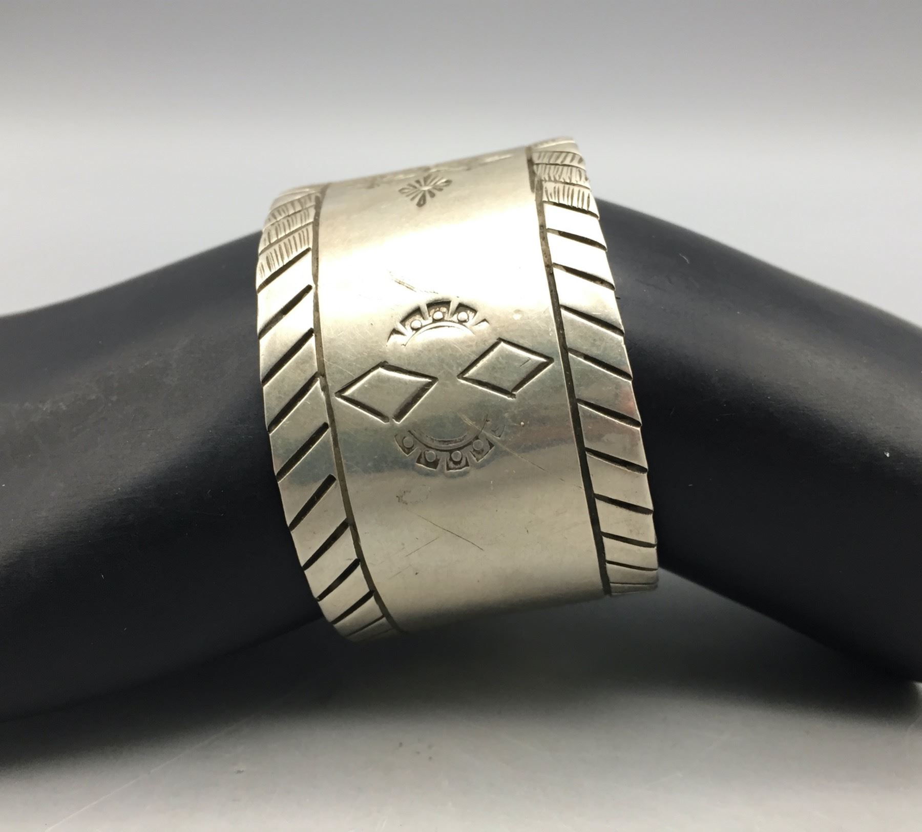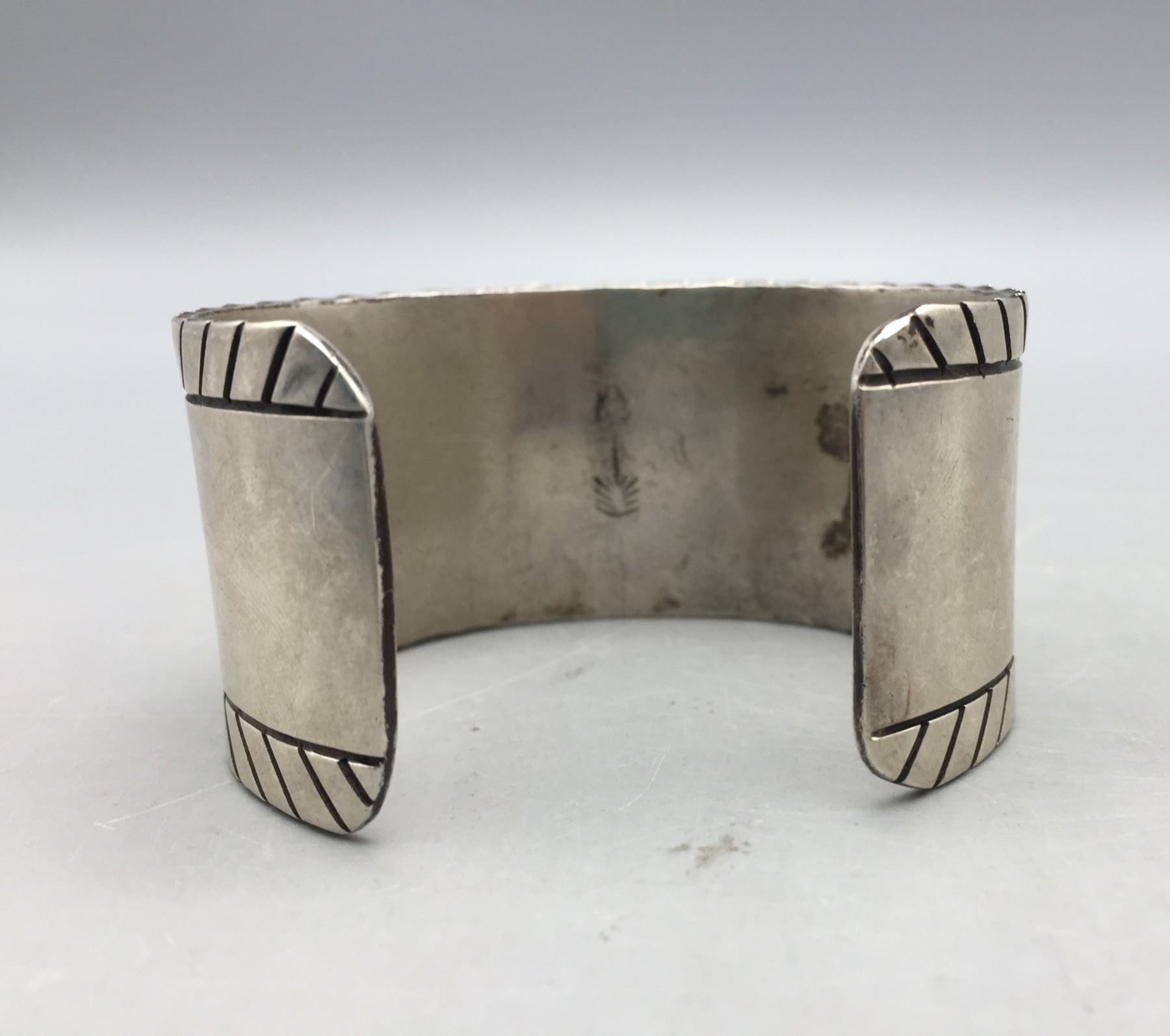 Description: Offered for sale in this lot is a nice vintage ingot bracelet. It has a nice stamped design in the sterling silver, with a nicely weighted feel. Maker: Hallmarked with a yucca plant. Approx. Age: Vintage. Size: Inside circumference measures 5-3/8†long, opening is additional 1-1/8â€, fitting a 5-3/4†wrist. Width is 1-1/4â€. Weighs 73.3 grams. Condition: Good for its age, normal wear expected. Please look closely at the pictures - they are an important part of our description. Shipping: There will be a $5 handling / packaging fee for shipping this lot. The actual cost of postage will be added on top of that.