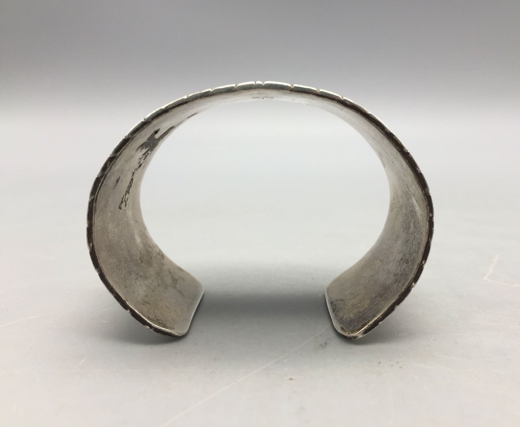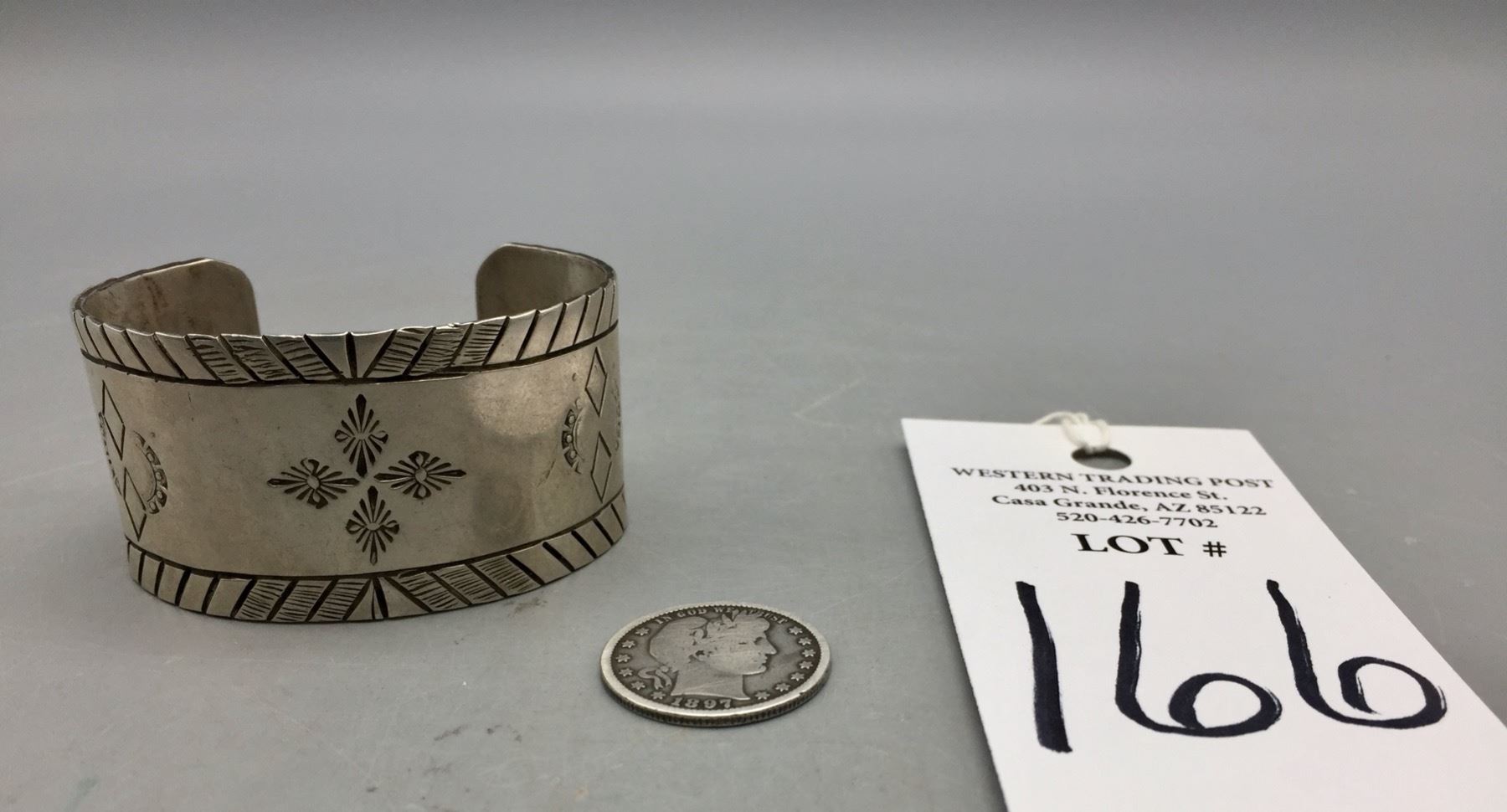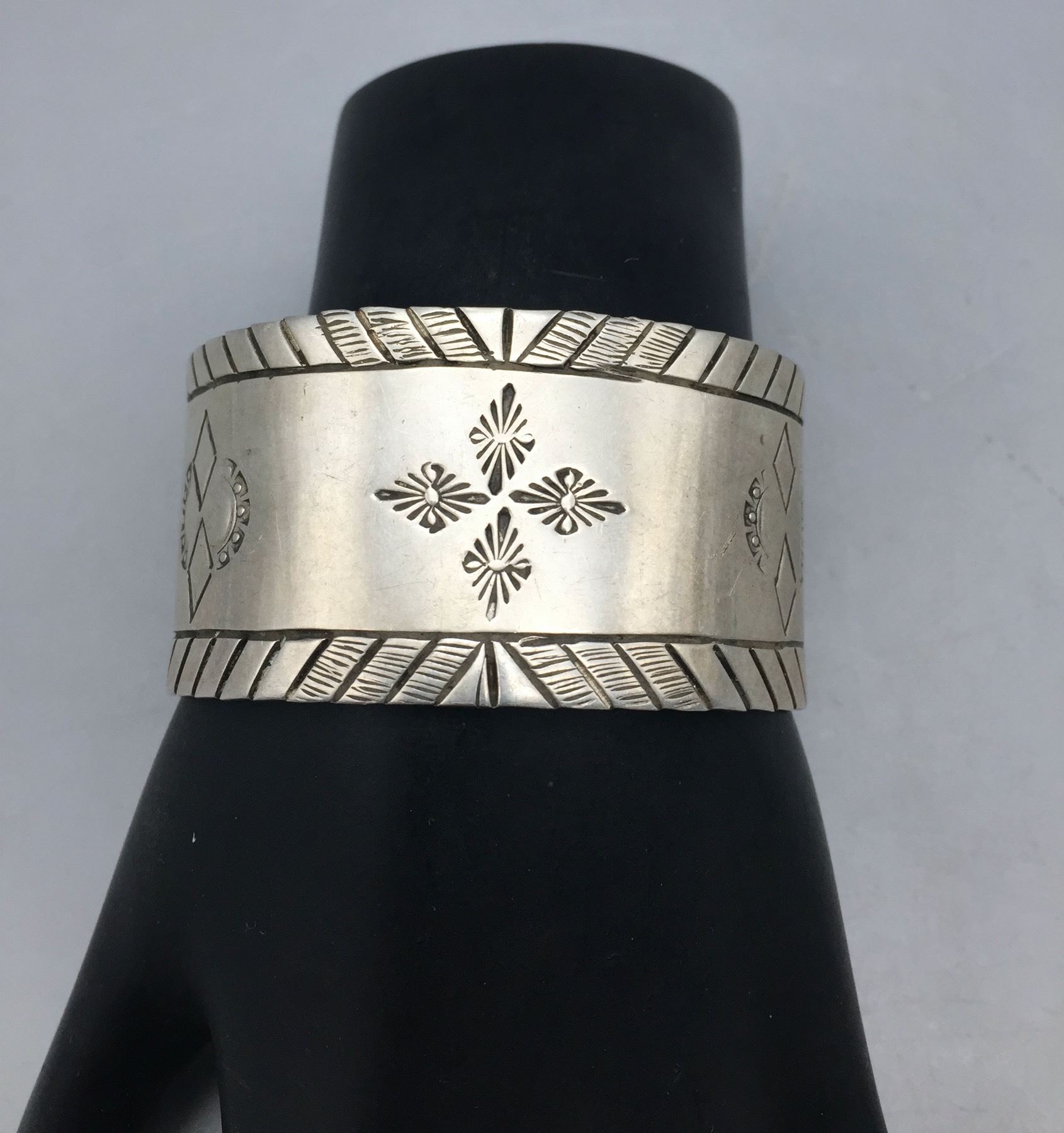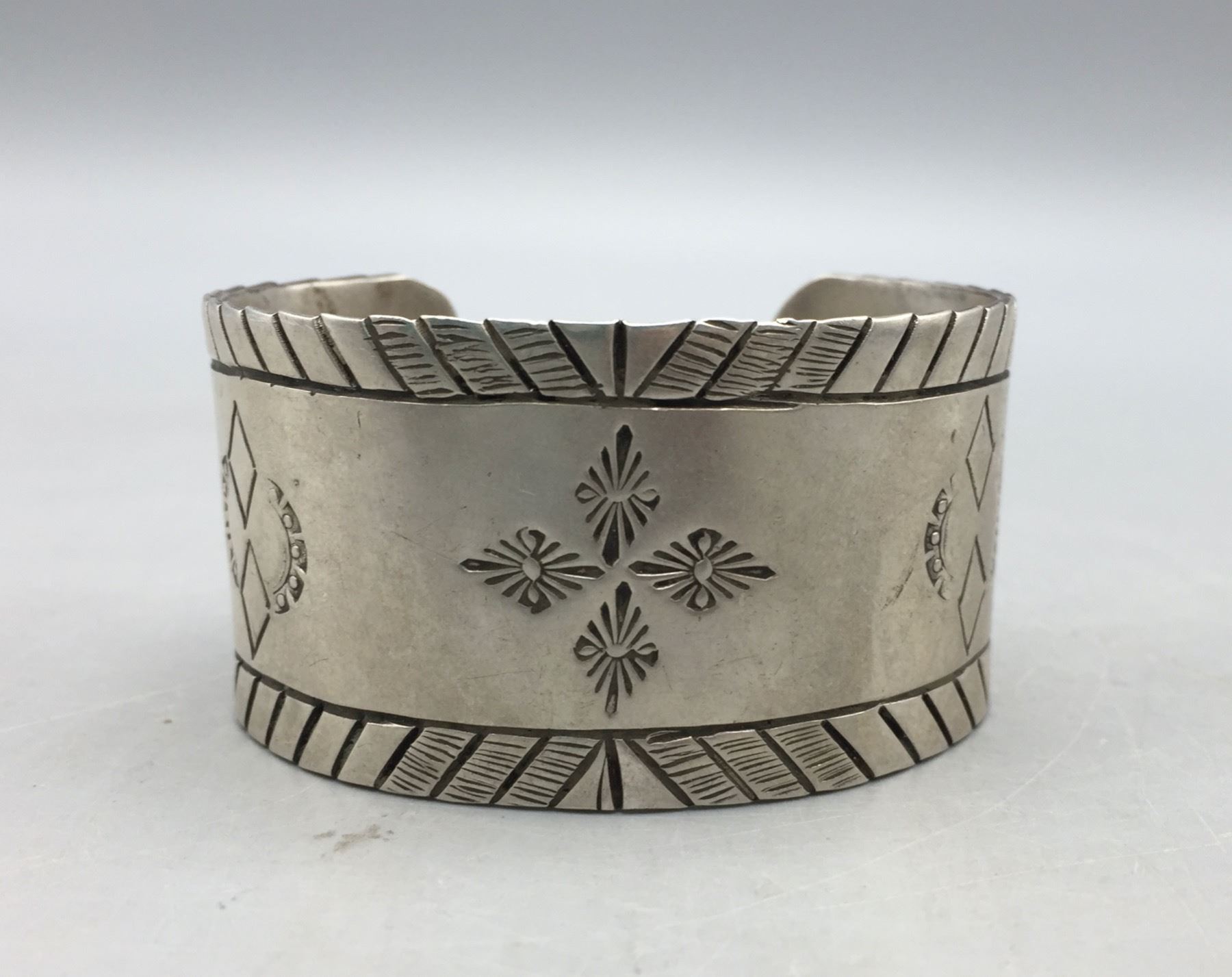 Description: Offered for sale in this lot is a nice vintage ingot bracelet. It has a nice stamped design in the sterling silver, with a nicely weighted feel. Maker: Hallmarked with a yucca plant. Approx. Age: Vintage. Size: Inside circumference measures 5-3/8†long, opening is additional 1-1/8â€, fitting a 5-3/4†wrist. Width is 1-1/4â€. Weighs 73.3 grams. Condition: Good for its age, normal wear expected. Please look closely at the pictures - they are an important part of our description. Shipping: There will be a $5 handling / packaging fee for shipping this lot. The actual cost of postage will be added on top of that.