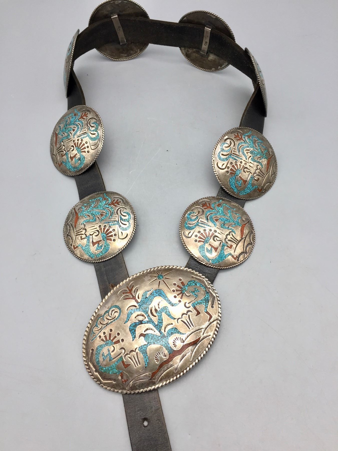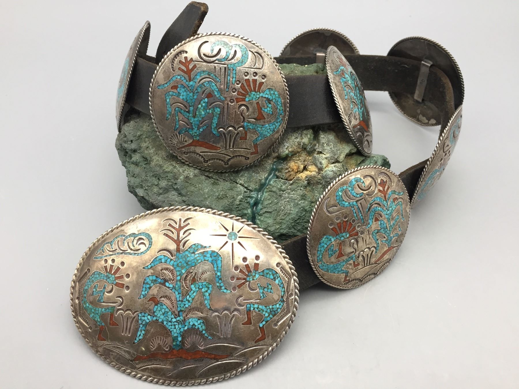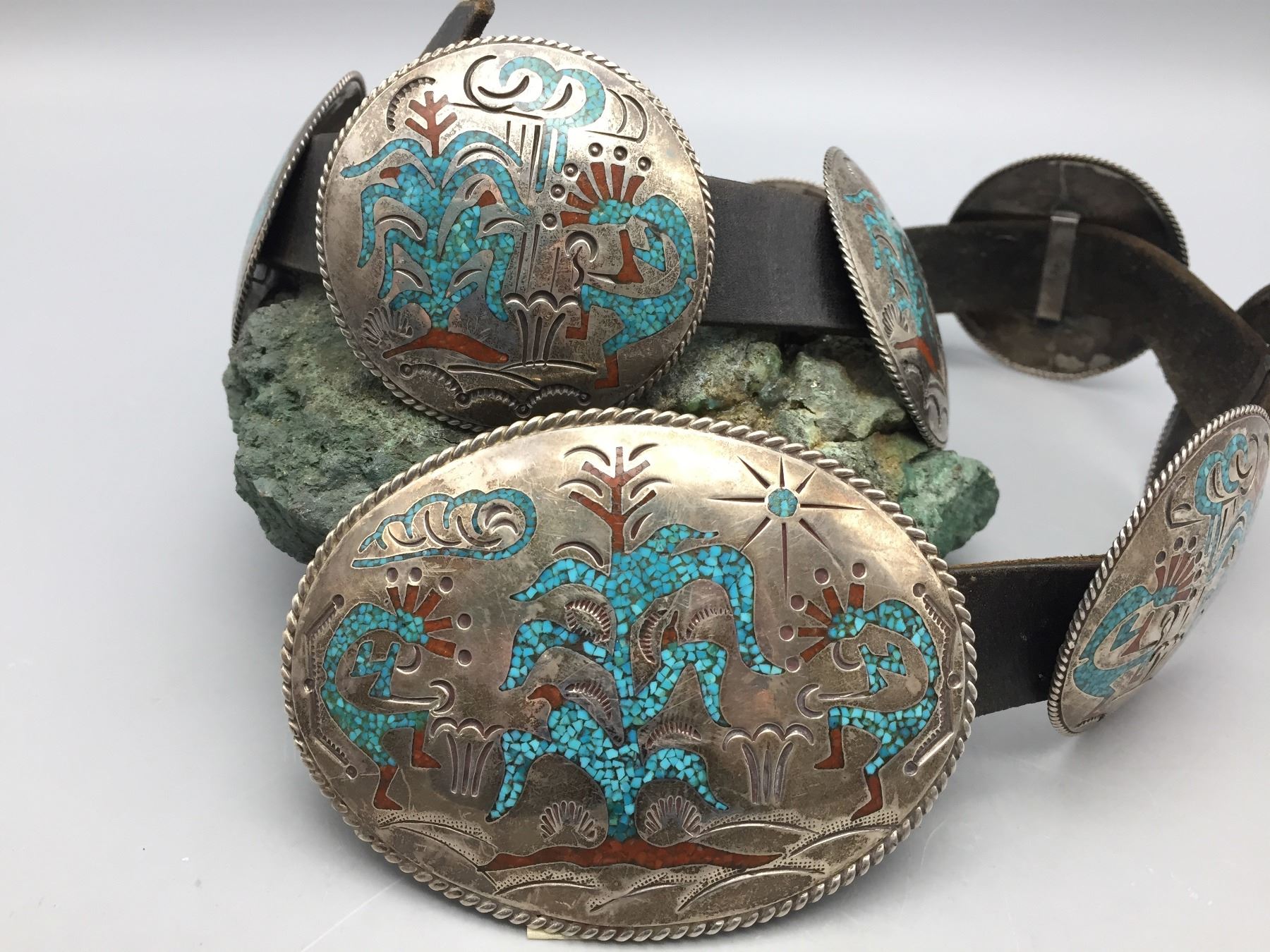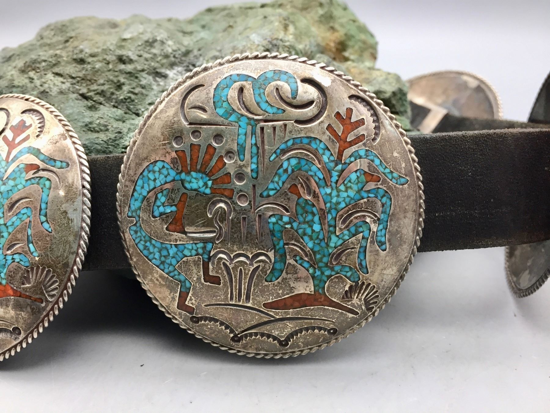 Description: Presented for sale in this lot is a black leather concho belt, featuring turquoise and coral chip inlay on sterling silver conchos. The buckle features coral and turquoise chip inlay, surrounded by a hand crafted rope designs in the sterling silver. Maker: Hallmarked S/D. William Singer, Navajo. Approx. Age: Circa 1970s vintage. Size: Measures 36” (including buckle). Buckle measures 4”w x 2-7/8”t. Conchos measure 2-3/8” round. Weighs 380 grams. Condition: Good for its age, normal wear expected. Please look closely at the pictures - they are an important part of our description. Shipping: There will be a $5 handling / packaging fee for shipping this lot. The actual cost of postage will be added on top of that.