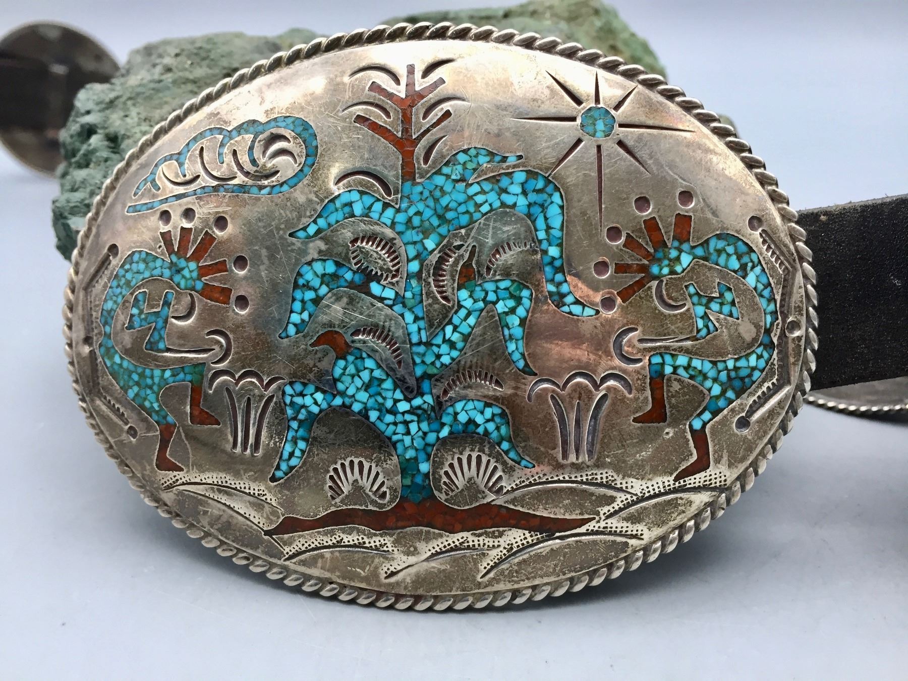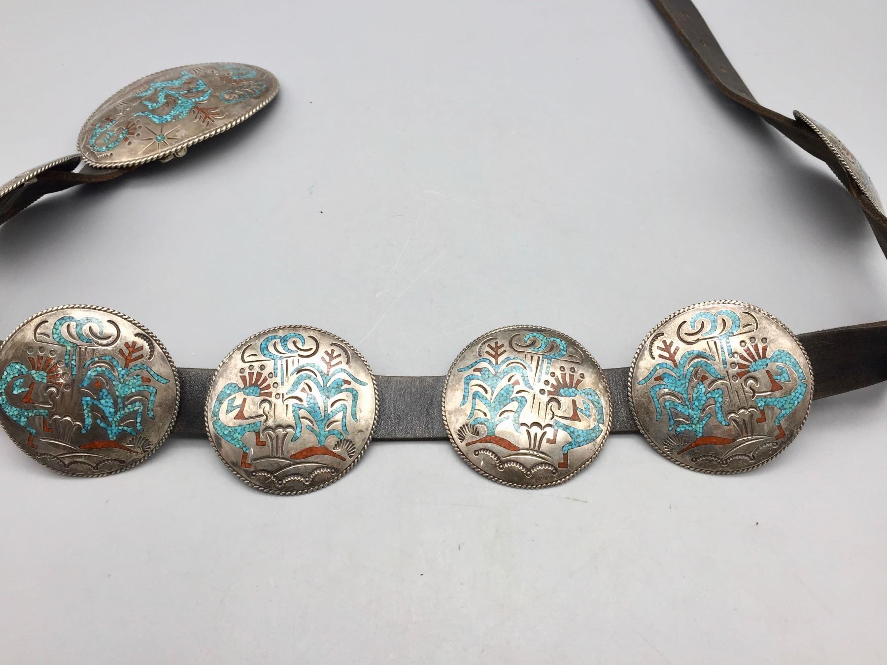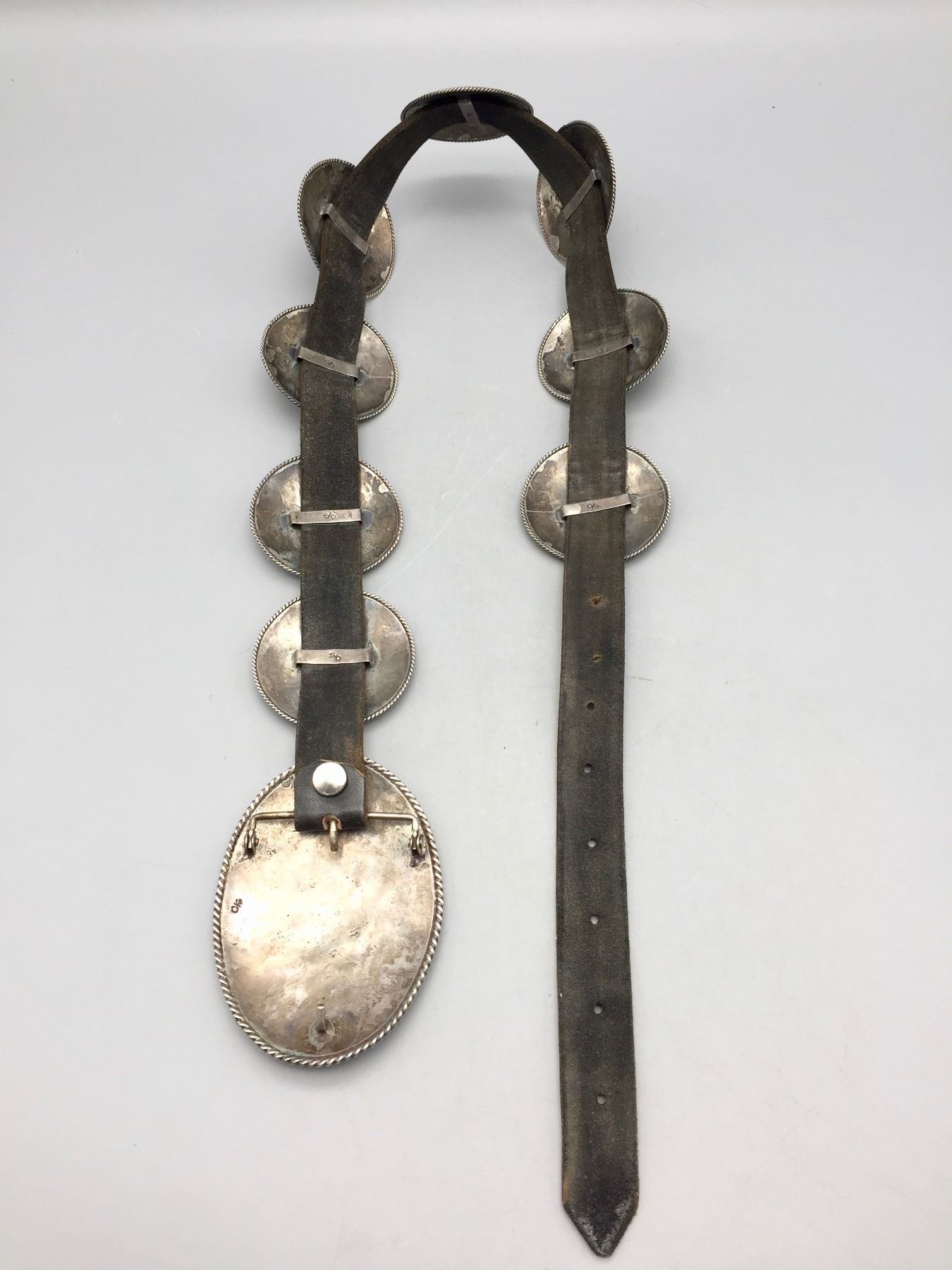 Description: Presented for sale in this lot is a black leather concho belt, featuring turquoise and coral chip inlay on sterling silver conchos. The buckle features coral and turquoise chip inlay, surrounded by a hand crafted rope designs in the sterling silver. Maker: Hallmarked S/D. William Singer, Navajo. Approx. Age: Circa 1970s vintage. Size: Measures 36” (including buckle). Buckle measures 4”w x 2-7/8”t. Conchos measure 2-3/8” round. Weighs 380 grams. Condition: Good for its age, normal wear expected. Please look closely at the pictures - they are an important part of our description. Shipping: There will be a $5 handling / packaging fee for shipping this lot. The actual cost of postage will be added on top of that.