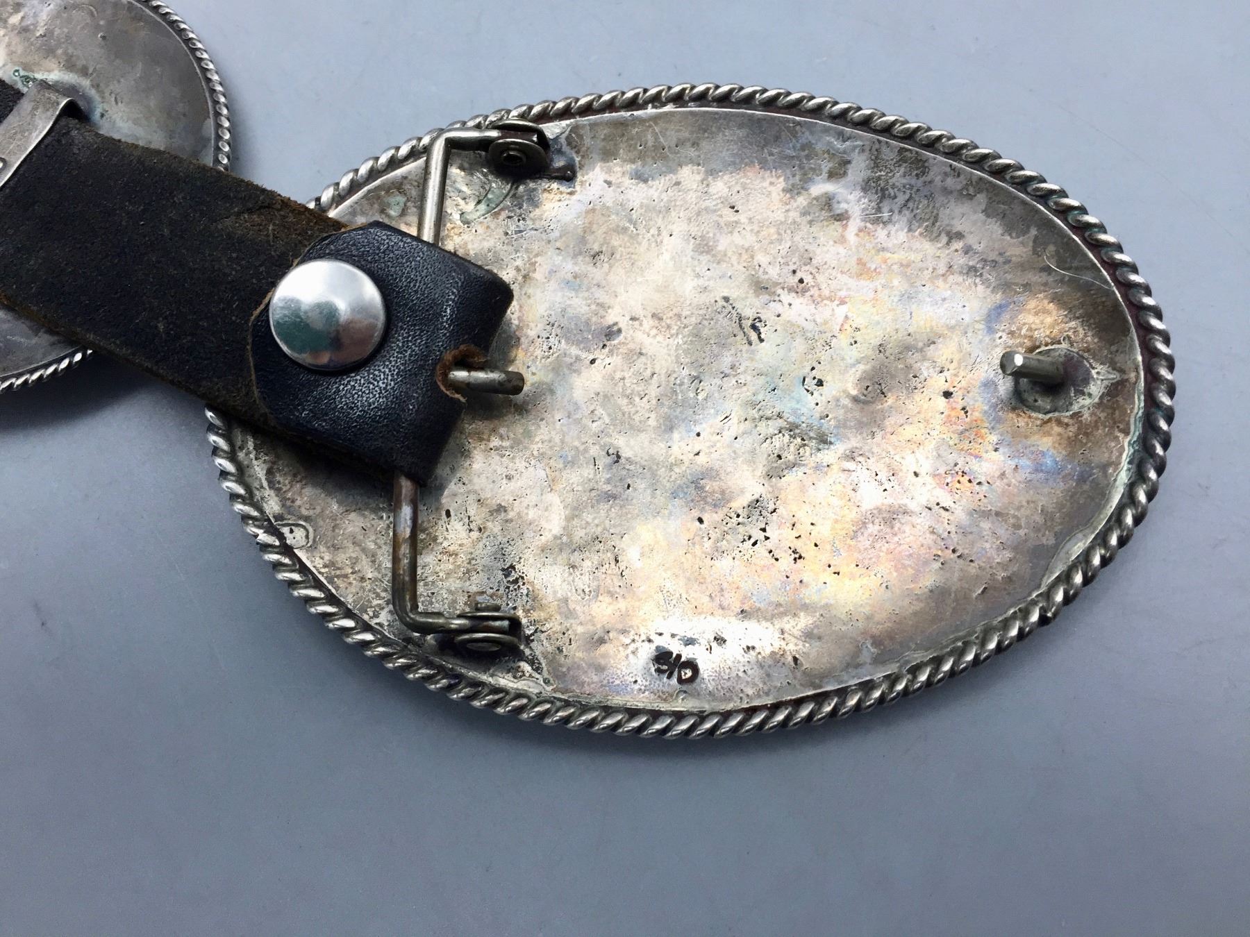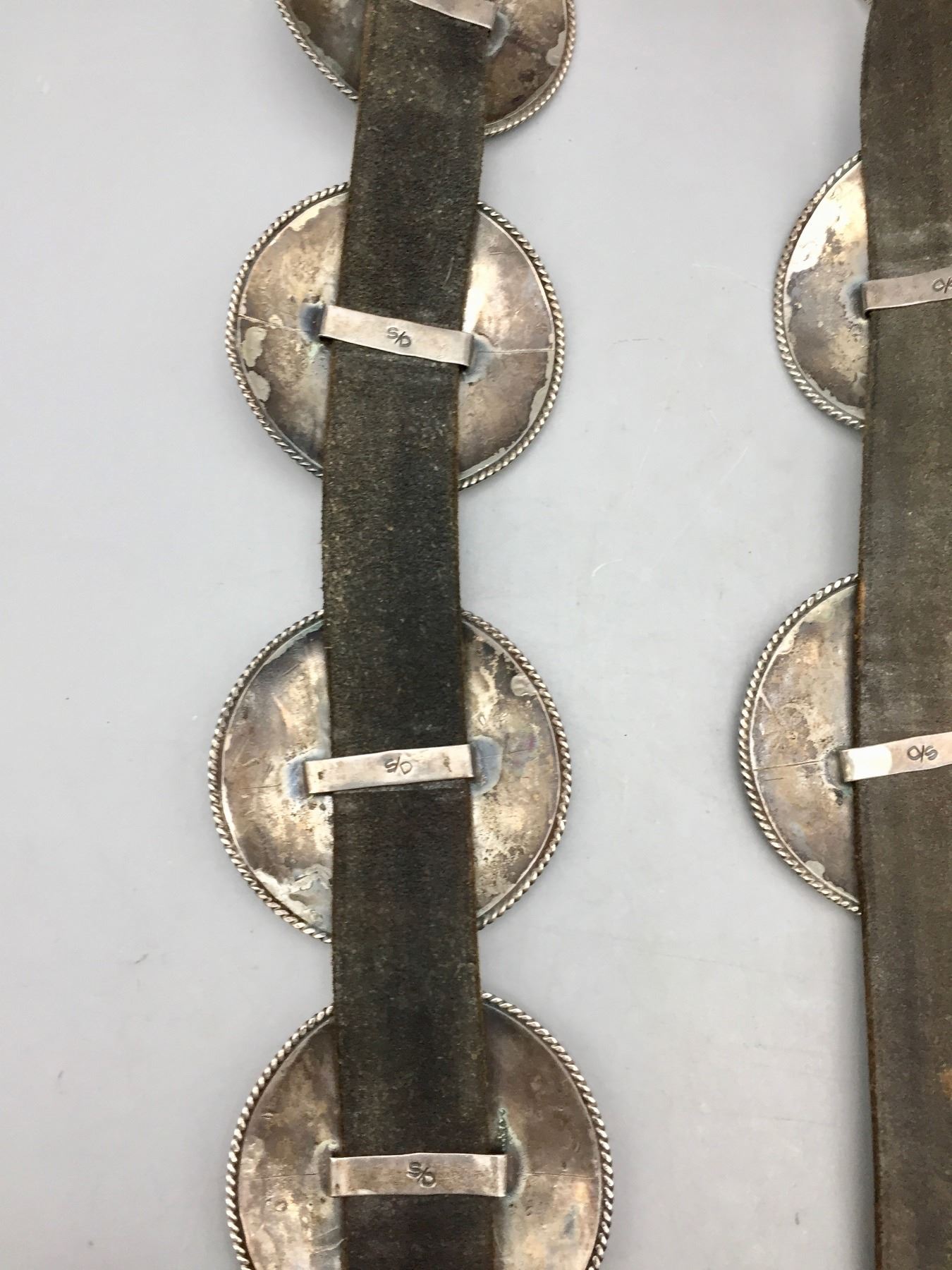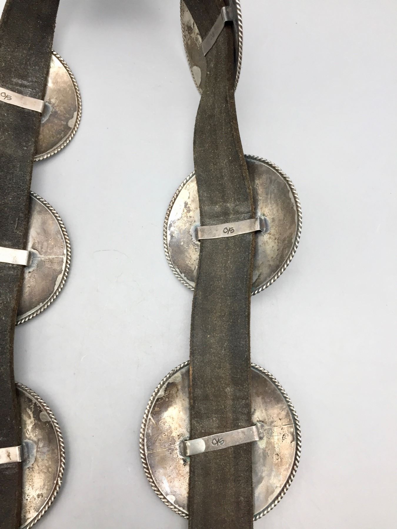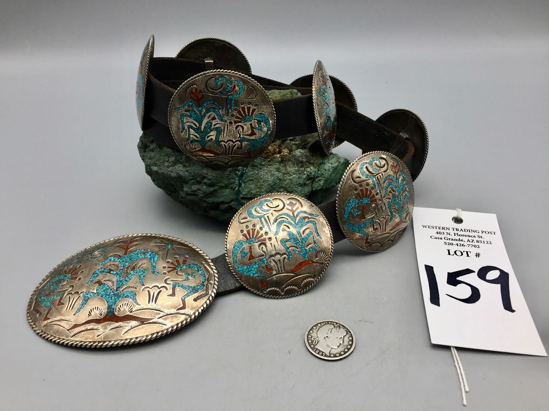 Description: Presented for sale in this lot is a black leather concho belt, featuring turquoise and coral chip inlay on sterling silver conchos. The buckle features coral and turquoise chip inlay, surrounded by a hand crafted rope designs in the sterling silver. Maker: Hallmarked S/D. William Singer, Navajo. Approx. Age: Circa 1970s vintage. Size: Measures 36” (including buckle). Buckle measures 4”w x 2-7/8”t. Conchos measure 2-3/8” round. Weighs 380 grams. Condition: Good for its age, normal wear expected. Please look closely at the pictures - they are an important part of our description. Shipping: There will be a $5 handling / packaging fee for shipping this lot. The actual cost of postage will be added on top of that.