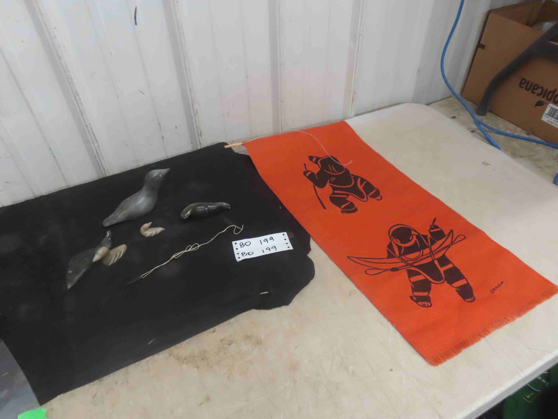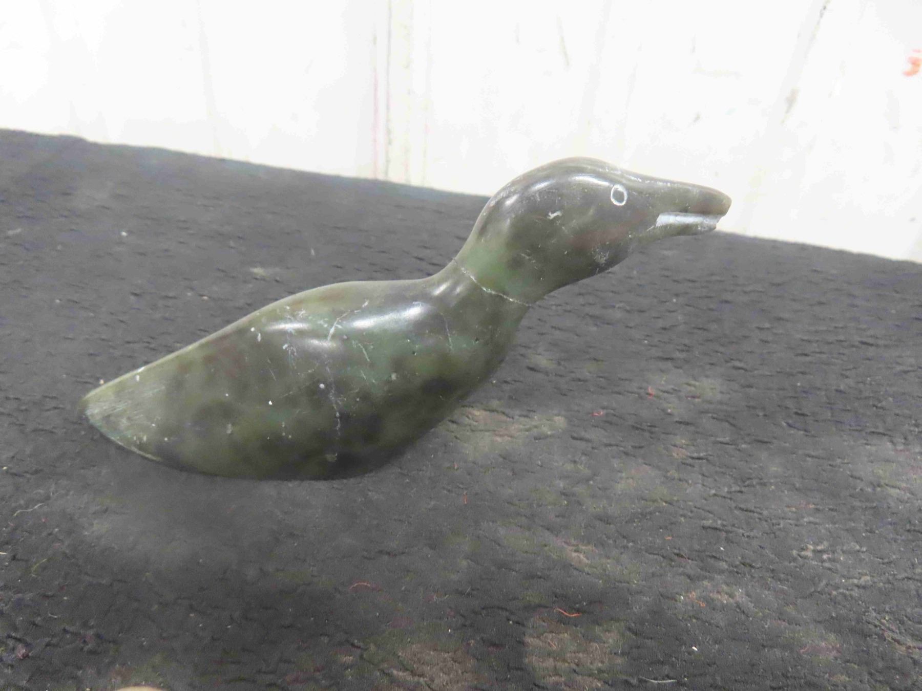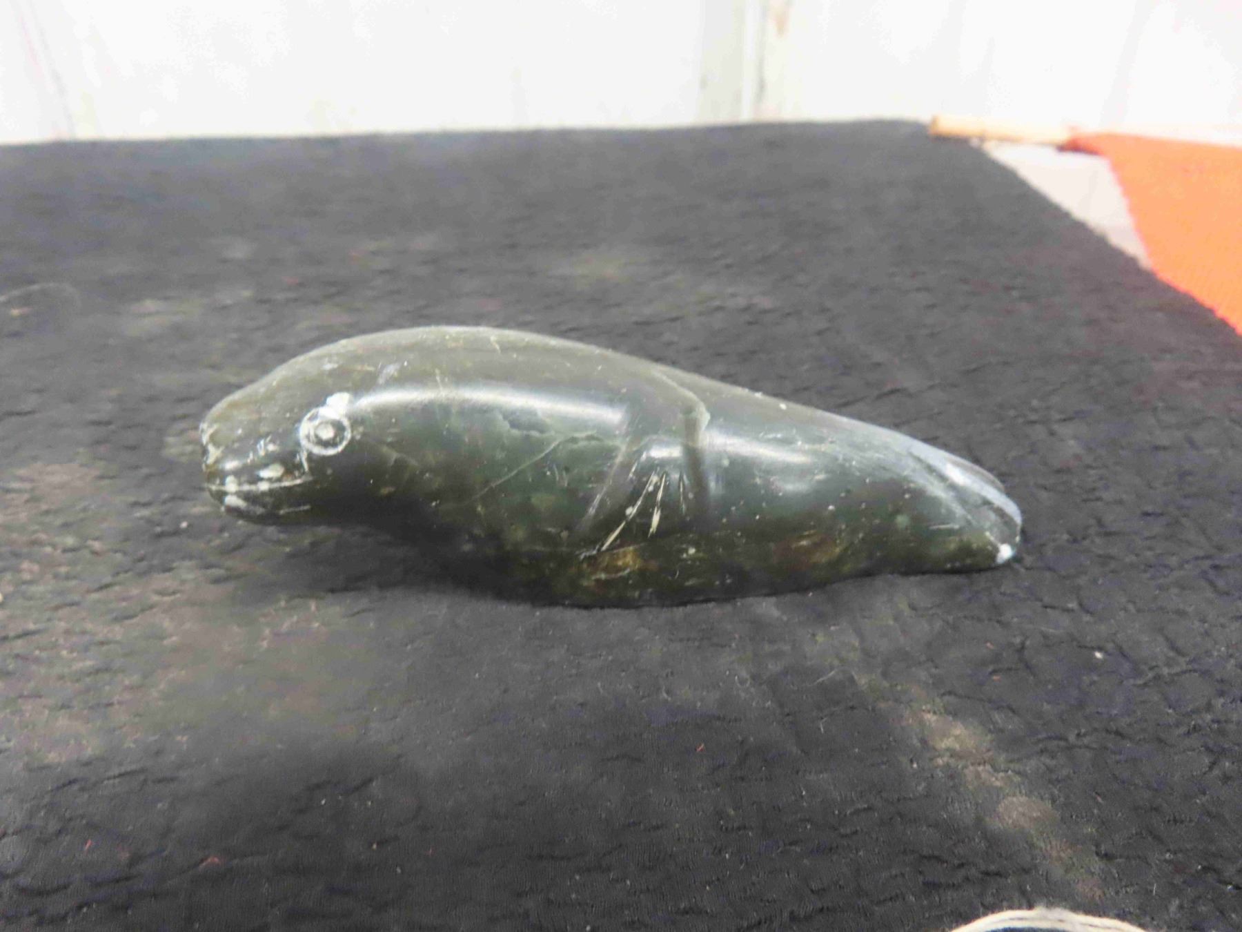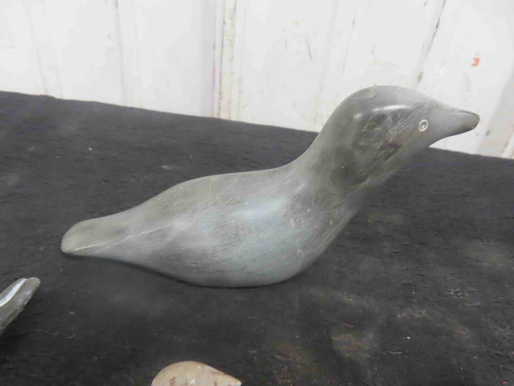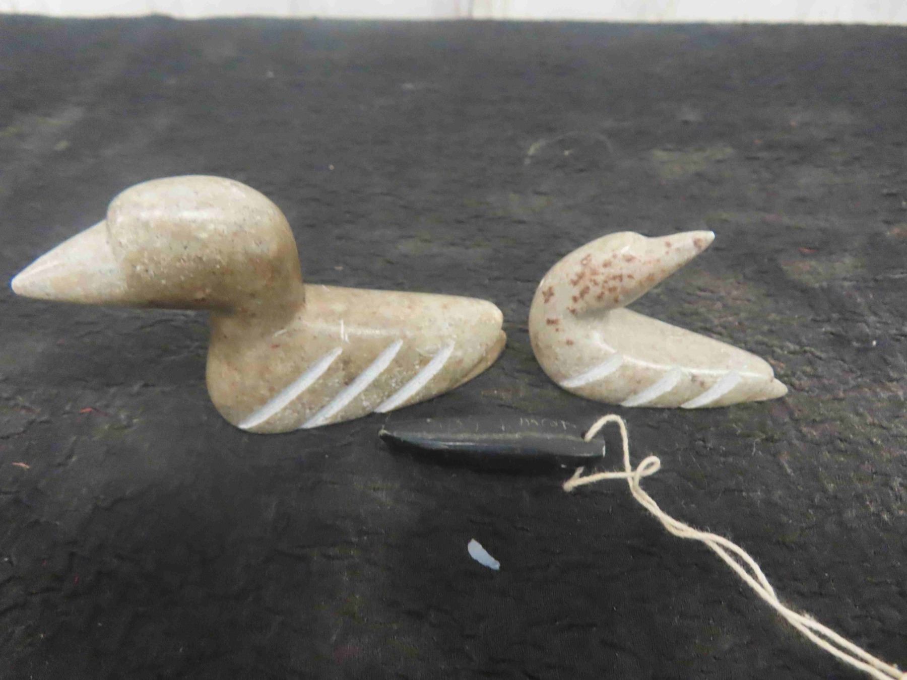 Vintage Inuit First Nations Soapstone Carving Lot: 2 Birds Signed, Pendant Signed, Seal Signed, Canvas Wall Hanging & More.