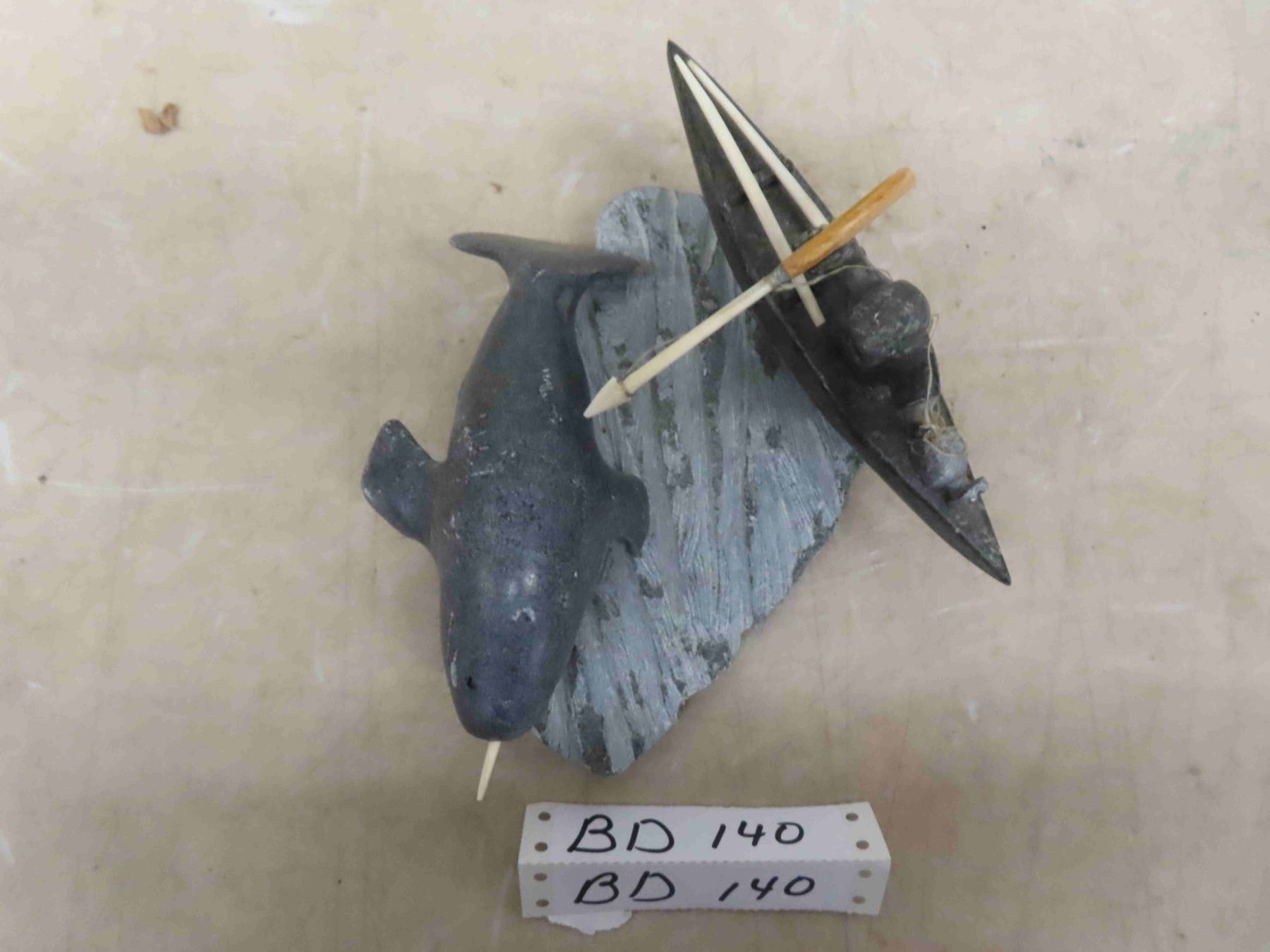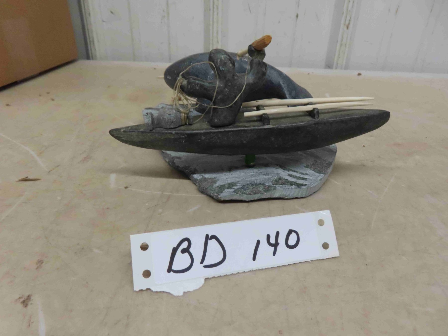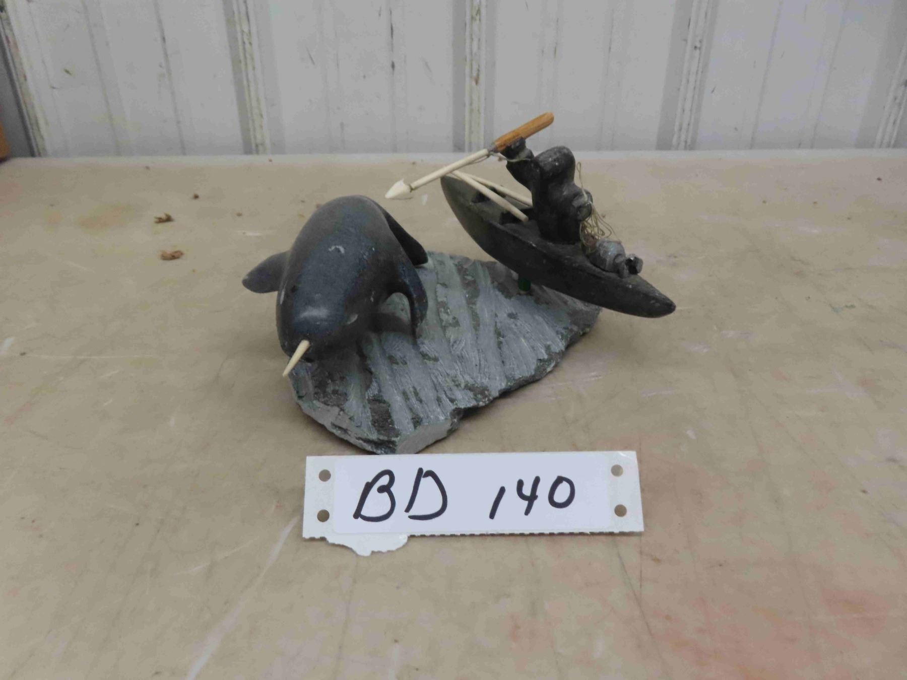 Vintage Inuit Soapstone Carving of Hunter in Kayak Hunting Narwahl , Base is Signed By Paul Kapuk - Base Measures 7'' x 6'' - Very Nice