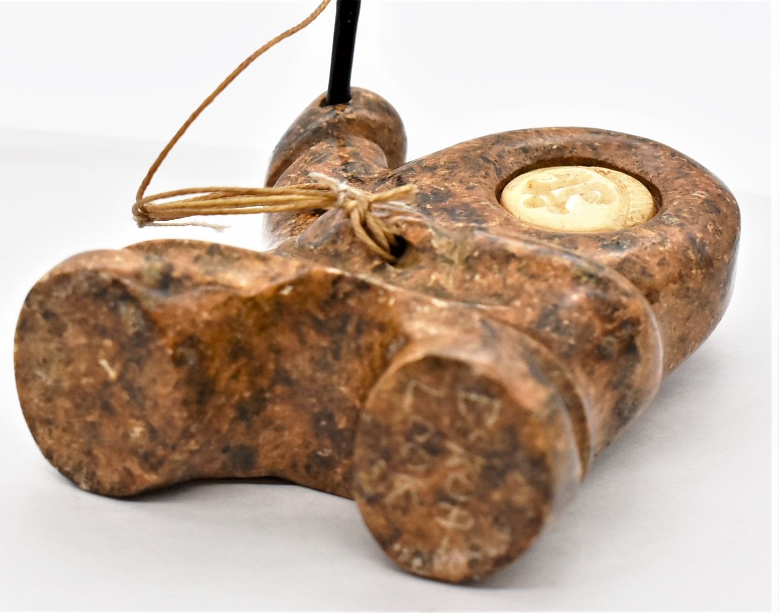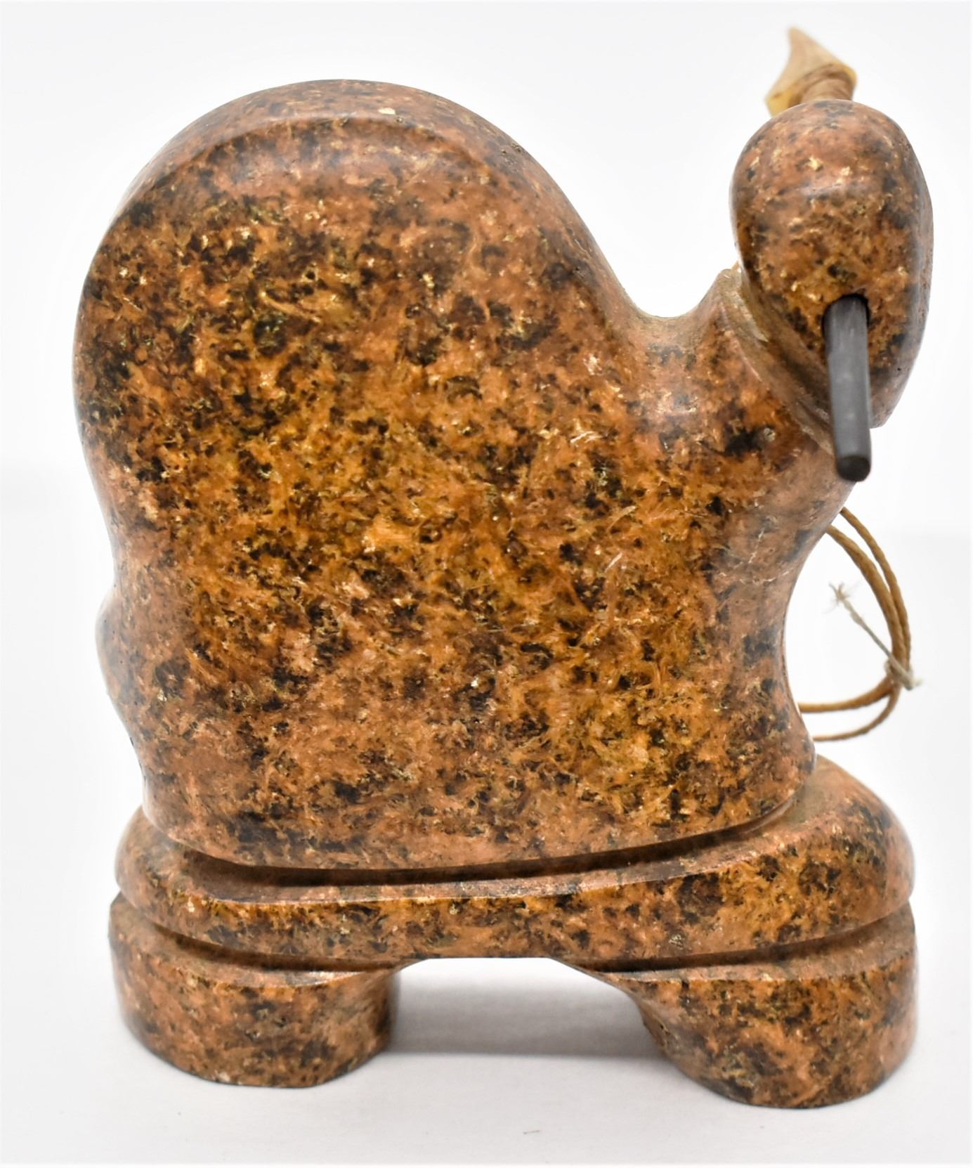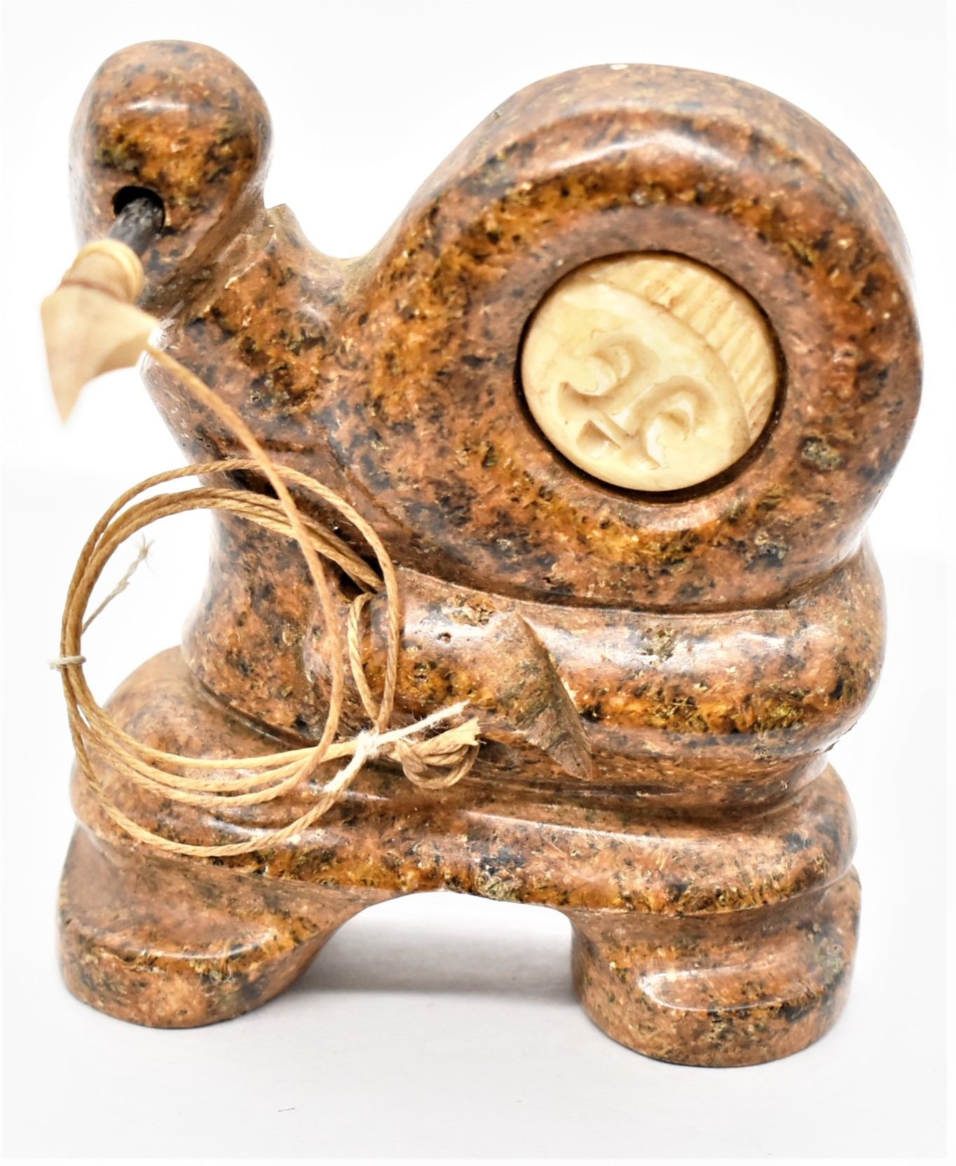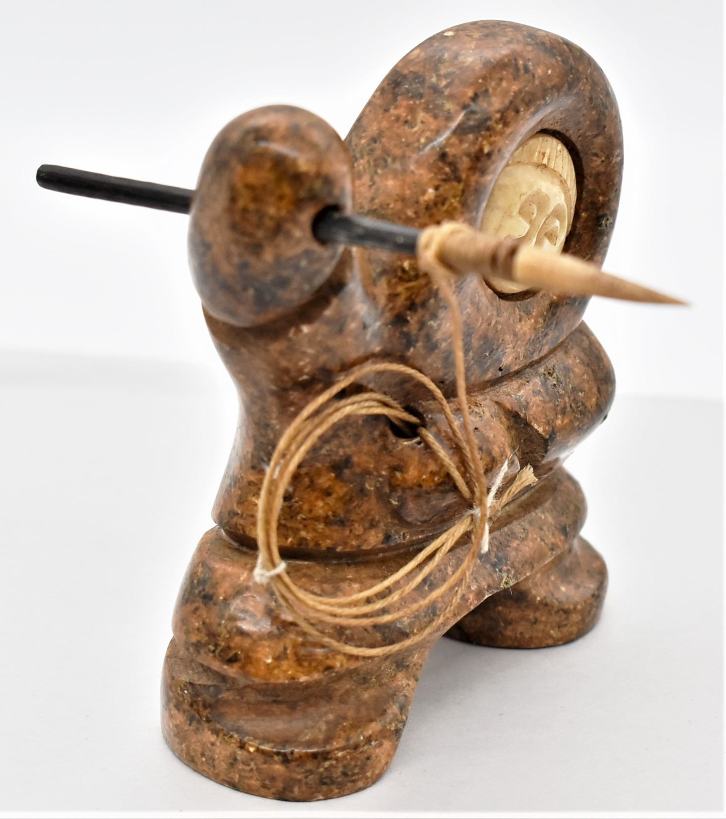 Vintage Inuit Soapstone ''Ivory Hunter'' Carving by Bekoa Look, measures 3.5'' x 2.5'' x 1'', spear can be removed for shipping, face is carved ivory, ca. 1990, signed on the bottom