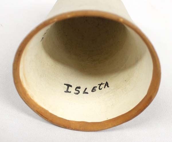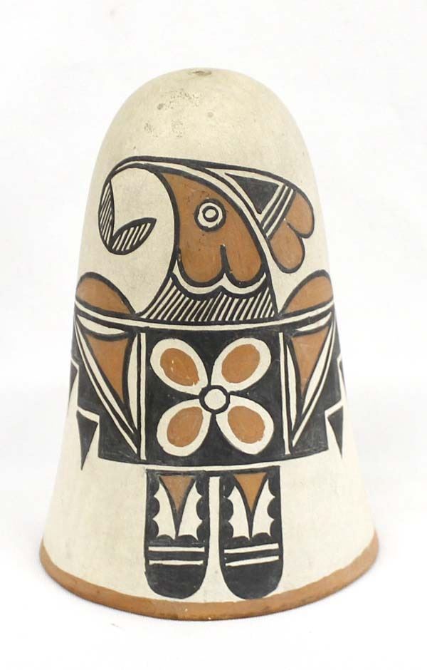 Vintage Native American Isleta Pueblo Pottery Wind Chime by Lucy R. Jojola, measures 5.5''H x 3.75''D and is signed by the artist, missing the clapper, FYI: ''Lucy R. Jojola, Isleta, active since 1960 to present, her work includes polychrome jars, bowls, wedding vases, and wind chimes. Her favorite designs are birds, lighting clouds and leaves. Her work is in several collections.''