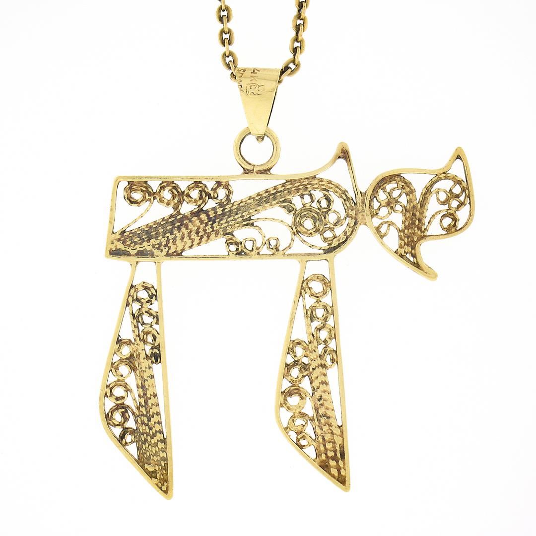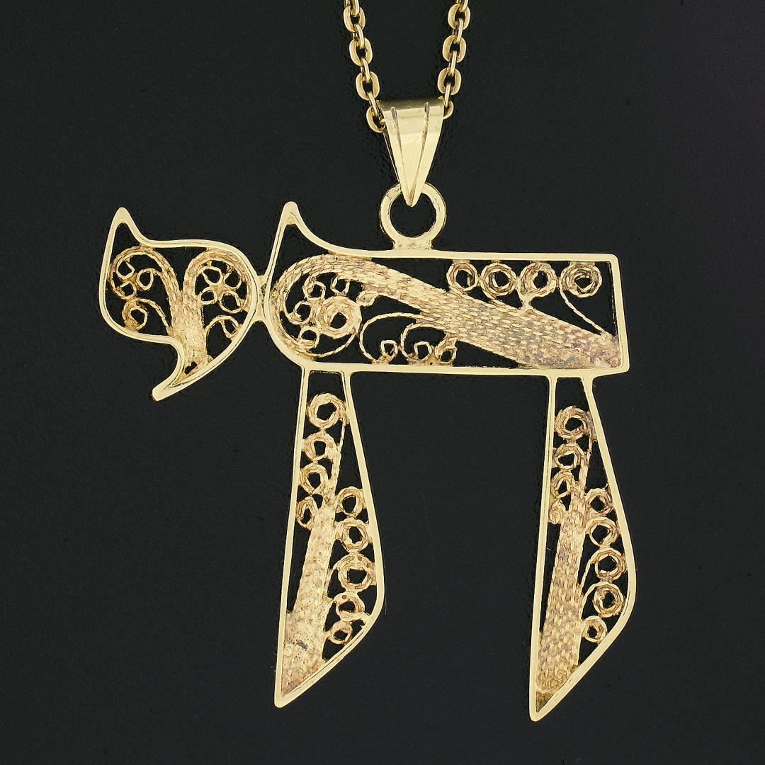 A vintage solid 14k yellow gold chai pendant necklace. 16 inch cable link chain, 6.13 grams total weight, pendant measures 38.90x33.50mm.