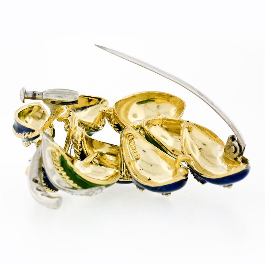A vintage 18k yellow and white gold leaf pin brooch, featuring 5 old single cut natural diamonds (F/G- VS1/VS2 ; 0.08ctw). with blue and green enamel work. Measures 19.50x18.65mm and weighs a total of 18.87 grams.