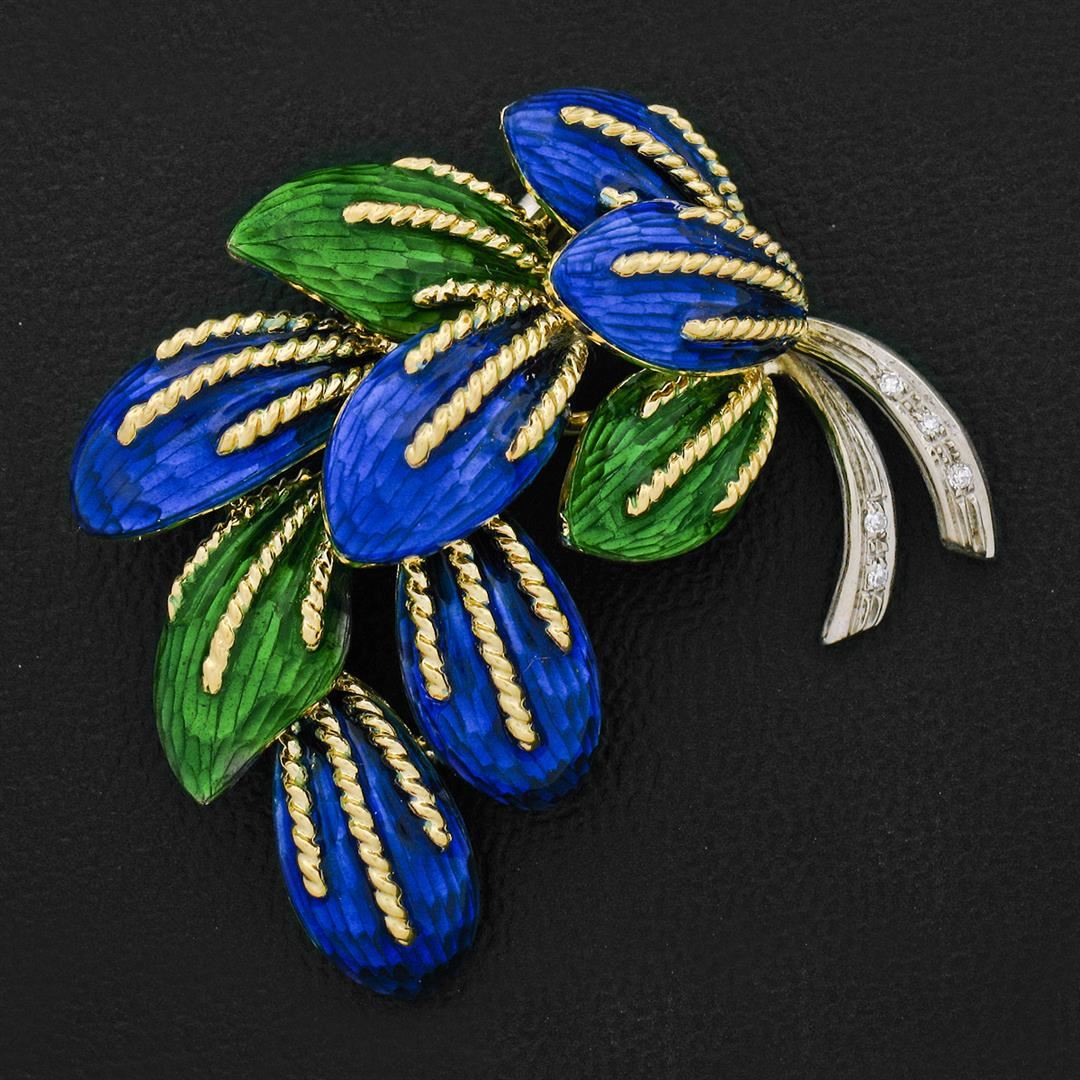A vintage 18k yellow and white gold leaf pin brooch, featuring 5 old single cut natural diamonds (F/G- VS1/VS2 ; 0.08ctw). with blue and green enamel work. Measures 19.50x18.65mm and weighs a total of 18.87 grams.