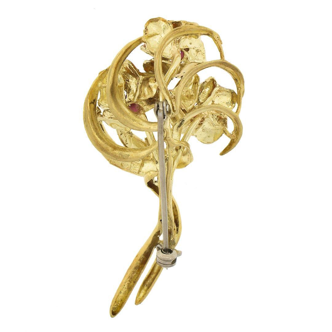 A vintage solid 18k yellow & white gold flower brooch, with enamel work & 3 old round cut natural rubies (0.10ctw). Measures 51.1x27mm and weighs a total of 11.74 grams.