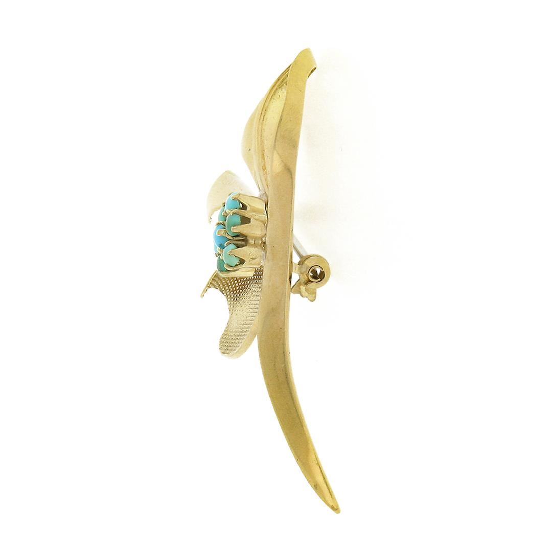 A vintage solid 18k yellow gold flower pin brooch, with 7 round cabochon cut natural turquoises (2.4mm to 2.7mm each). Measures 45.70x44.40mm and weighs a total of 6.89 grams.