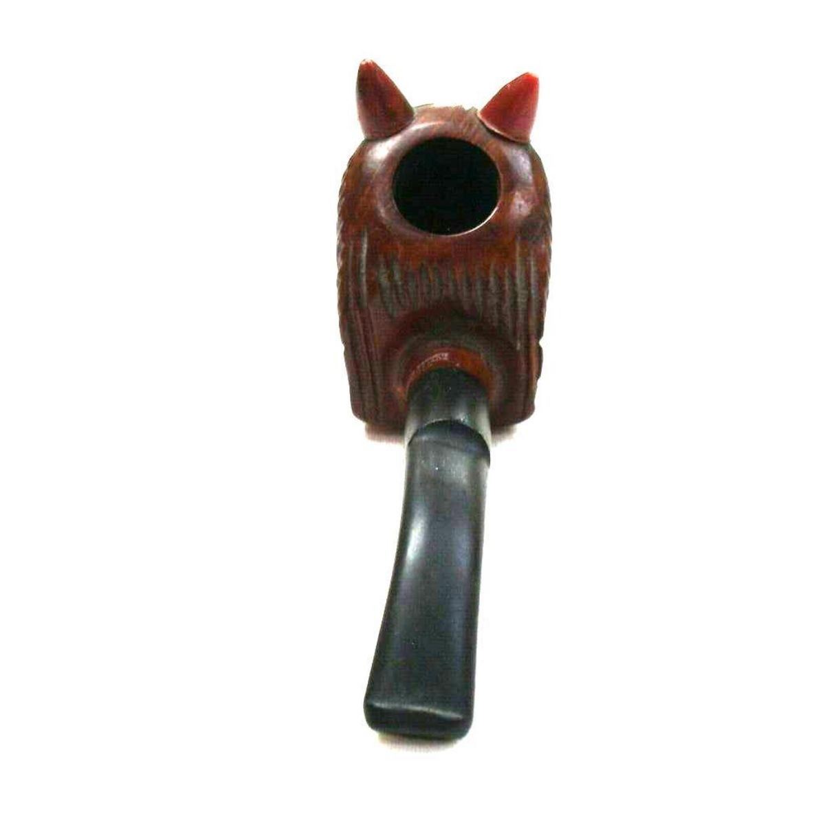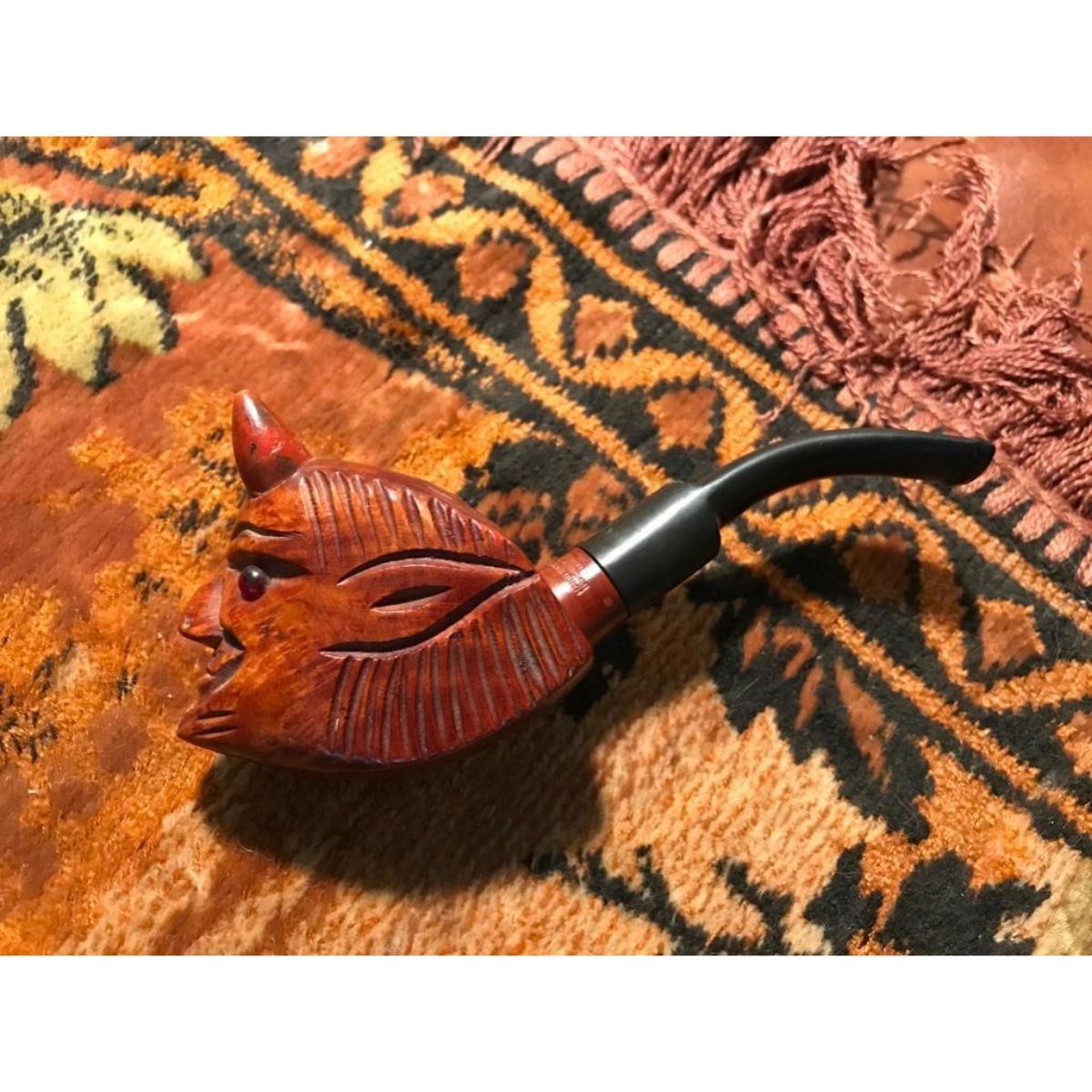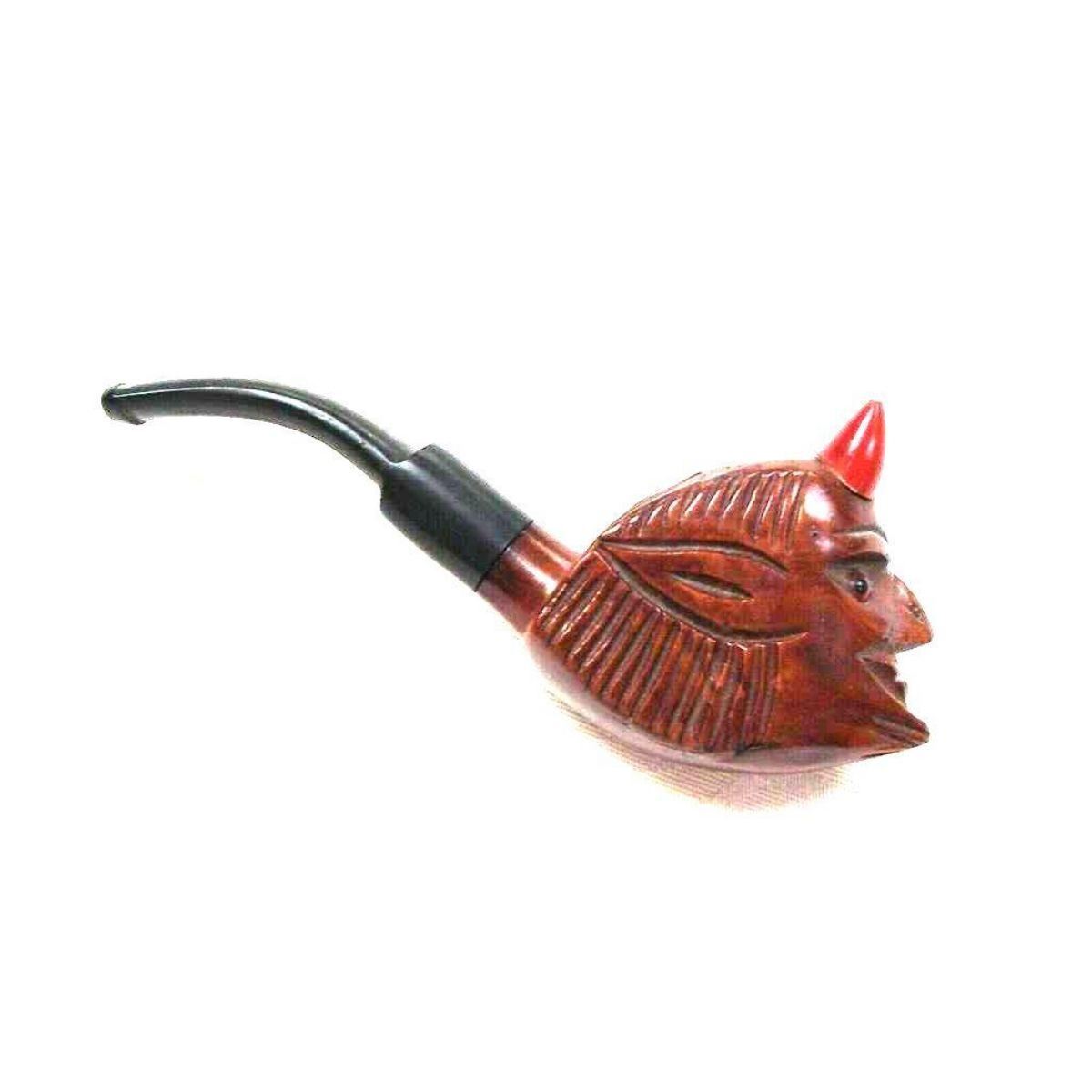 Attractive novelty pipe marked '' HAND CARVED IMPORTED BRIAR ITALY'' with bent ebonite pipe & inserted glass eyes. Approx. 5" length, 1 1/2" width, 2" head of devil height. In very good condition. Â Â