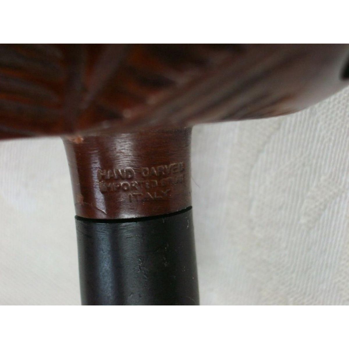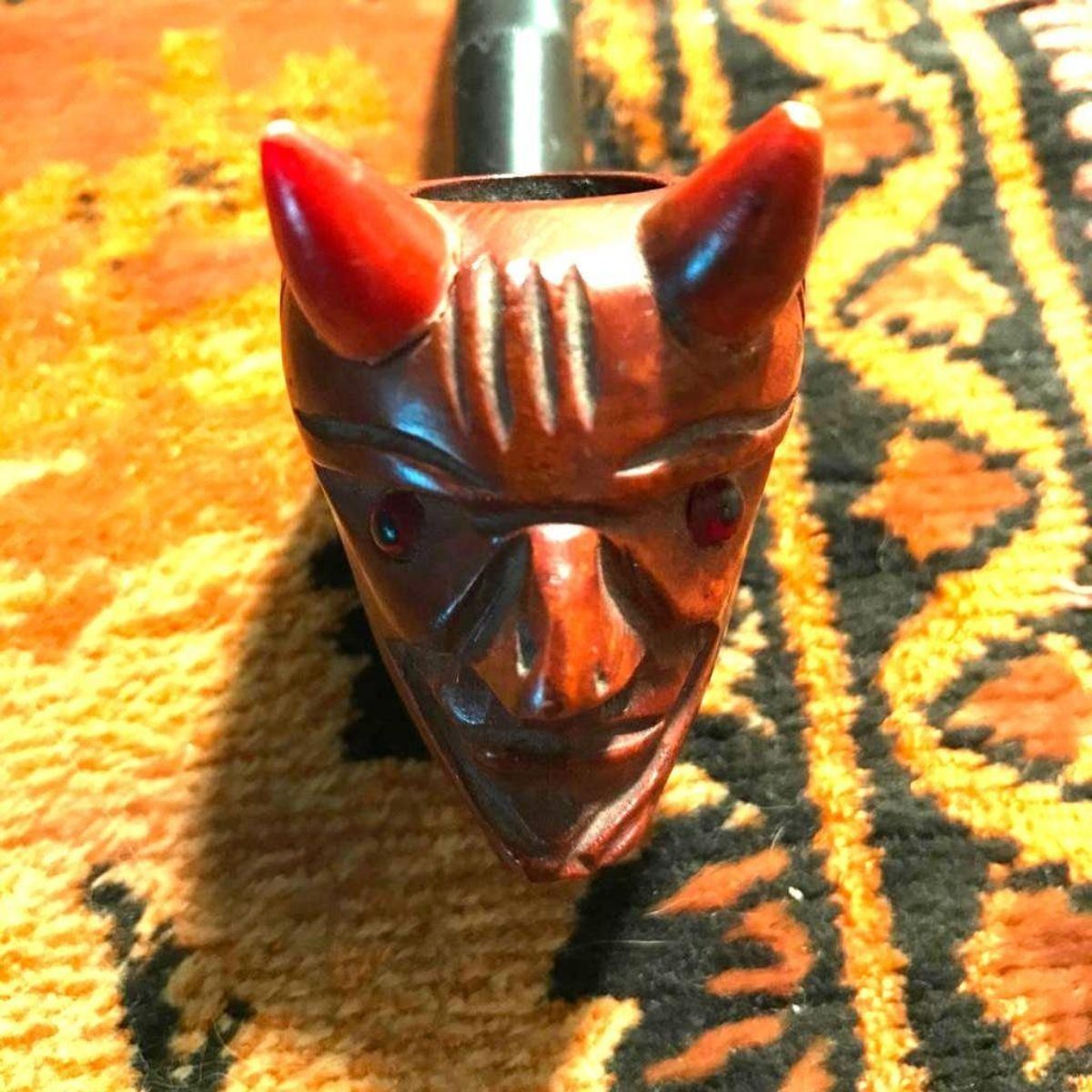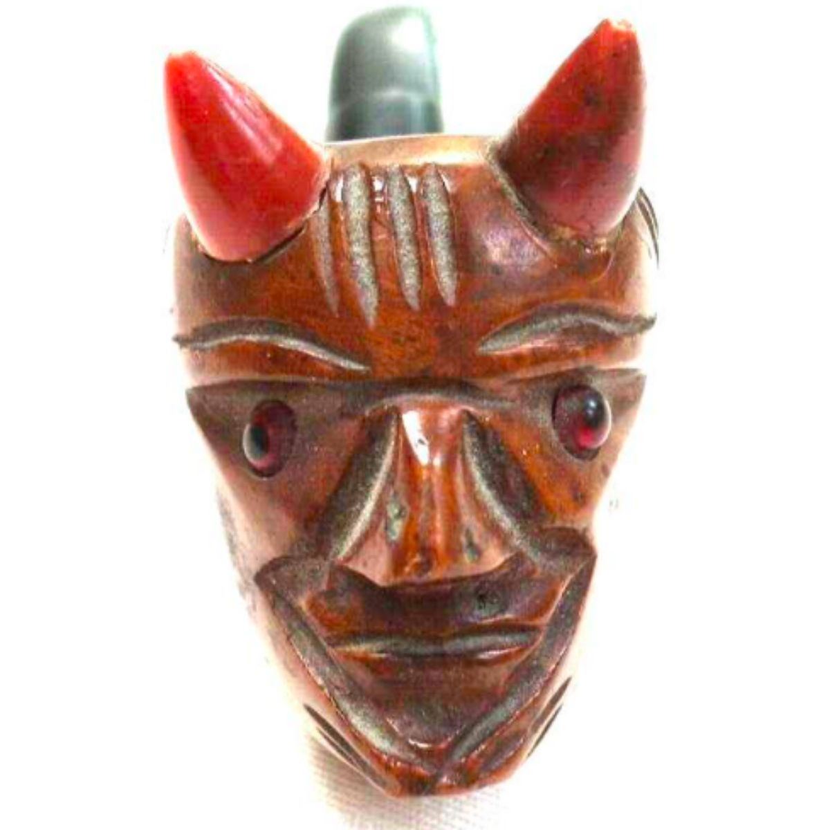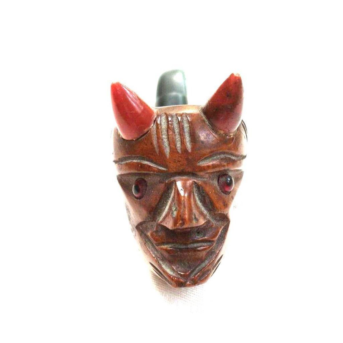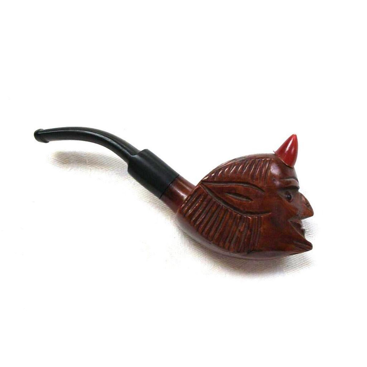 Attractive novelty pipe marked '' HAND CARVED IMPORTED BRIAR ITALY'' with bent ebonite pipe & inserted glass eyes. Approx. 5" length, 1 1/2" width, 2" head of devil height. In very good condition. Â Â