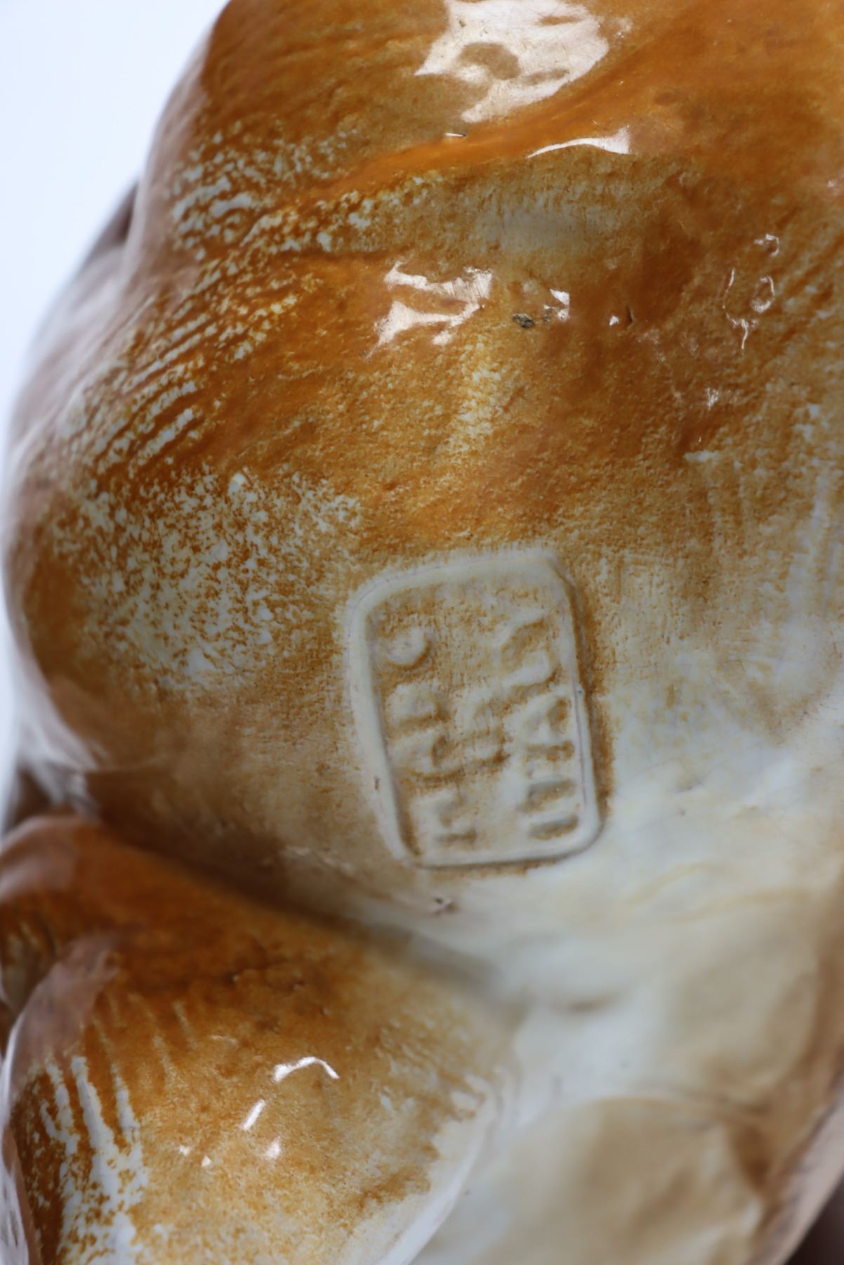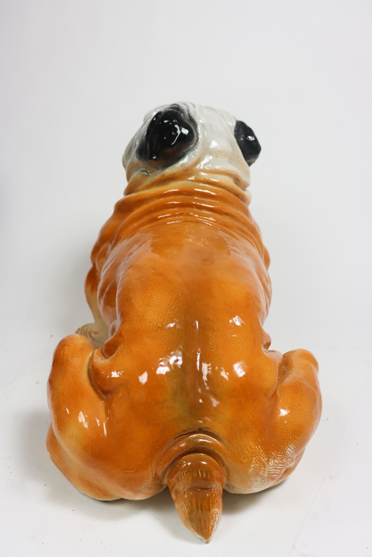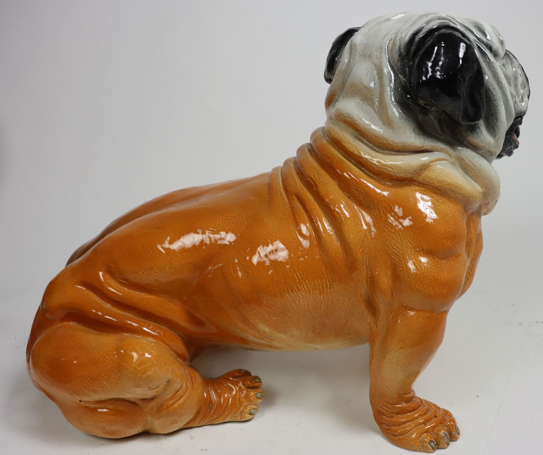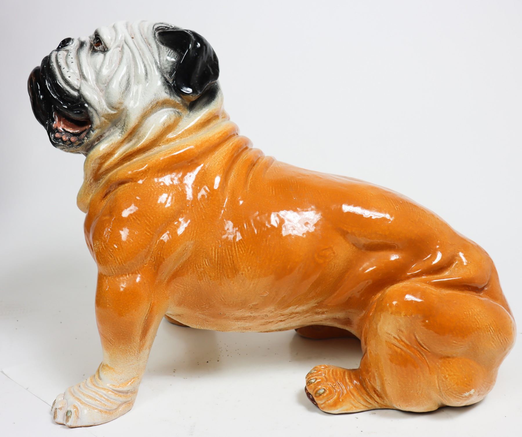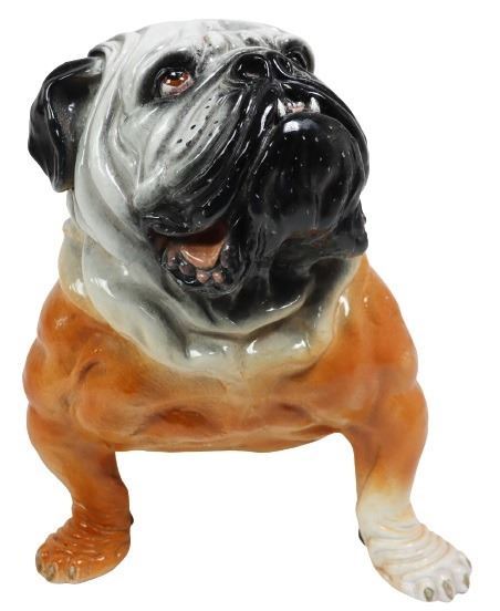 Italian terracotta bulldog sculpture, glazed finish. Made in Italy stamped on the shoulder. In the sitting position, looking up. Size: 20 x 26 x 17 in.