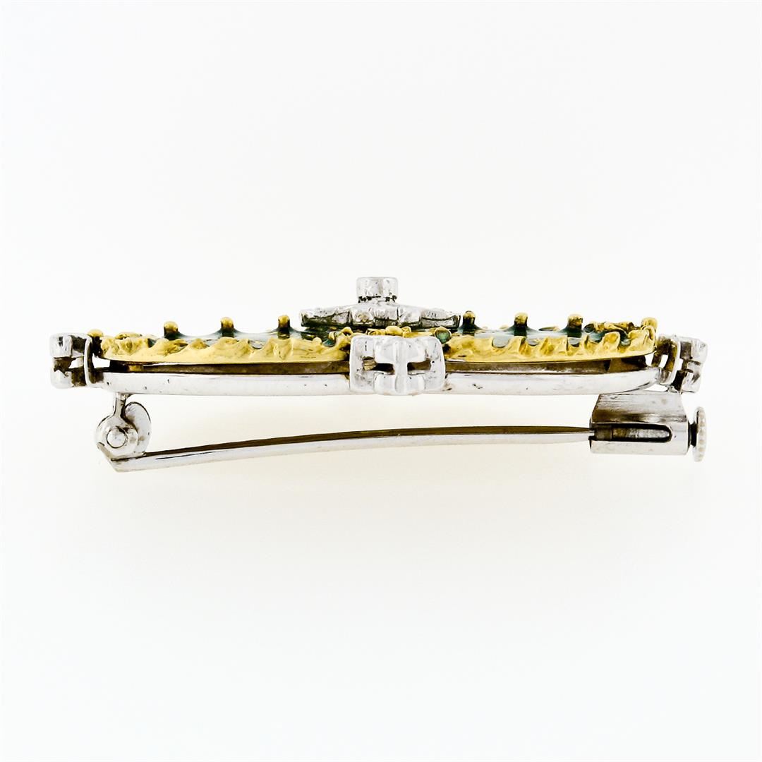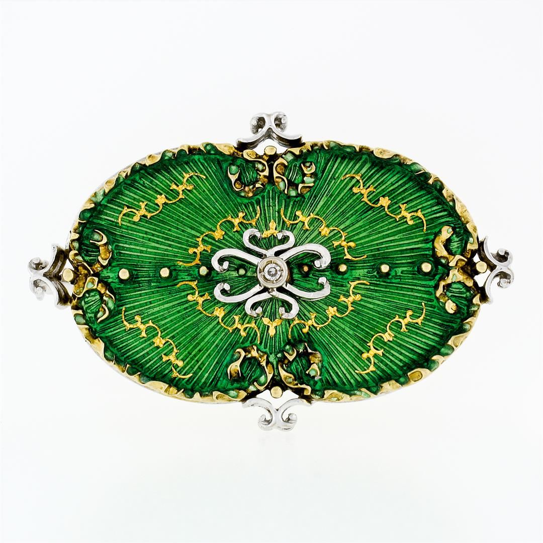 A vintage italian UnoAErre solid 18k white & yellow gold pin brooch, with green enamel work 1 old single cut natural diamond (G - VS2 ; 0.02ct). Measures 25.83x39.20mm and weighs a total of 9.85 grams.