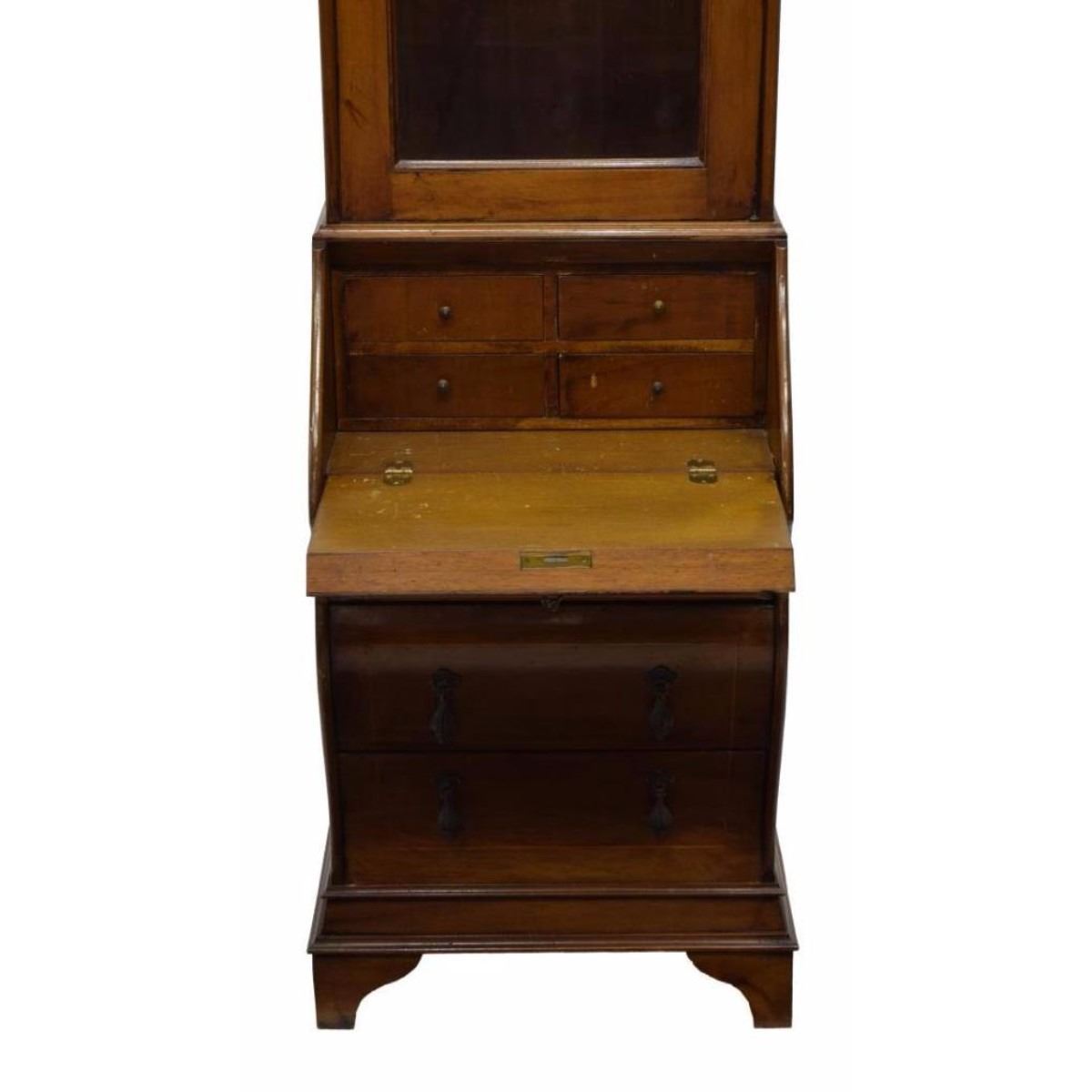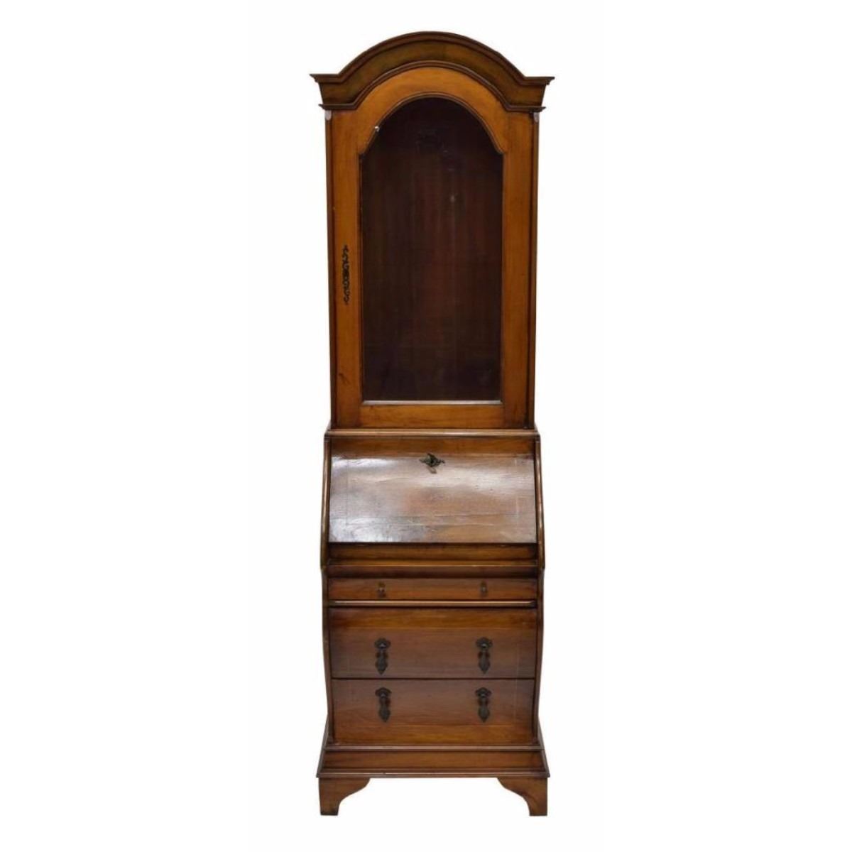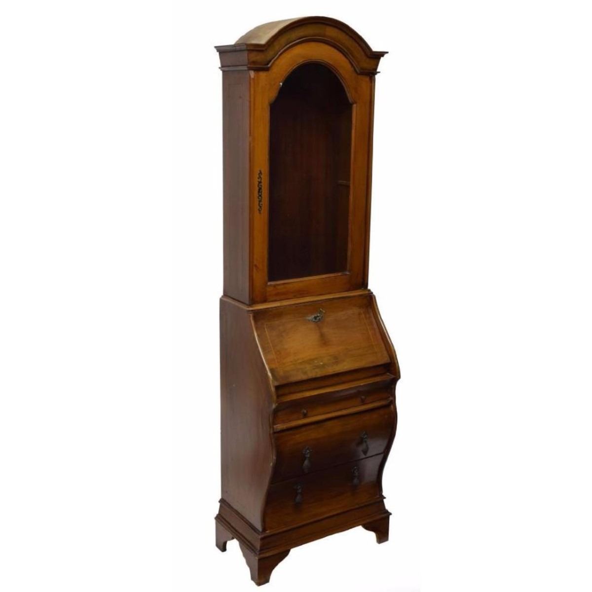 Vintage Italian walnut secretary, 20th c., having a corniced arched top over the single glass panel door, opening to shelved interior, over a fall front door, concealing fitted four-drawer interior, over three drawers, rising on bracket feet, 72"h, 21"w, 25"d