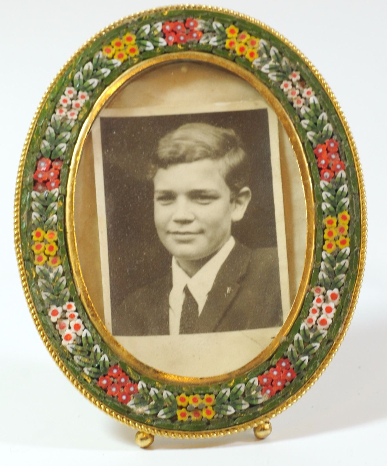 Vintage Italian picture frame decorated with a micro mosaic flower pattern, signed, height: 10 cm.