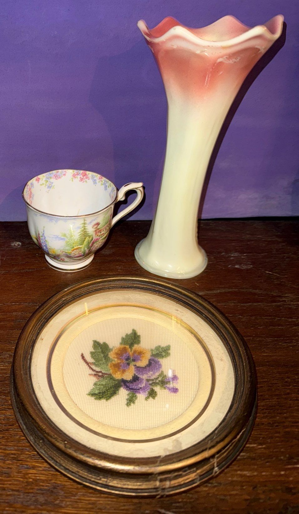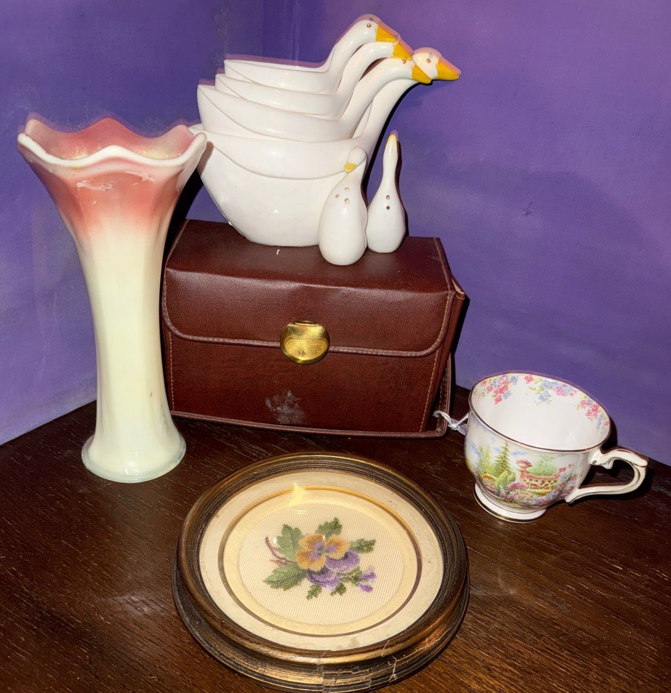 Vintage Decorative Items- Nesting Measuring Cups, Vase, Tea Cup & Yardley Box