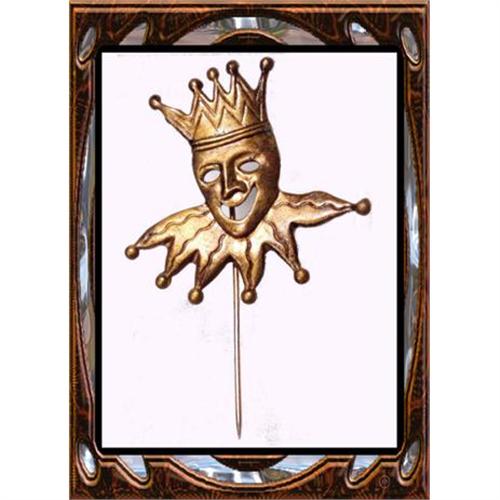 Let the masquerade begin! This repousse jester stick pin has tiny lines of black enamel that recess into the crown like hat and the fancy jester collar. This measures 2 1/2" long and is 1 3/4" at its widest. In great shape this is one of the more unusual figural pins I have seen.