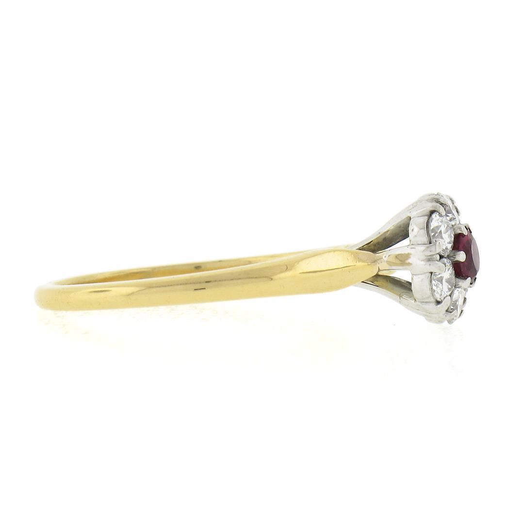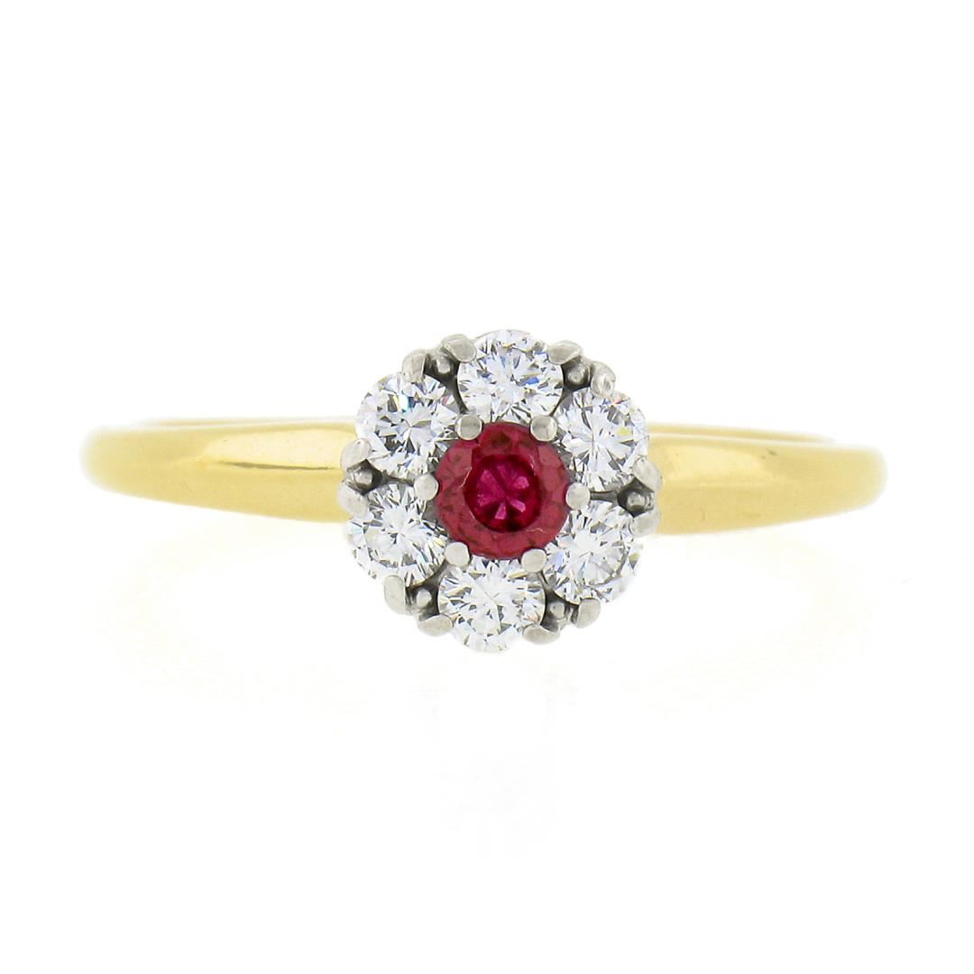 A vintage solid 18k yellow & white gold ring by JABEL, with 1 round cut natural ruby (3.1mm - 0.15ct ), and a halo of 6 round cut natural diamonds (F/G - VS1/VS2 ; 0.25ctw). The ring is size 6.0, weighs a total of 2.95 grams, and measures 7.5mm wide.