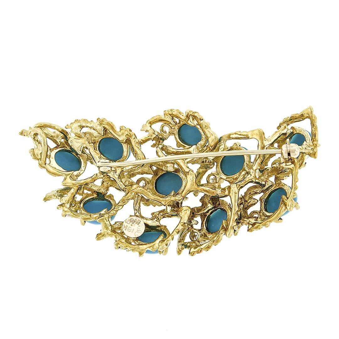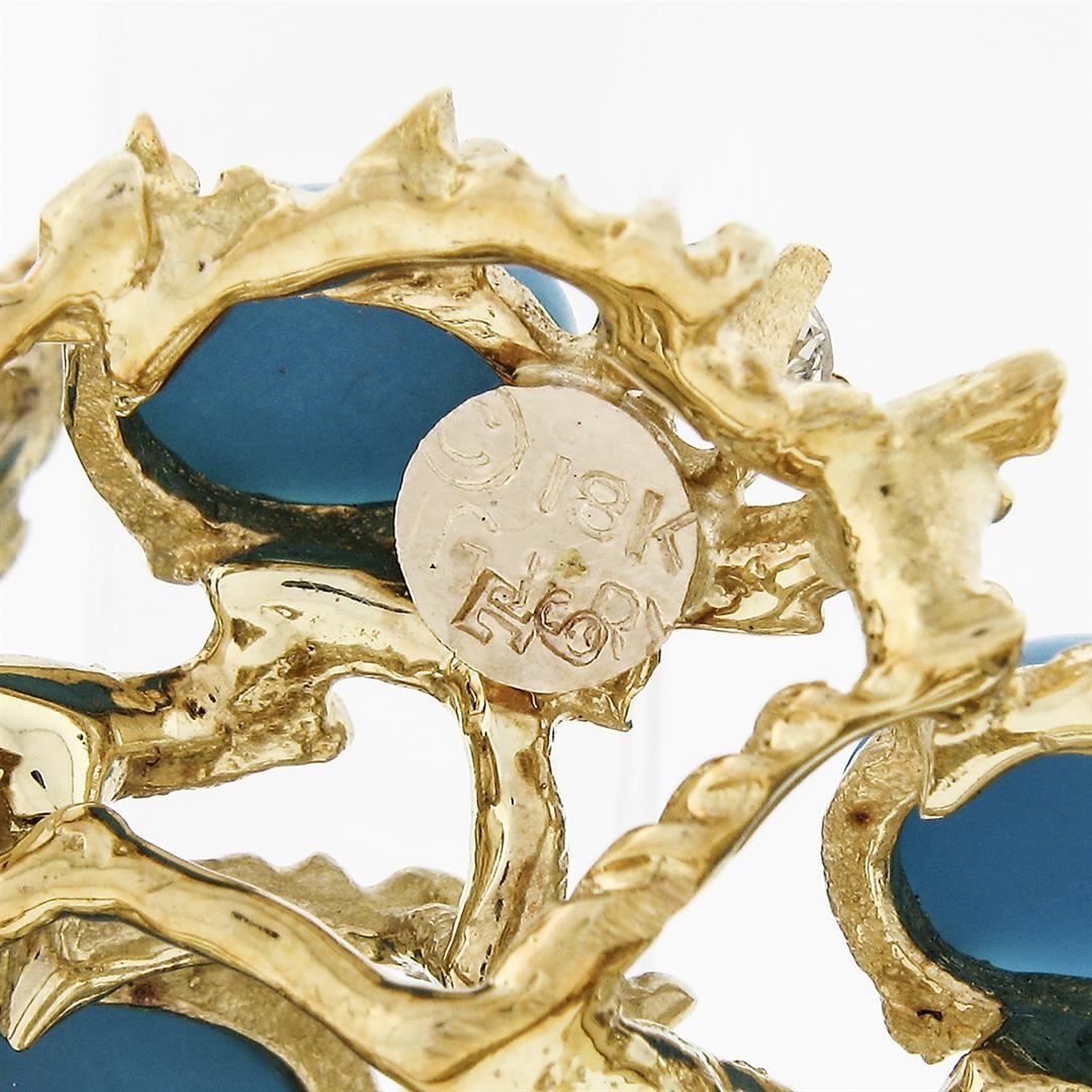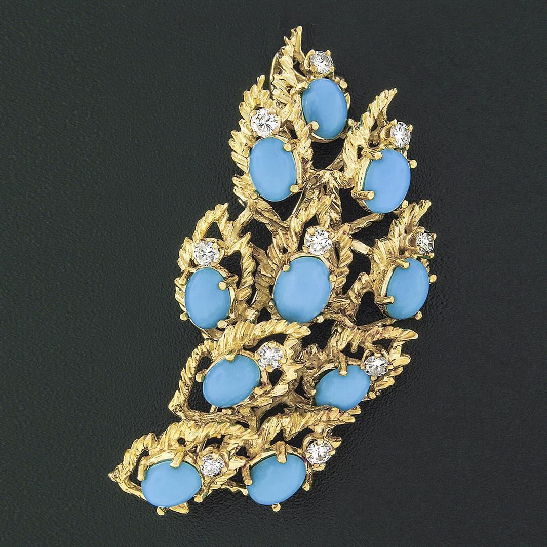 A vintage solid 18k yellow gold pendant brooch by Jack Gutschneider, with 10 round brilliant cut natural diamonds (G/H VVS2/VS1 ; 0.90ctw), and 10 oval cabochon cut natural turquoise (7.15x5.15mm). Measures 56.86x27.87mm and weighs a total of 20 grams.
