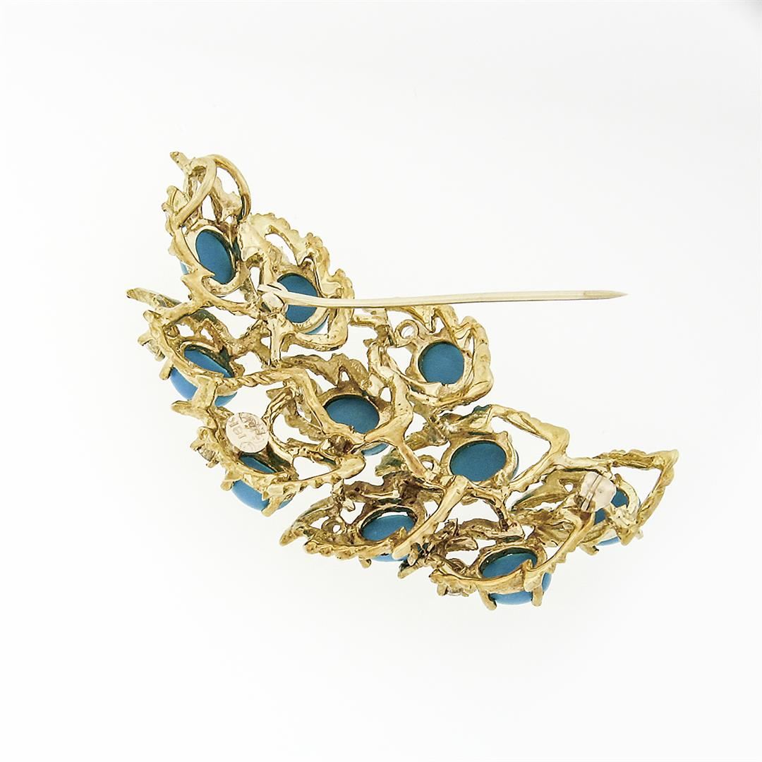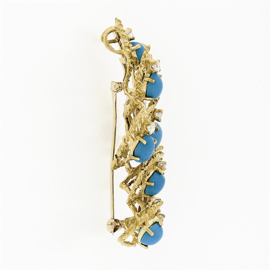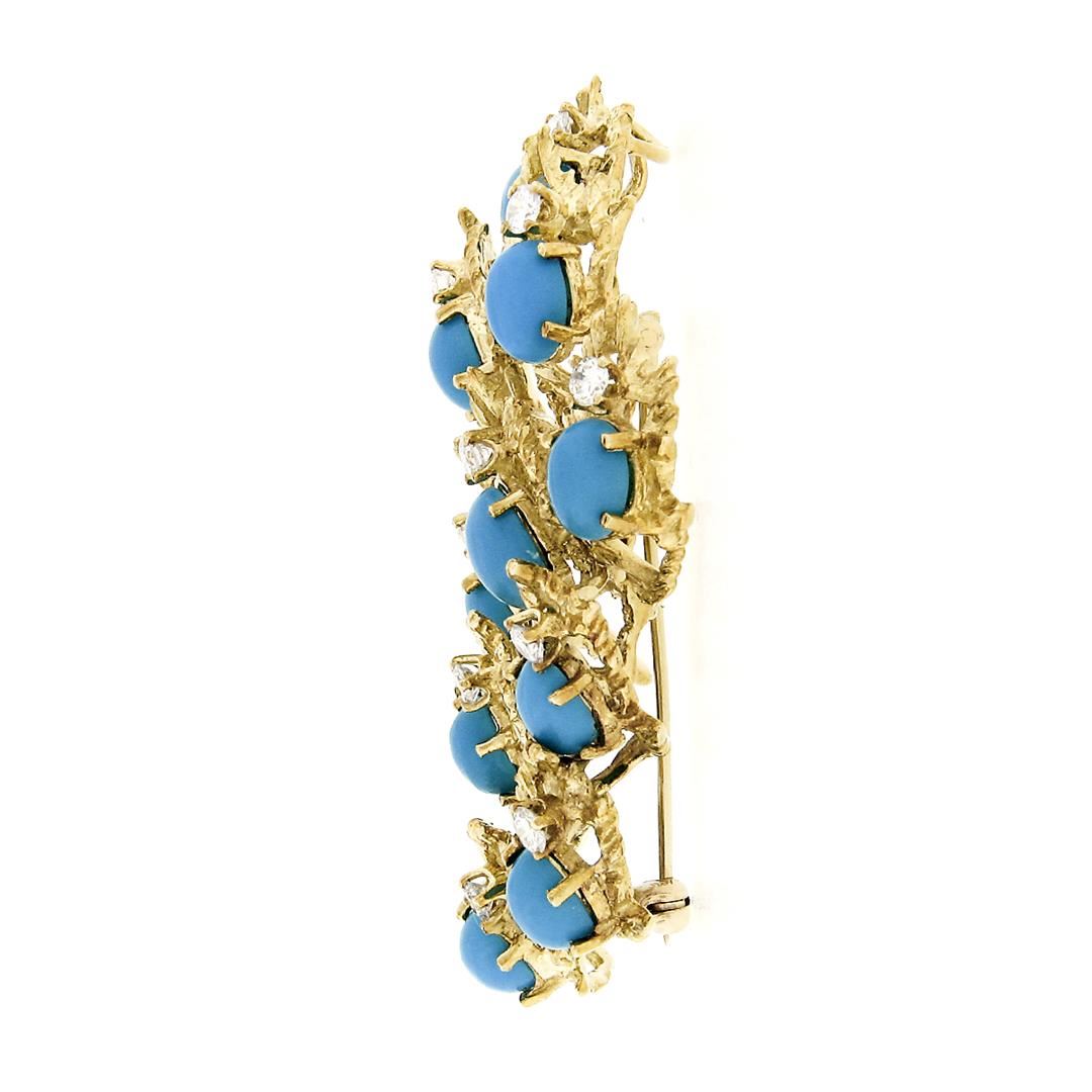 A vintage solid 18k yellow gold pendant brooch by Jack Gutschneider, with 10 round brilliant cut natural diamonds (G/H VVS2/VS1 ; 0.90ctw), and 10 oval cabochon cut natural turquoise (7.15x5.15mm). Measures 56.86x27.87mm and weighs a total of 20 grams.