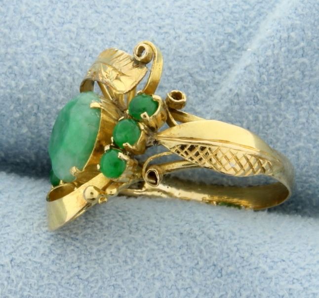 This ring is 18K yellow gold and contains a 7.5mm jade center stone surrounded by four 2.5mm round cabochon emeralds. Size 4 1/2 3.1g