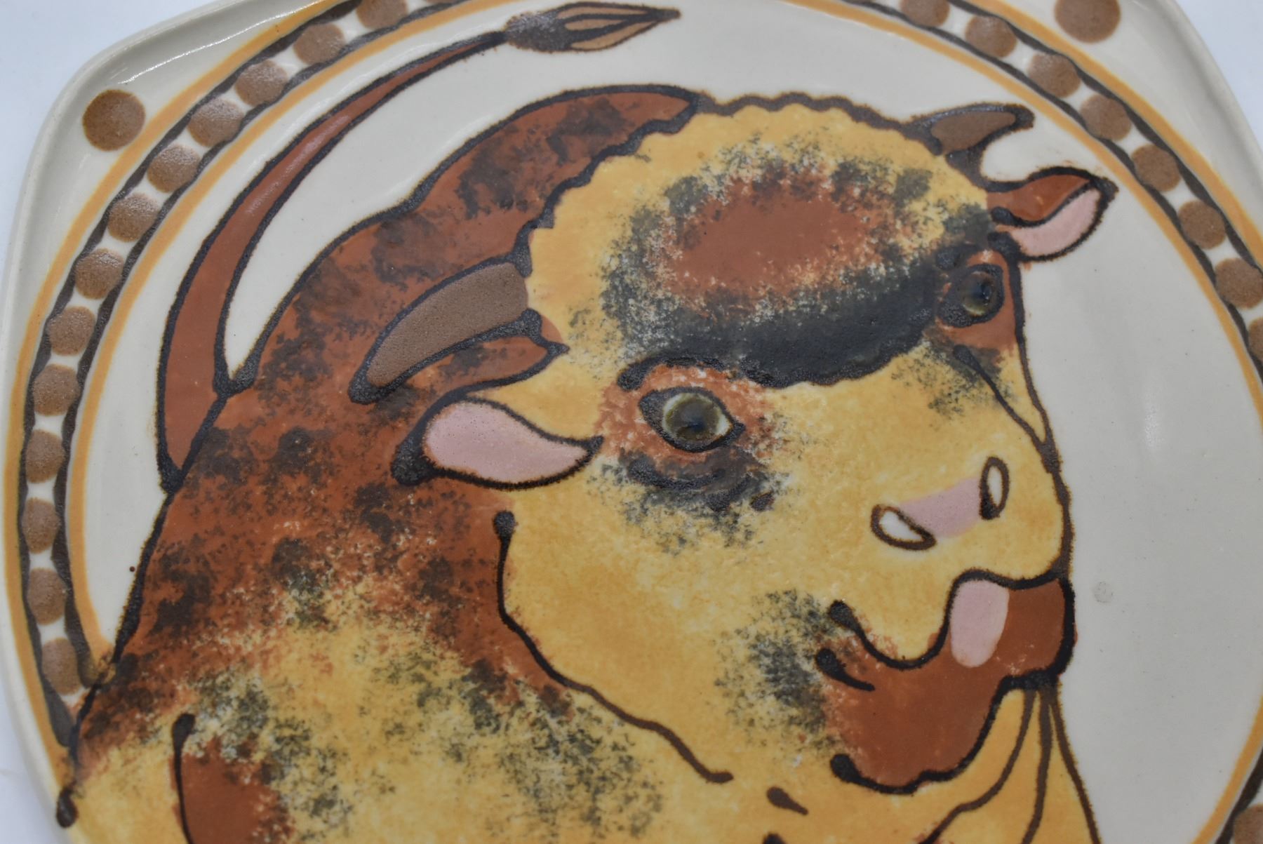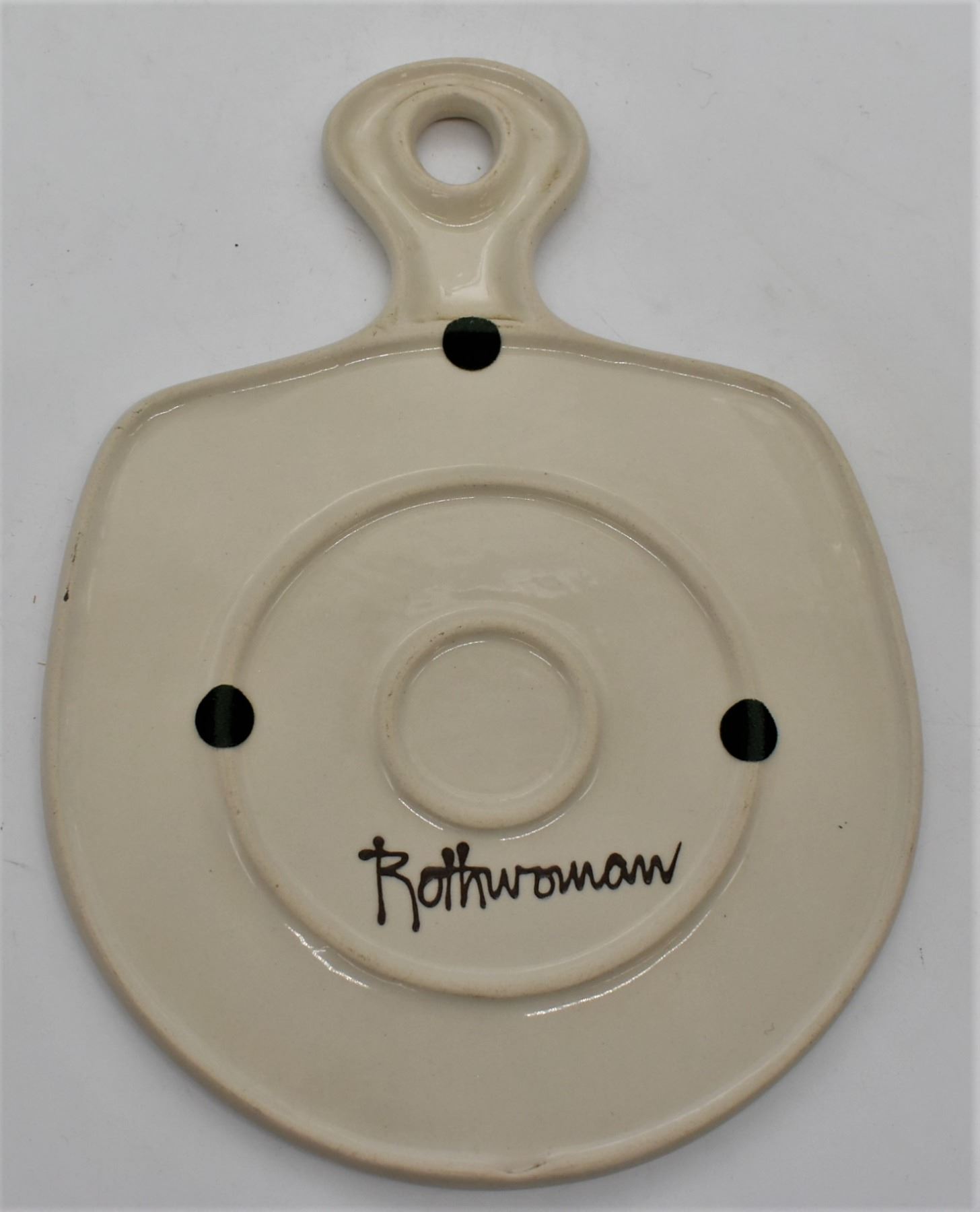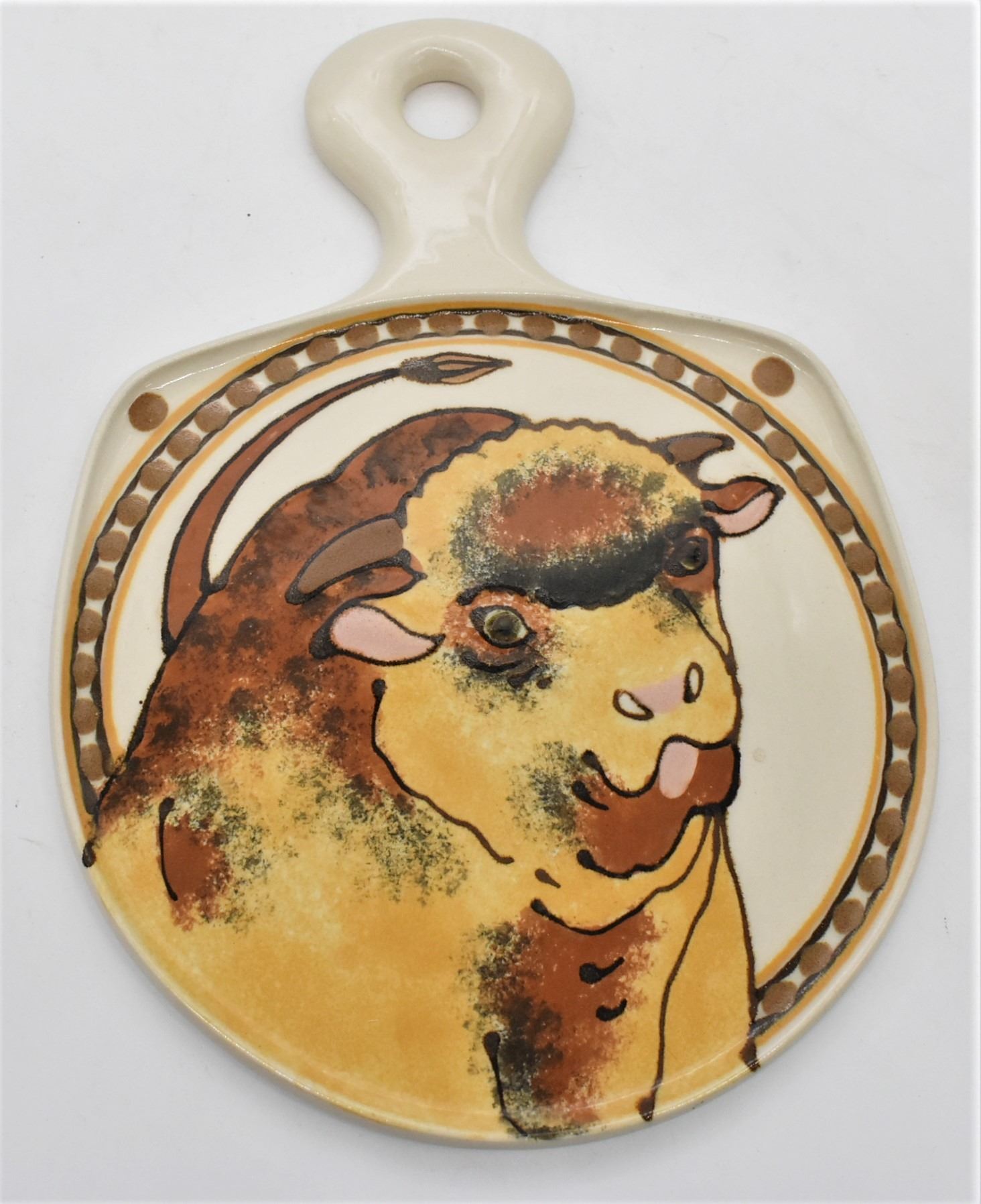 Vintage Janet Rothwoman Ceramic Pottery Trivet, bull motif, measures 8.5'' x 12'' and is signed on the back, could also be used as a cheese tray, FYI: ''Janet Rothwoman was born in village of Lyme Regis, Dorset, England. Initially trained as an architect, Rothwoman began her career in ceramics in 1971 in California. She was an early figure in the California Craft Movement. Her wares were sold in shops throughout the US and proved very popular in the giftware market.''