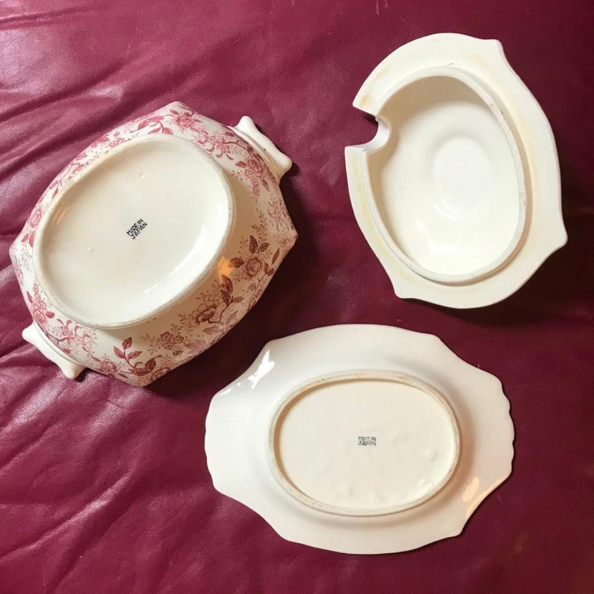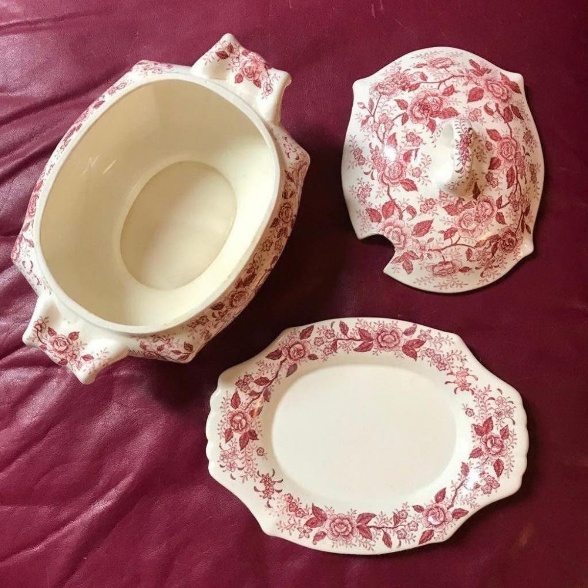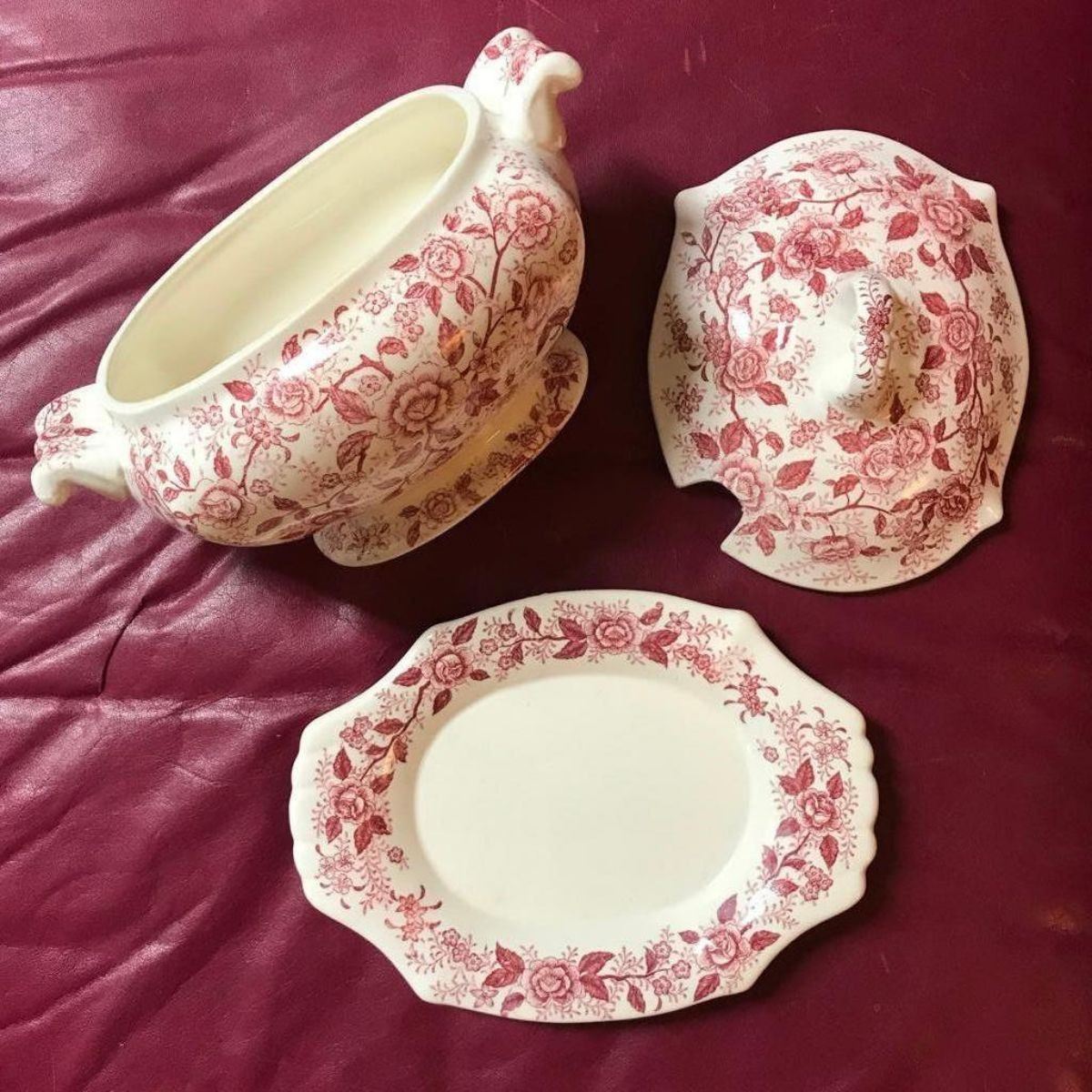 Vintage red transferware, vines & roses pattern, 3-piece soup or vegetable tureen. Bowl & lid with saucer.  Made in Japan stamped on bottom of saucer & tureen bowl. No ladle. 7" H X 7" W X 10" L toureen. 7" W X 10" L platter.