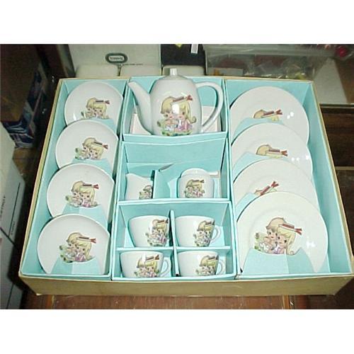 Made in Japan.17 pc. Includes 4 4-1/2" plates, 4 3-3/8" saucers, 4 1-7/8" cups, creamer, sugar & lid, teapot & lid. Mint in box